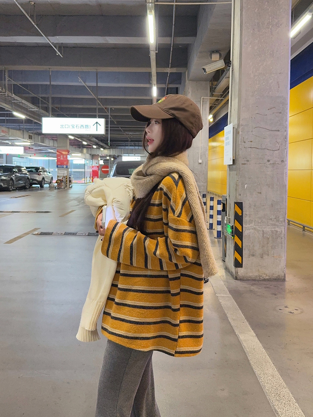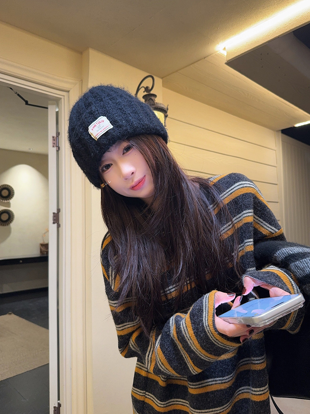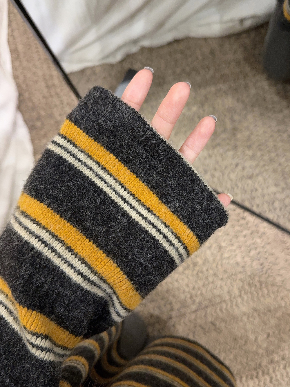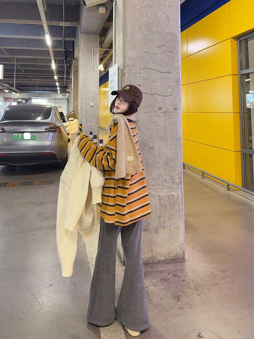 慵嬾風撞色條紋圓領長袖毛衣女裝冬季寬鬆針織衫百搭chic打底上衣