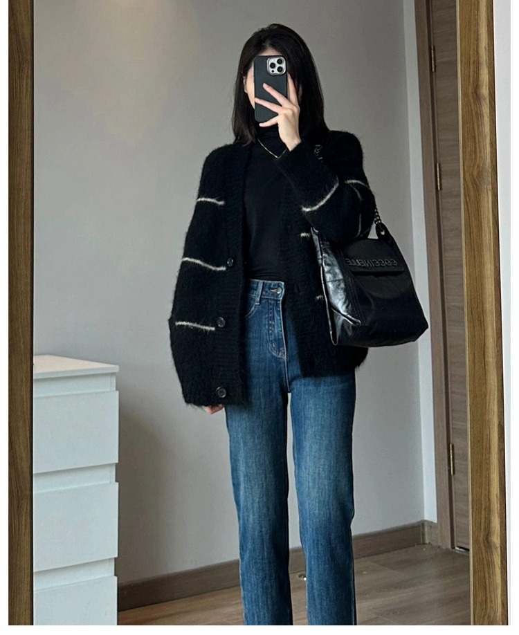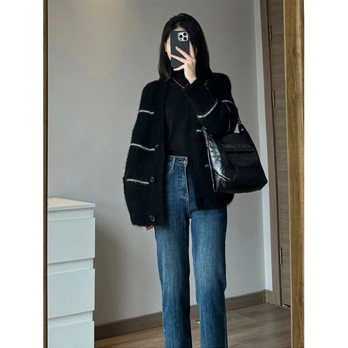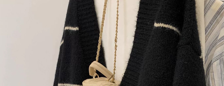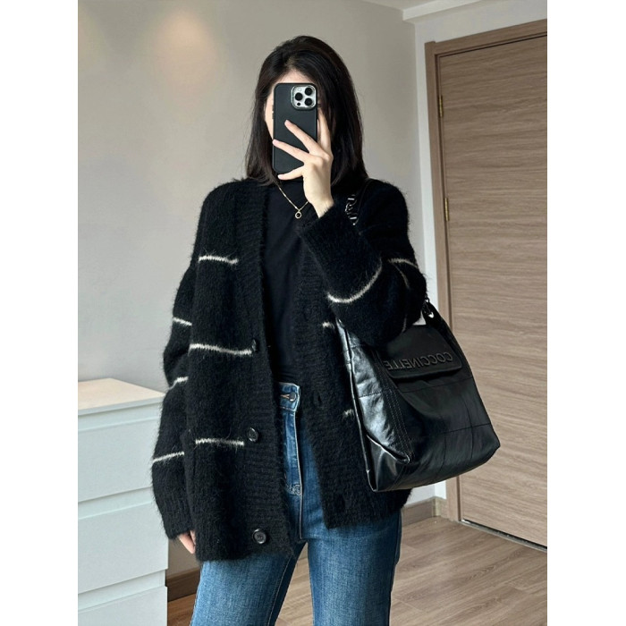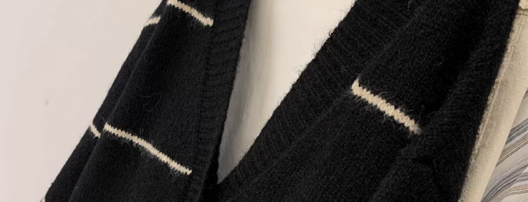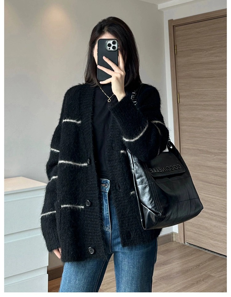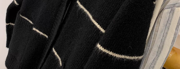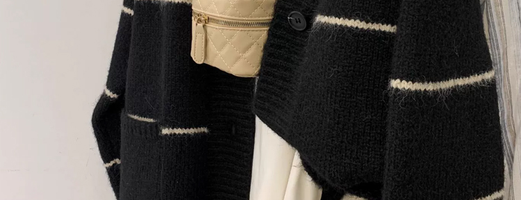 條紋黑色毛衣外套女秋冬寬松慵懶風中長款加厚氣質針織開衫上衣