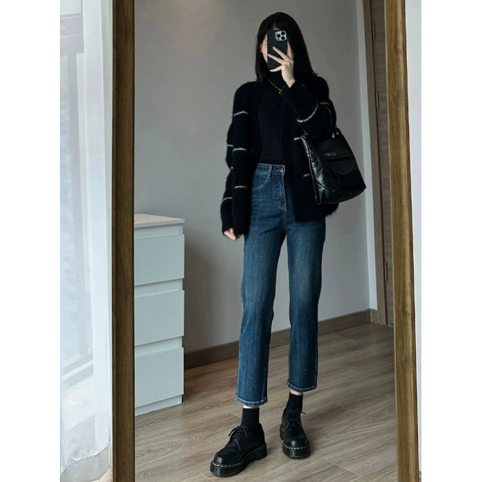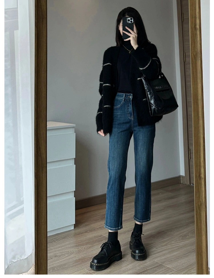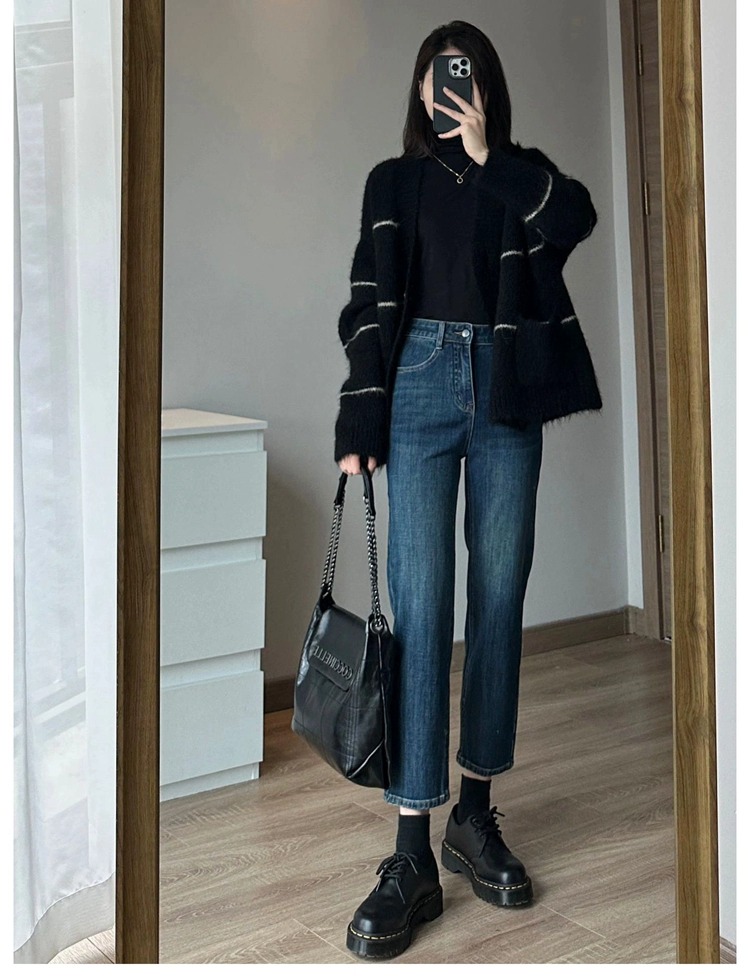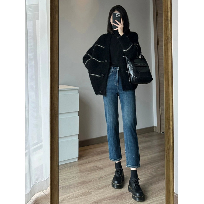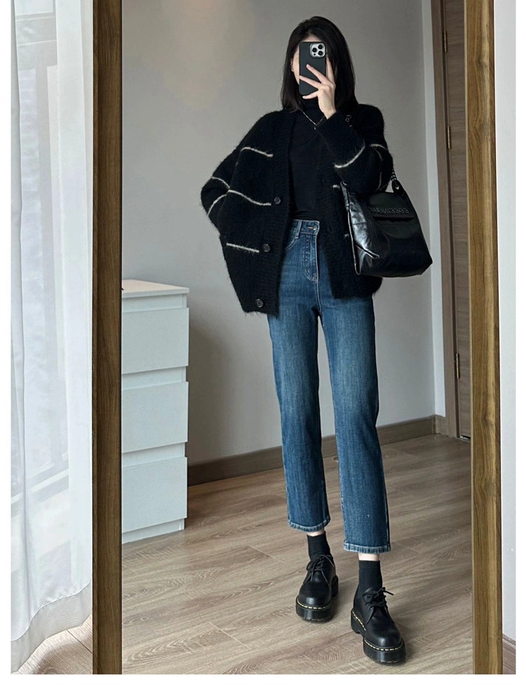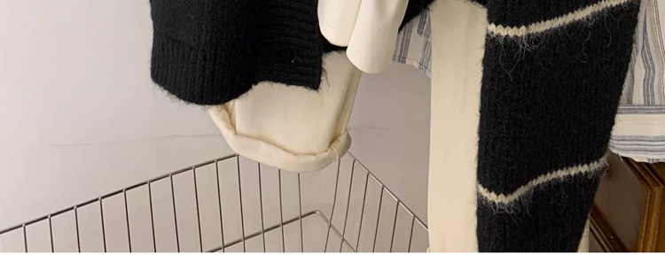 條紋黑色毛衣外套女秋冬寬松慵懶風中長款加厚氣質針織開衫上衣