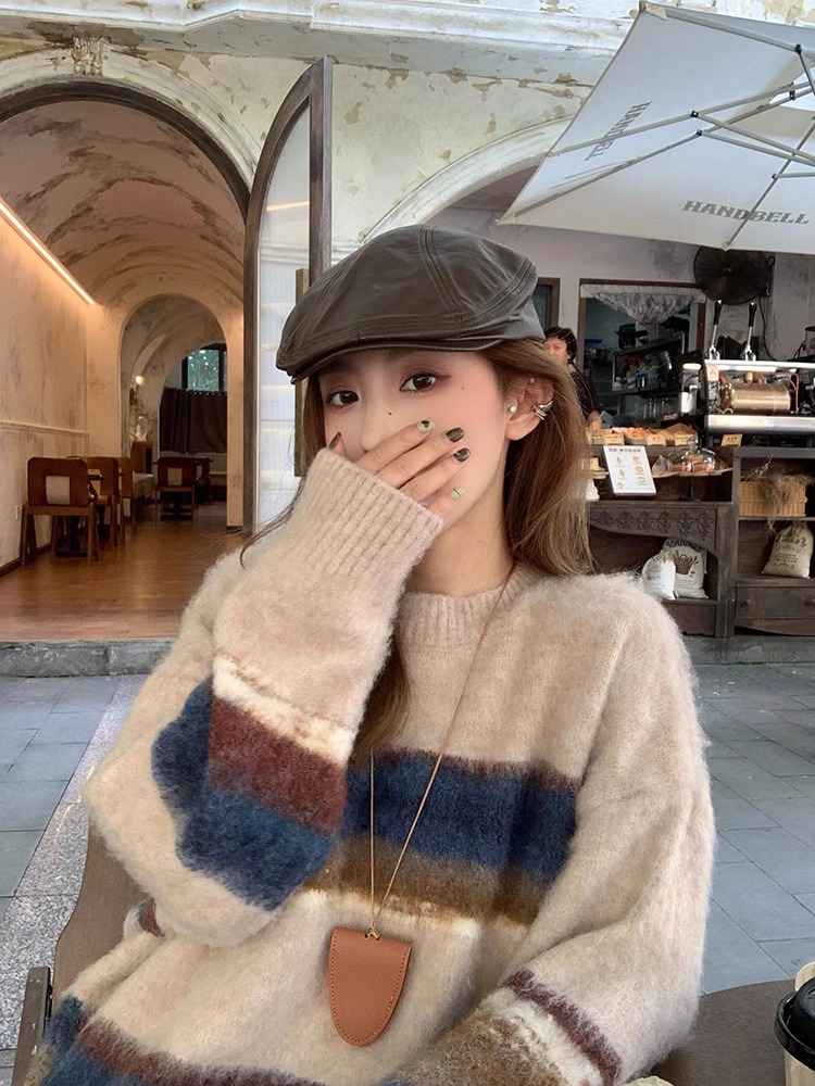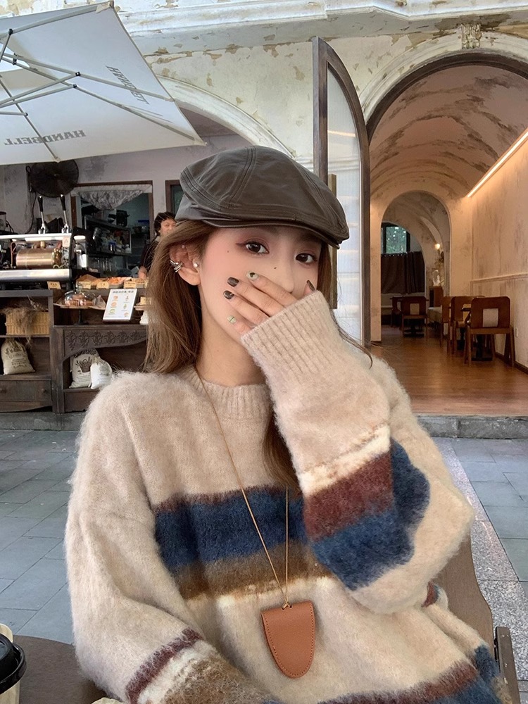 復古撞色條紋毛衣女秋冬季加厚外穿軟糯慵懶高級感寬松針織衫上衣