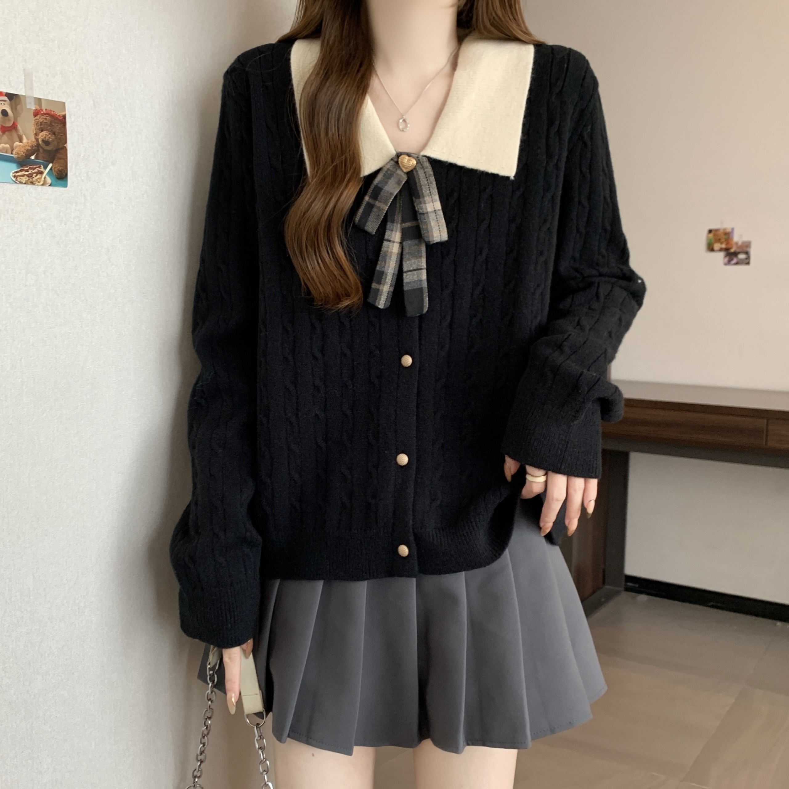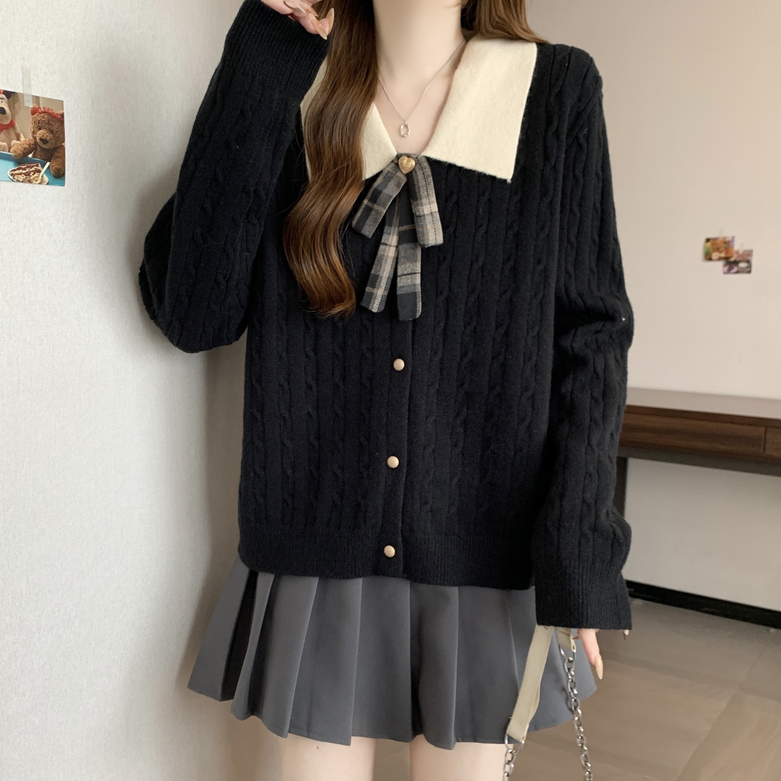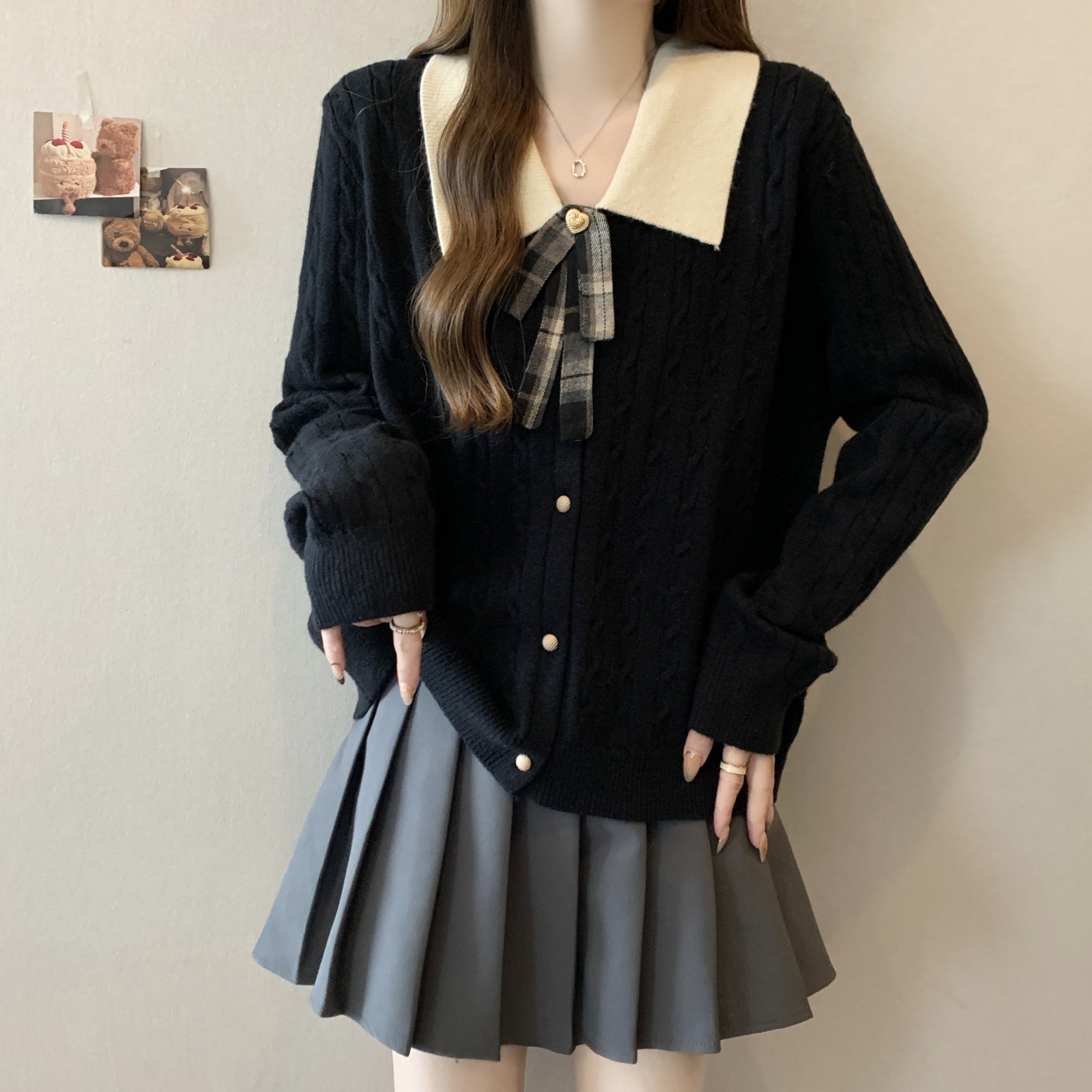大碼胖mm秋冬新款翻領學院風針織衫蝴蝶結撞色毛衣寬松減齡上衣女