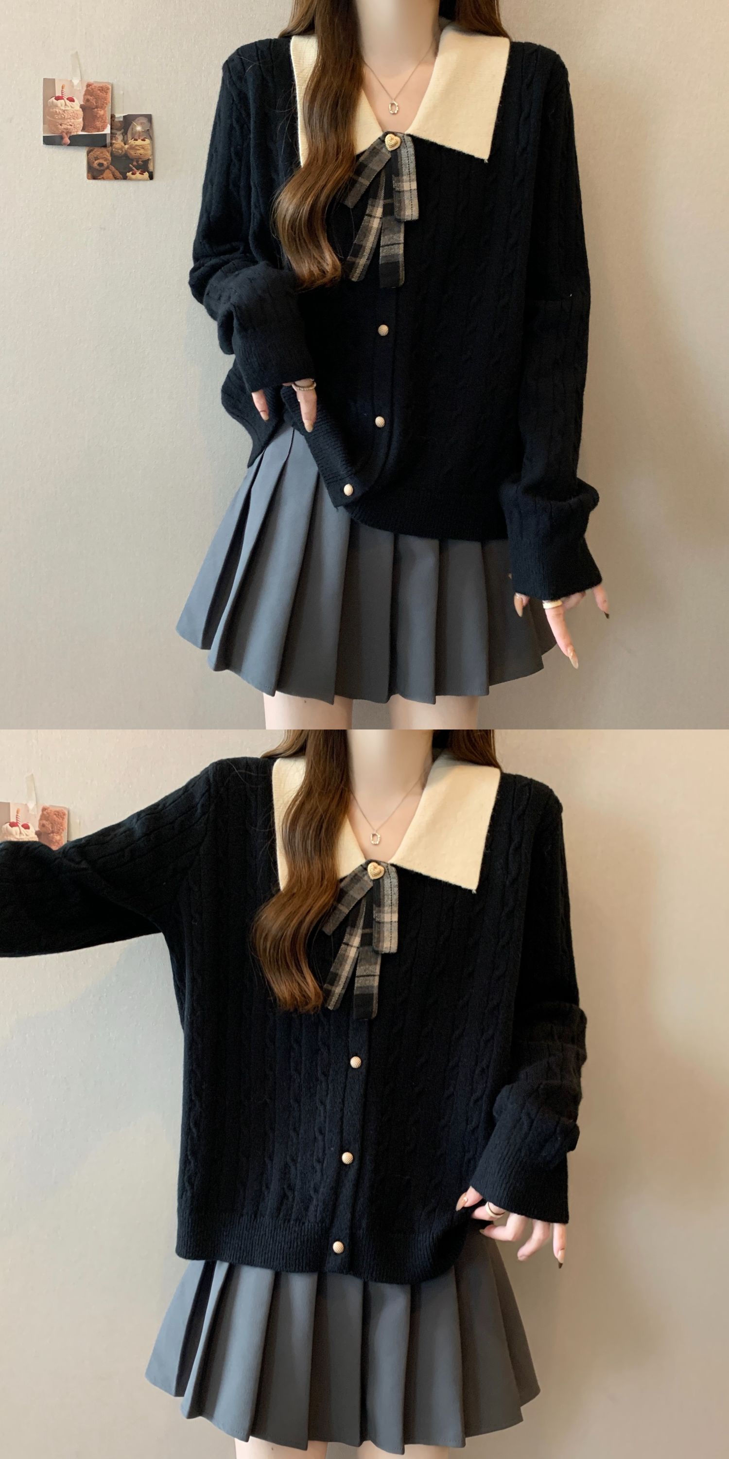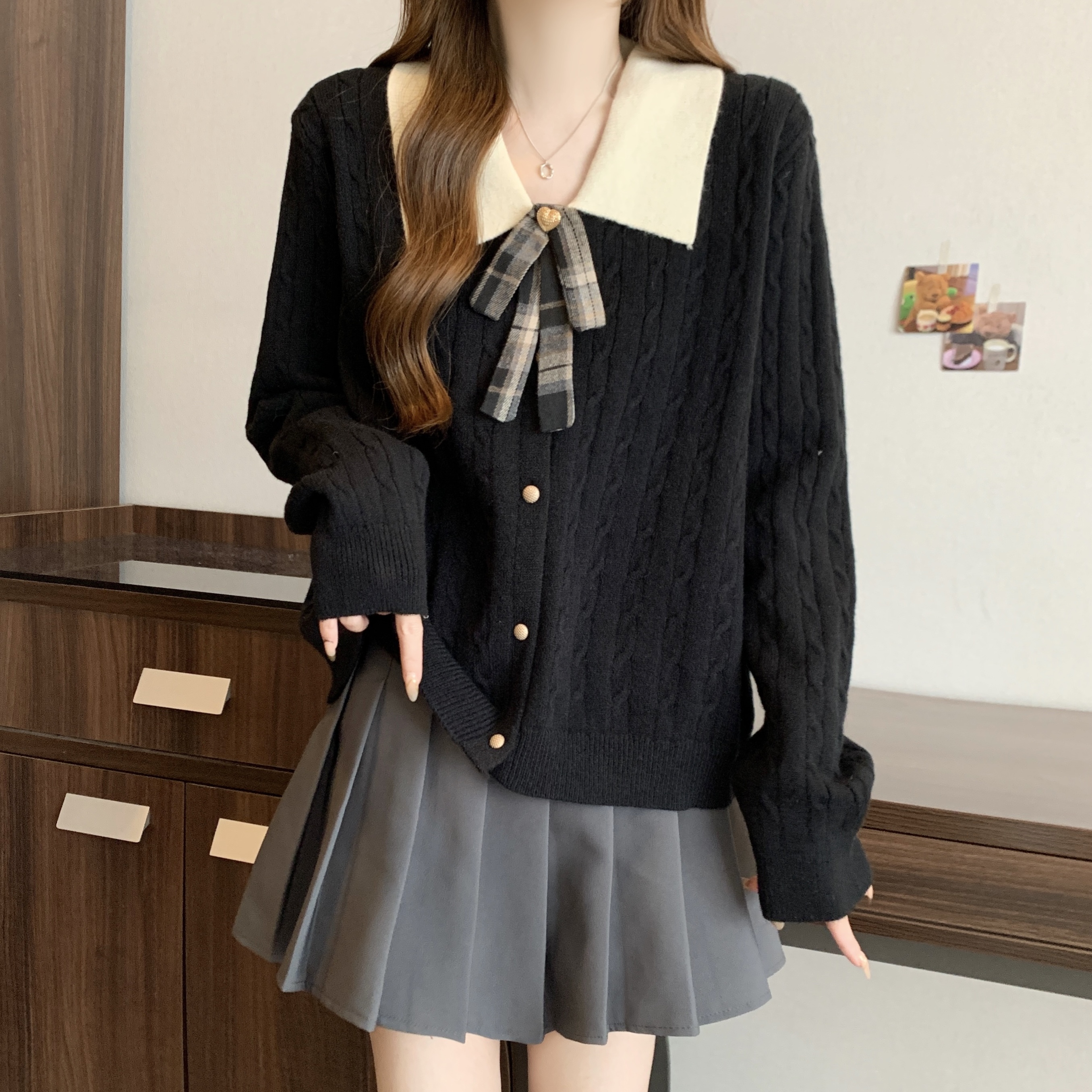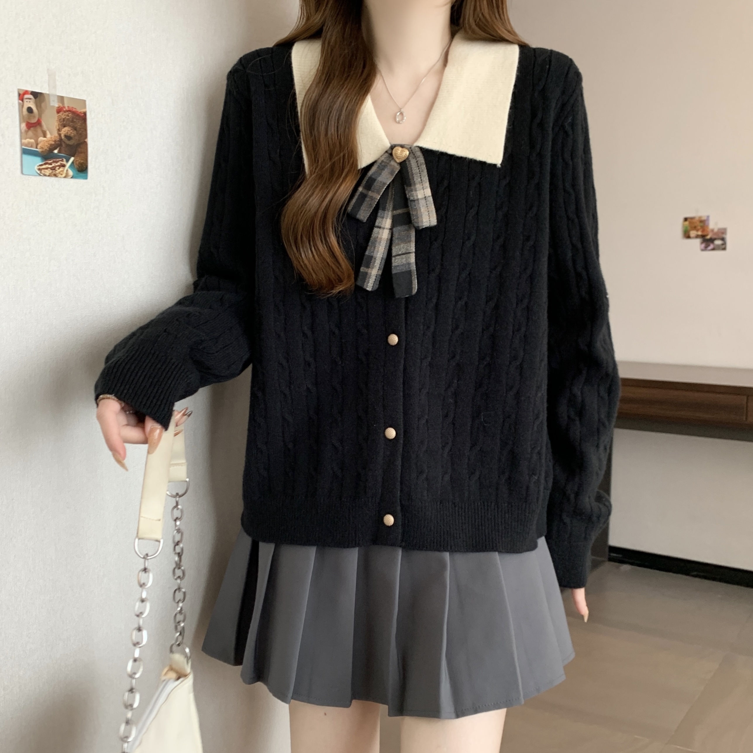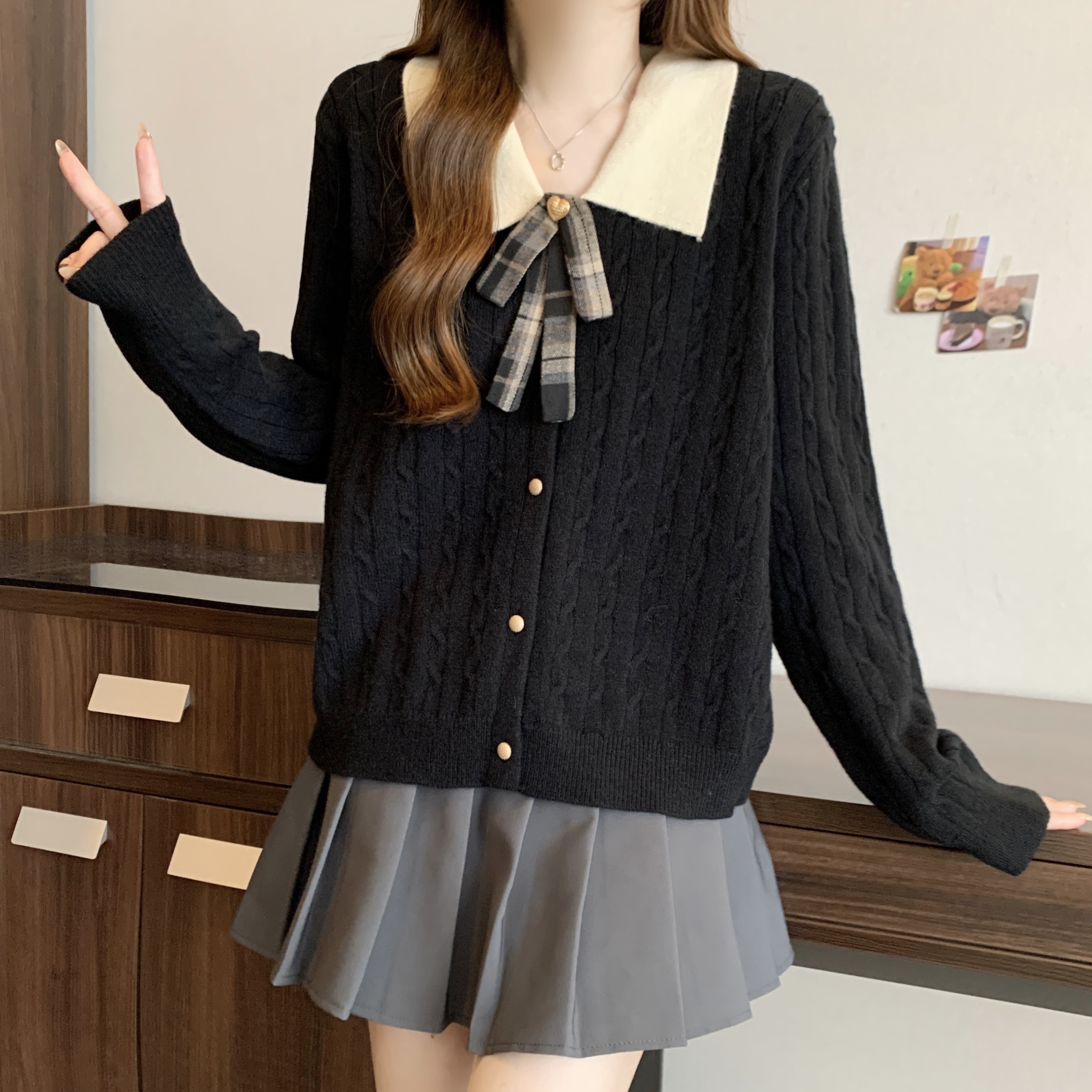 大碼胖mm秋冬新款翻領學院風針織衫蝴蝶結撞色毛衣寬松減齡上衣女