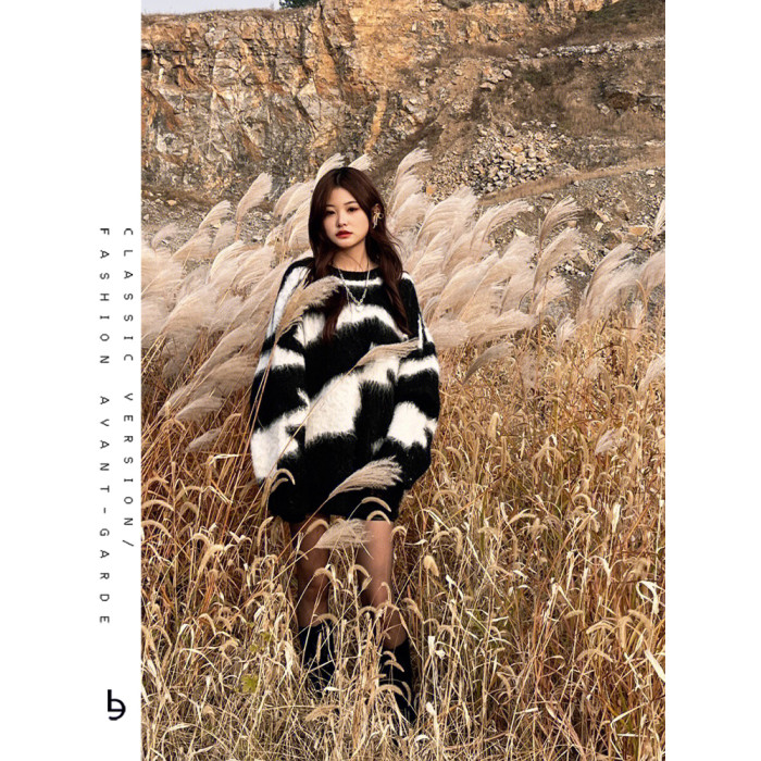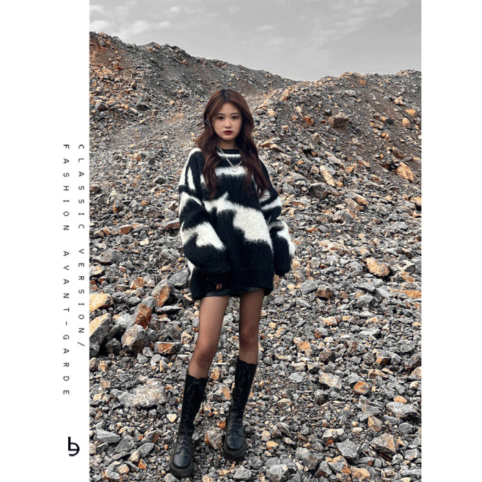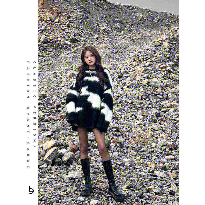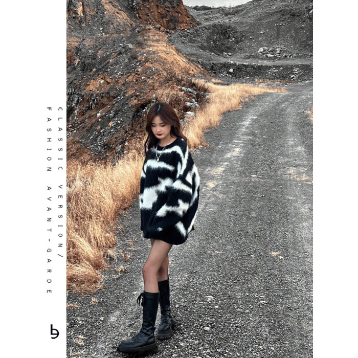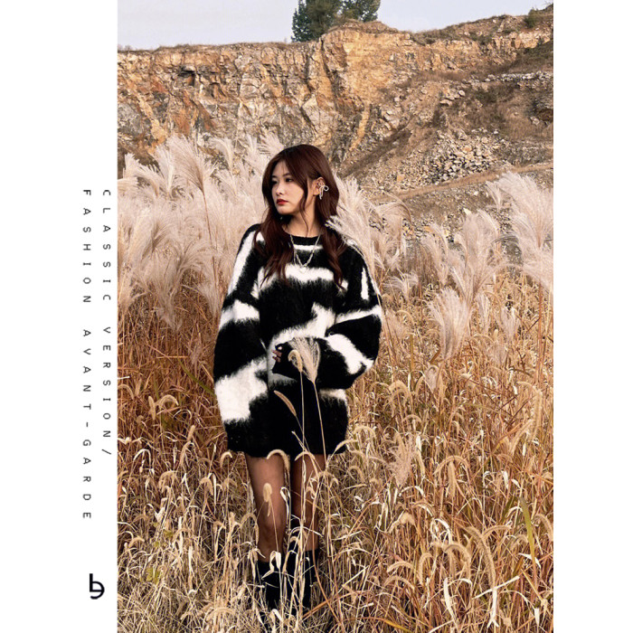 日系慵懶風不規則條紋寬松水貂毛衣高級感oversize甜颯風針織衫潮