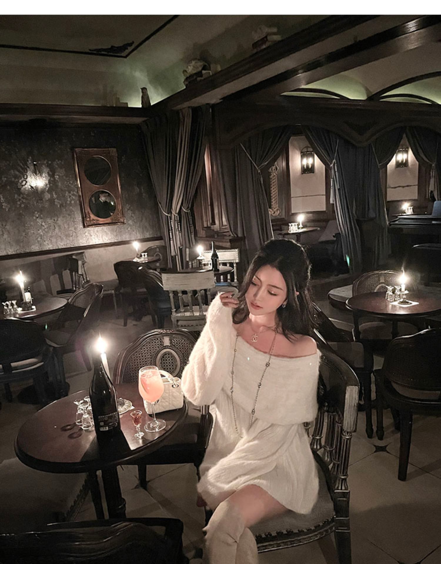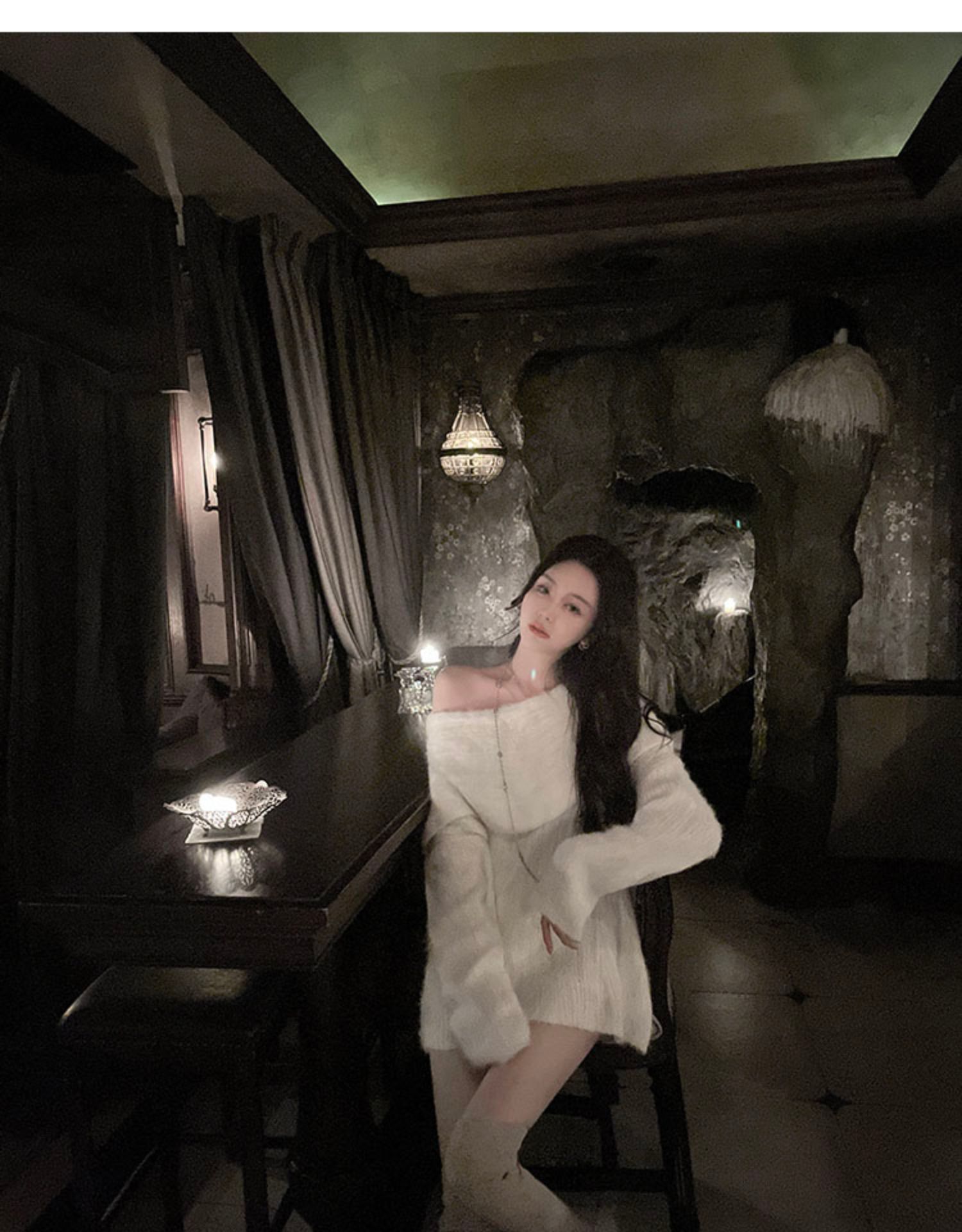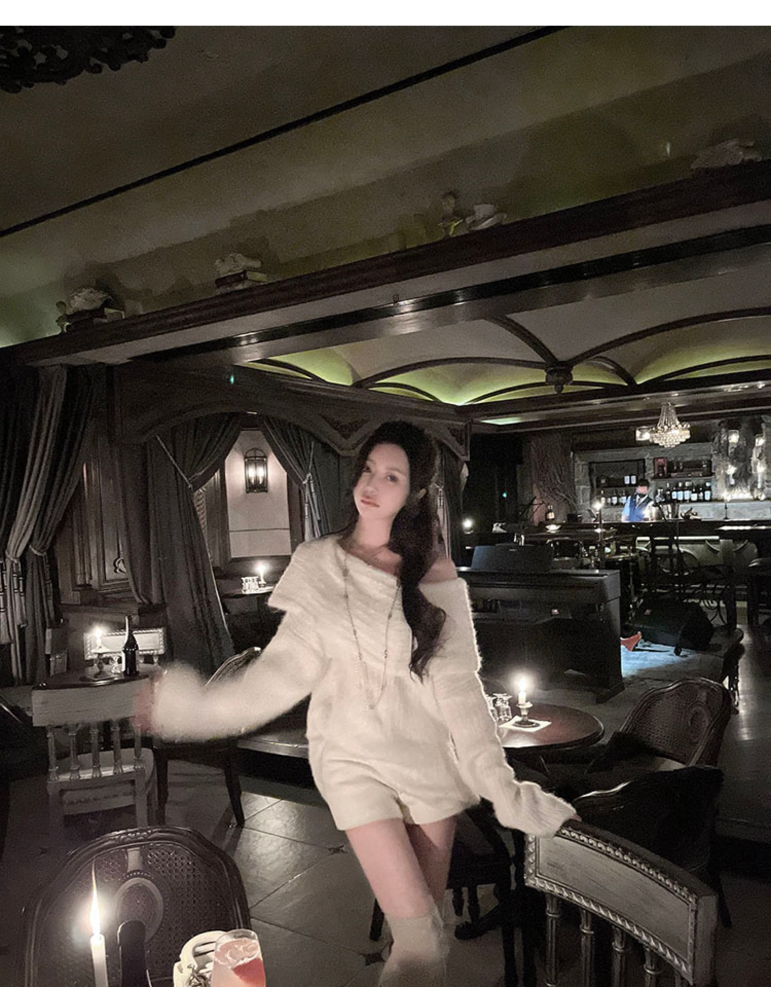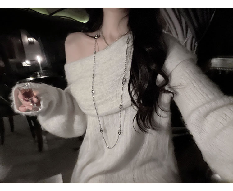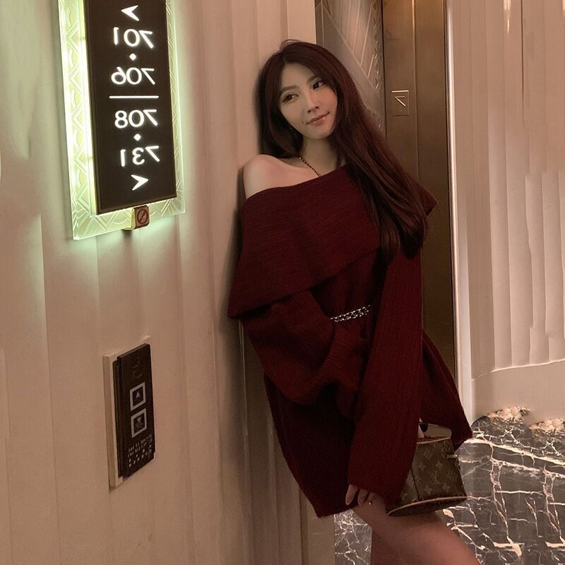 聖誕氛圍感穿搭露肩上衣一字肩長款大毛衣秋冬女慵懶風高級感寬松