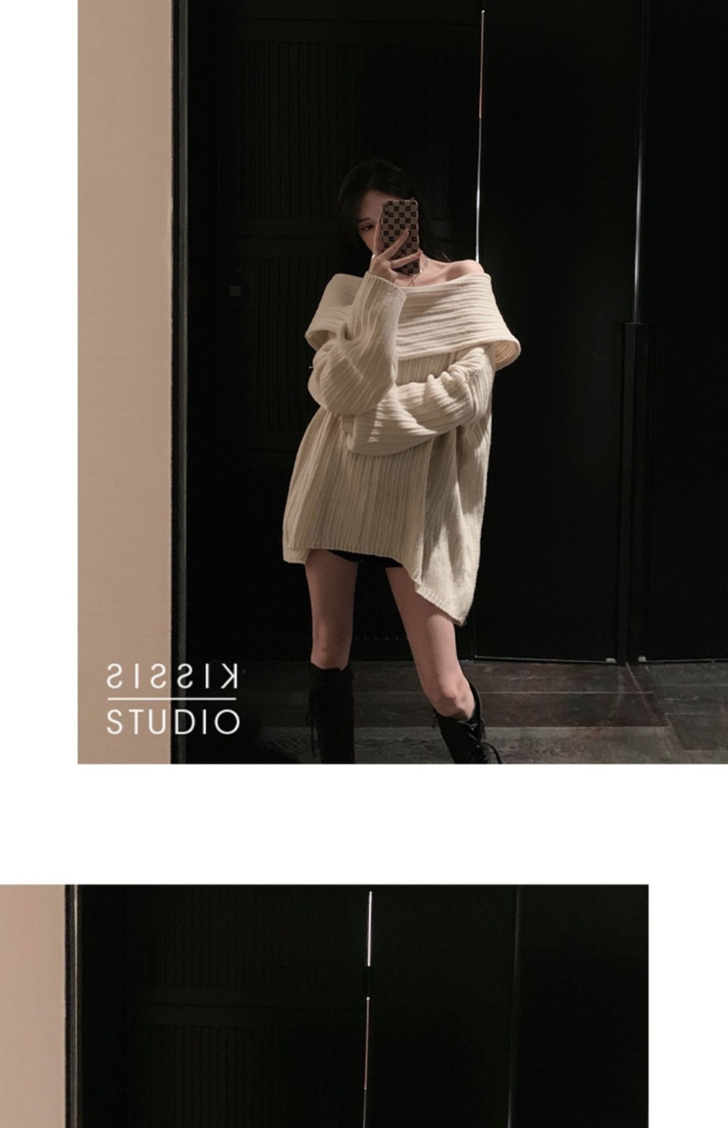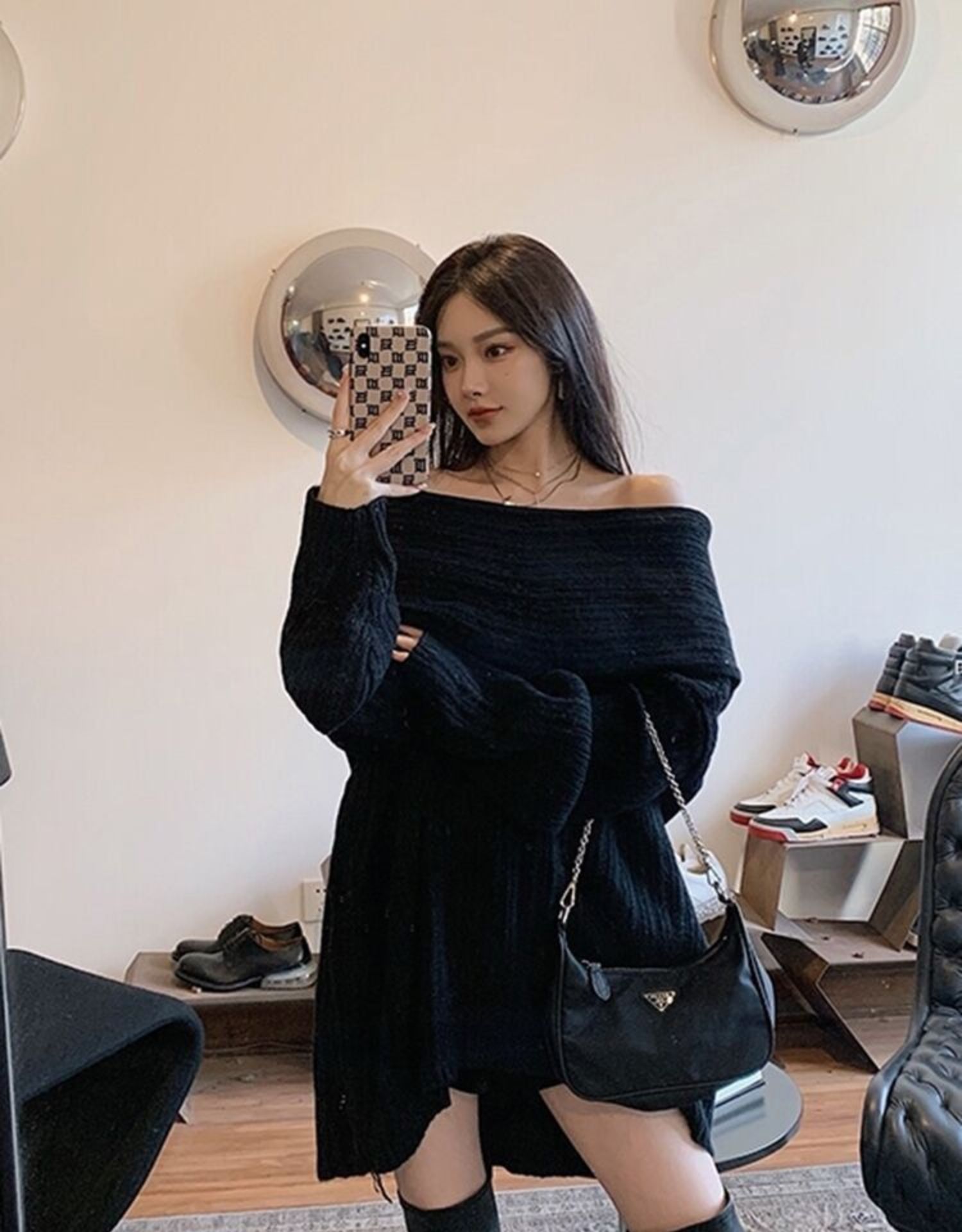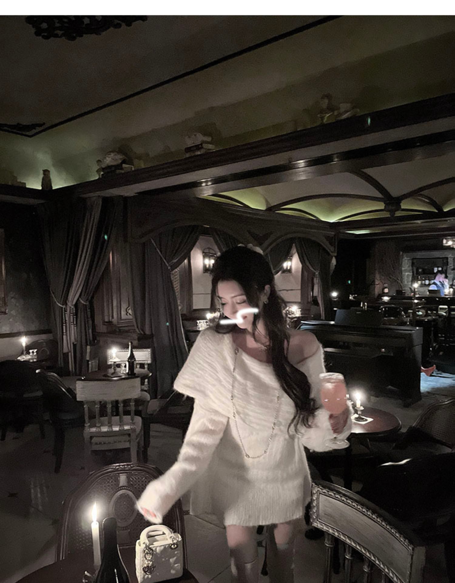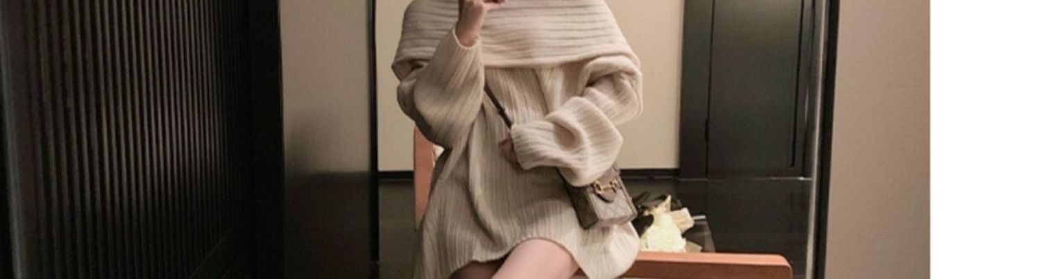 聖誕氛圍感穿搭露肩上衣一字肩長款大毛衣秋冬女慵懶風高級感寬松