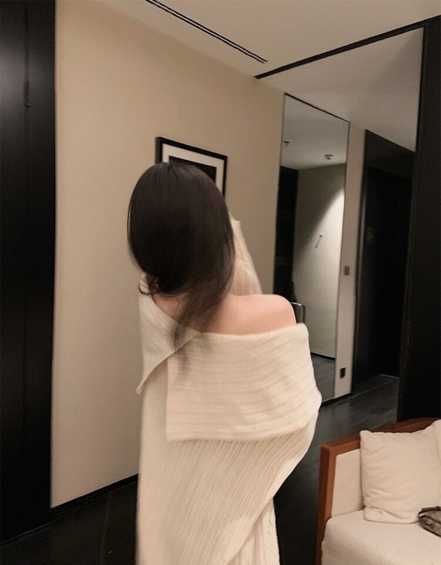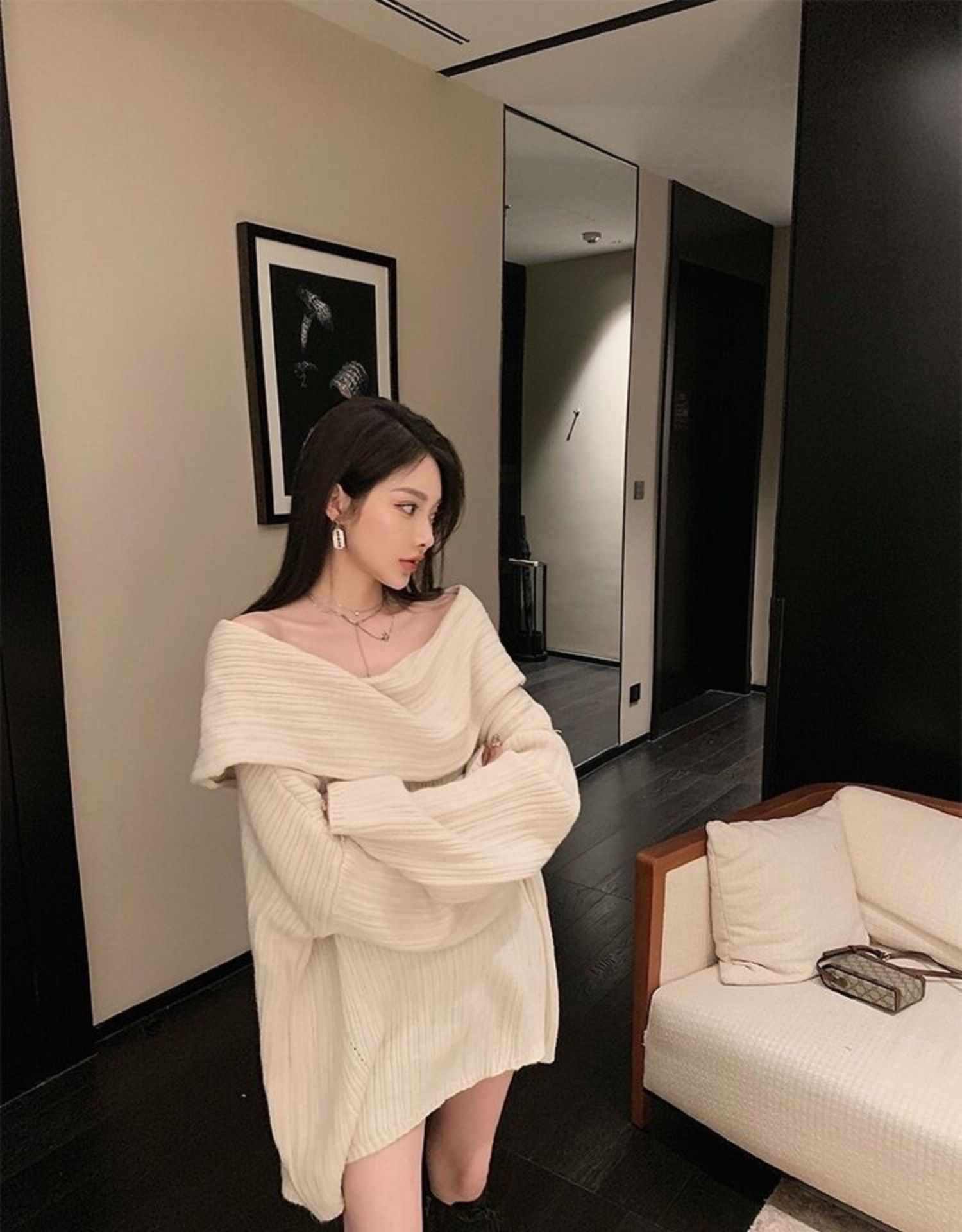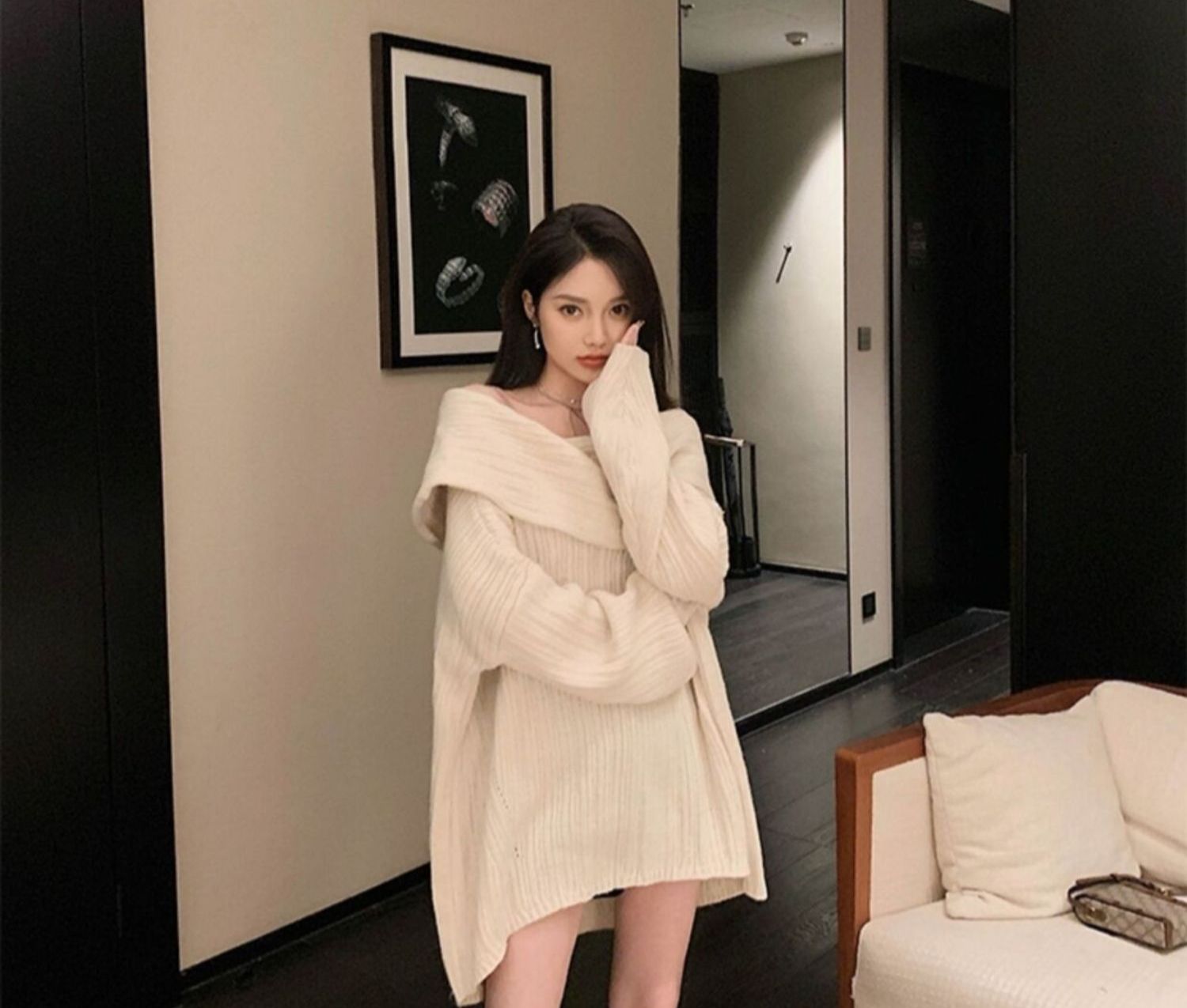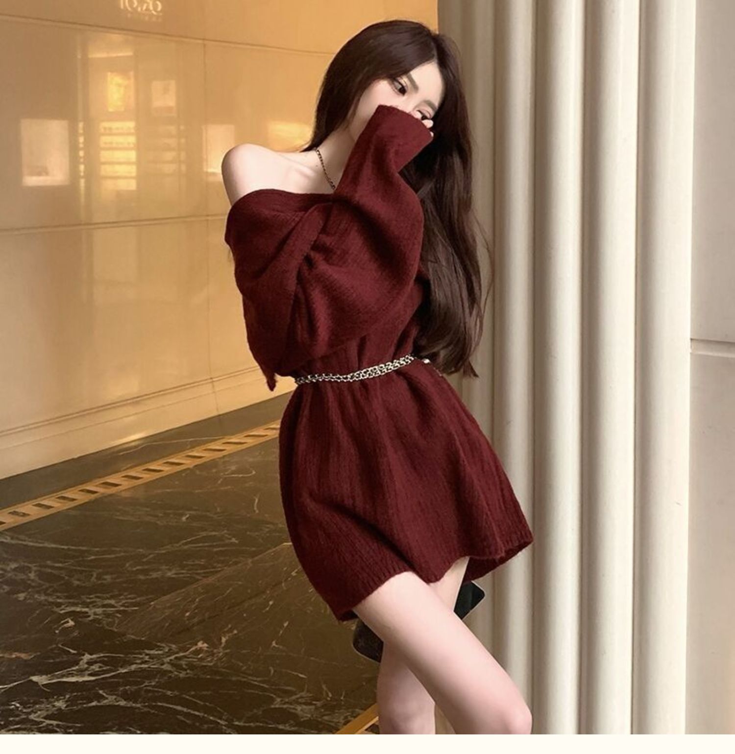聖誕氛圍感穿搭露肩上衣一字肩長款大毛衣秋冬女慵懶風高級感寬松