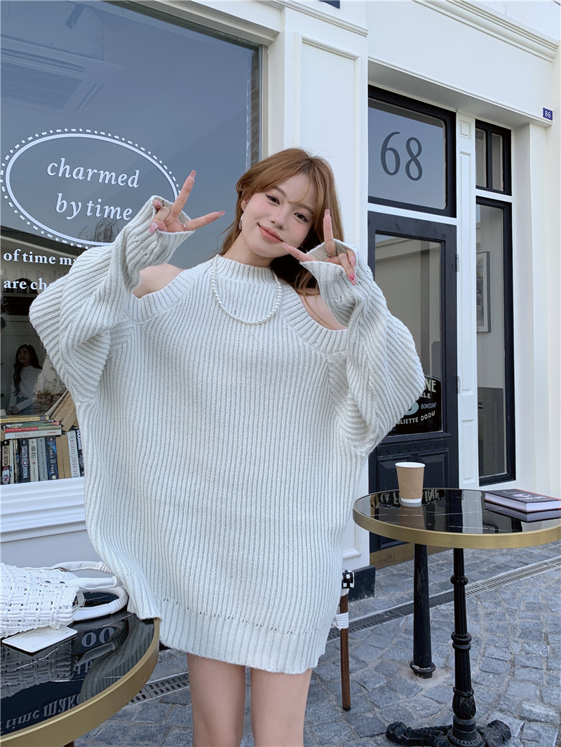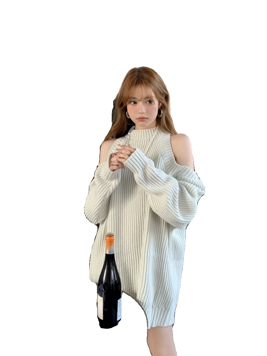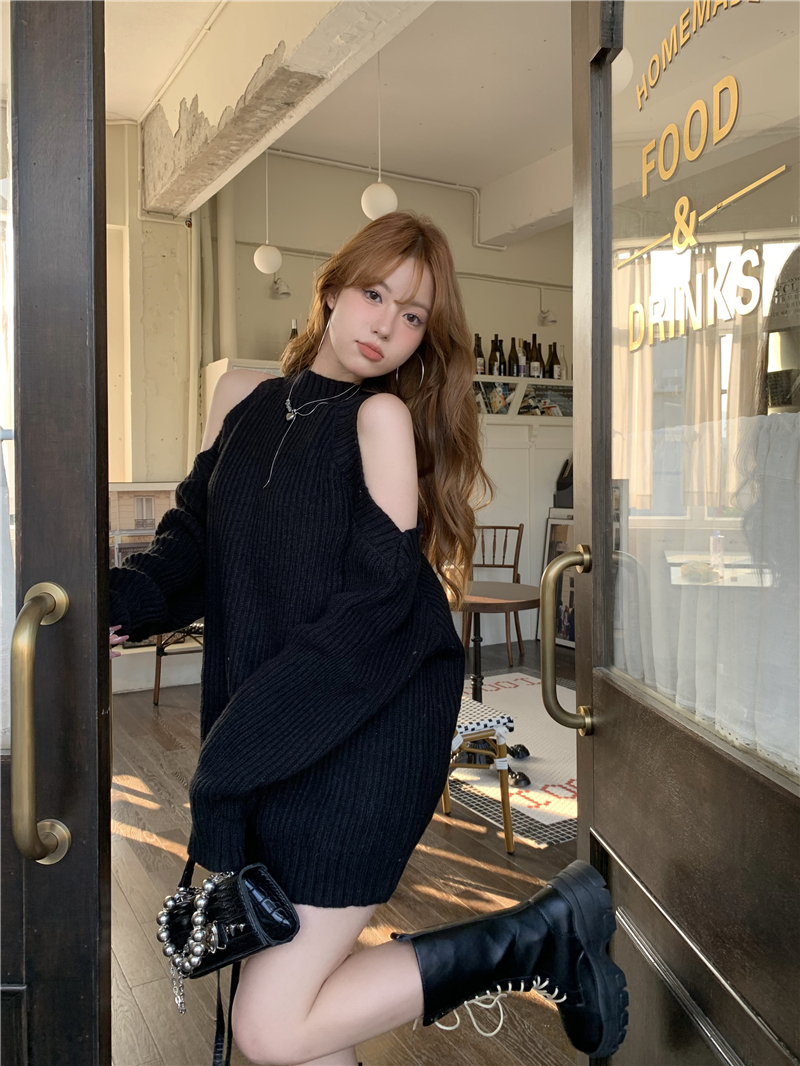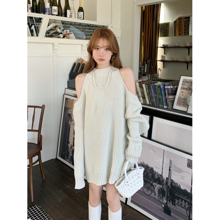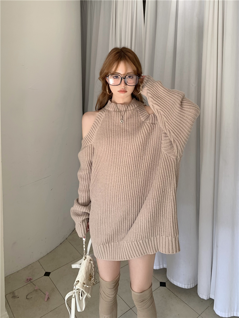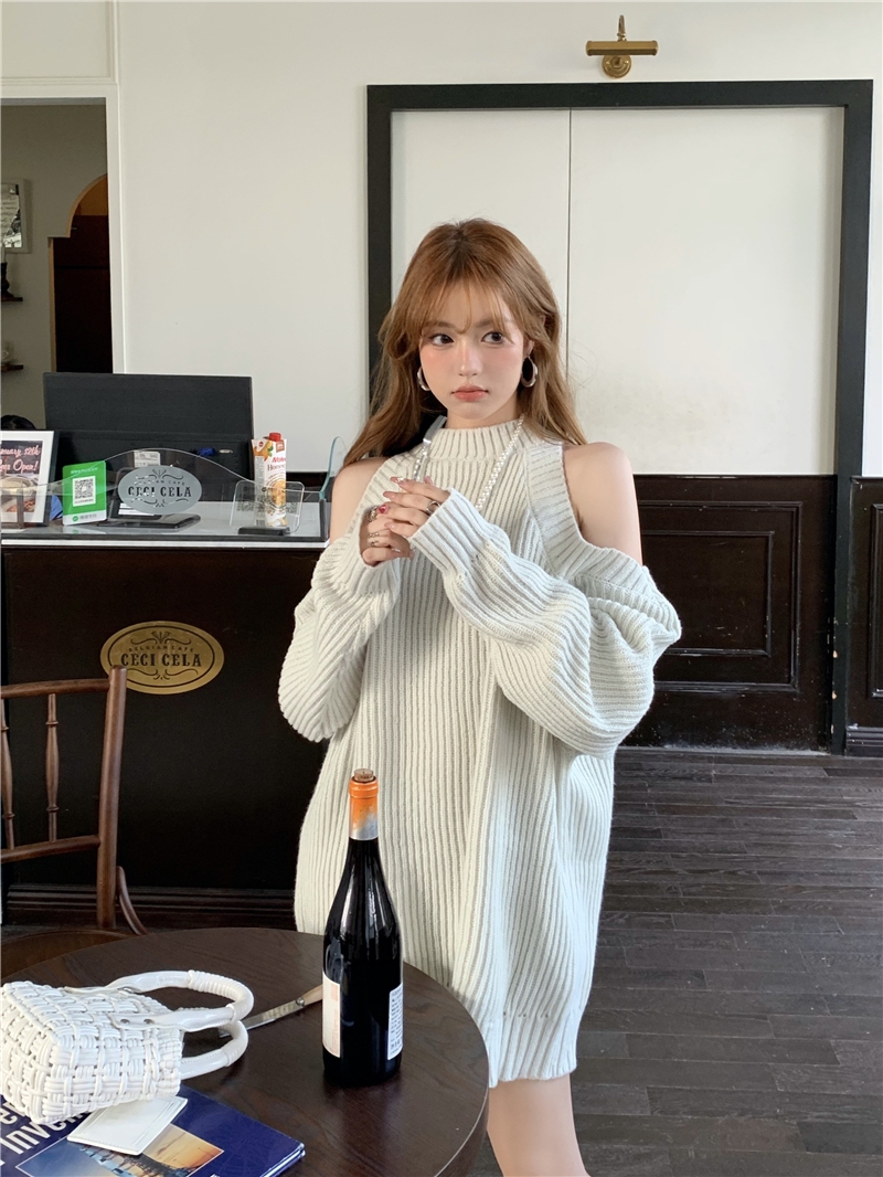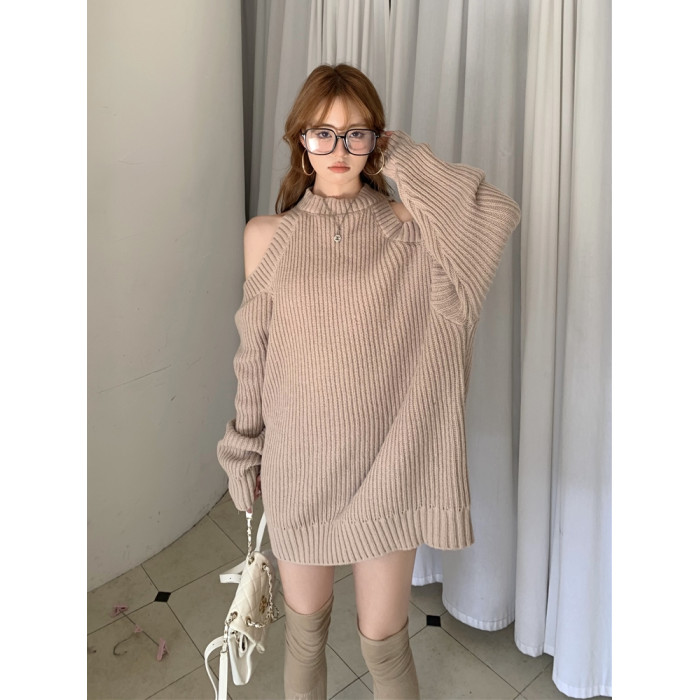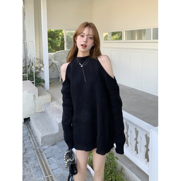 純欲辣妹慵懶風露肩毛衣女秋冬法式寬松掛脖小心機中長款針織上衣