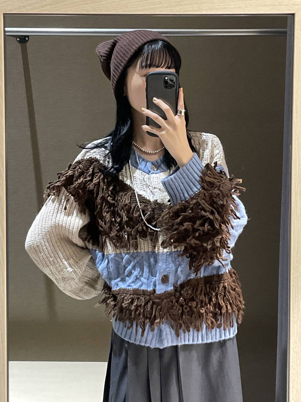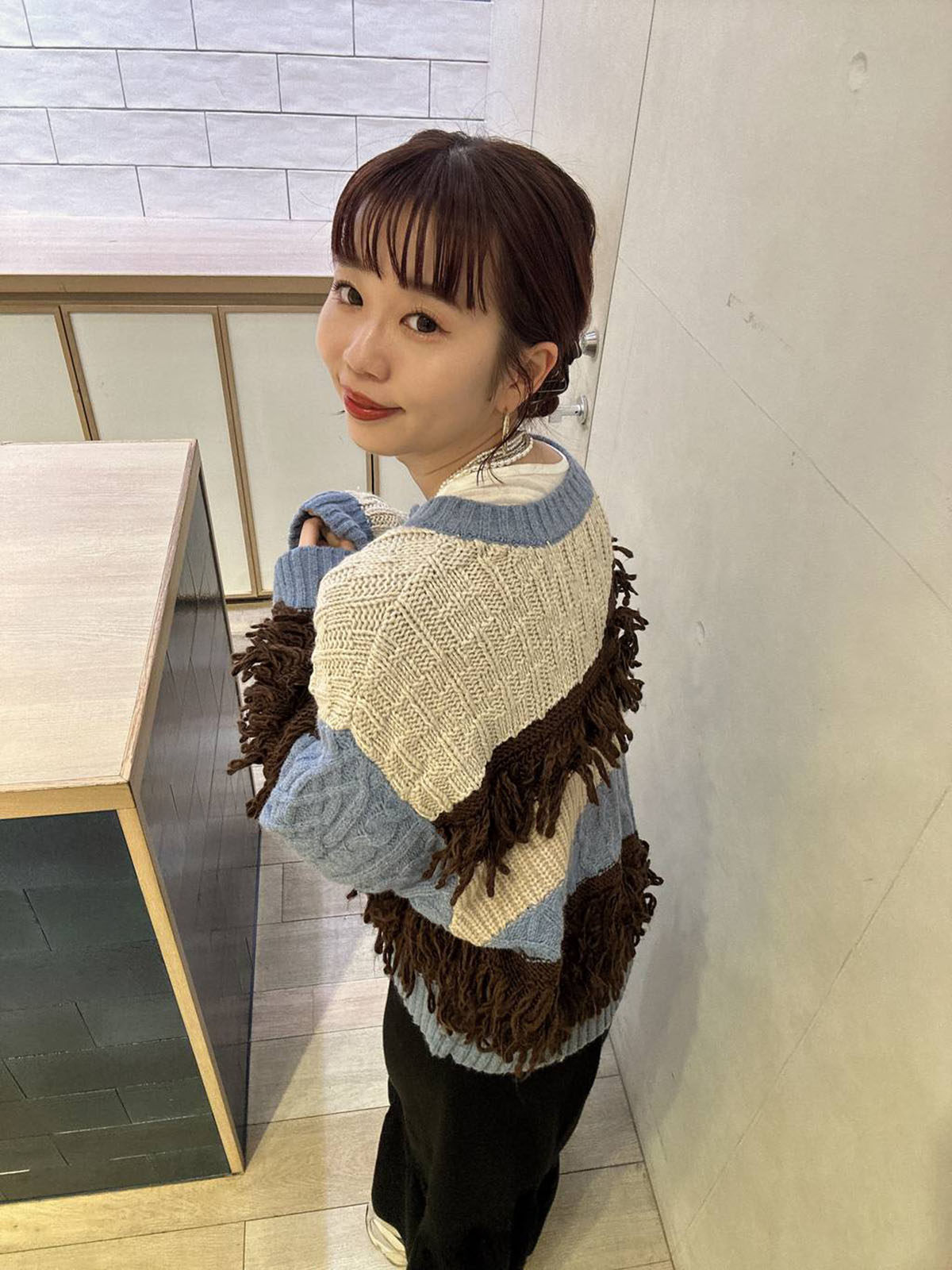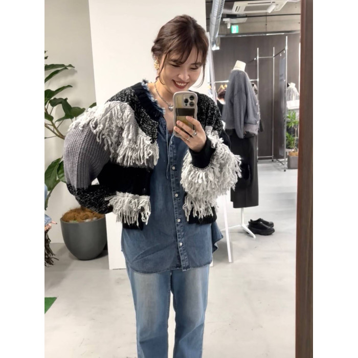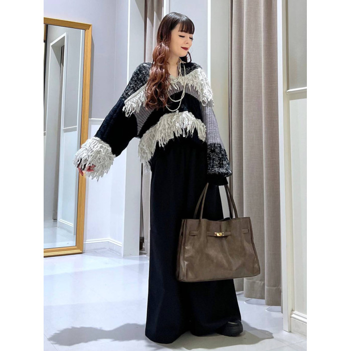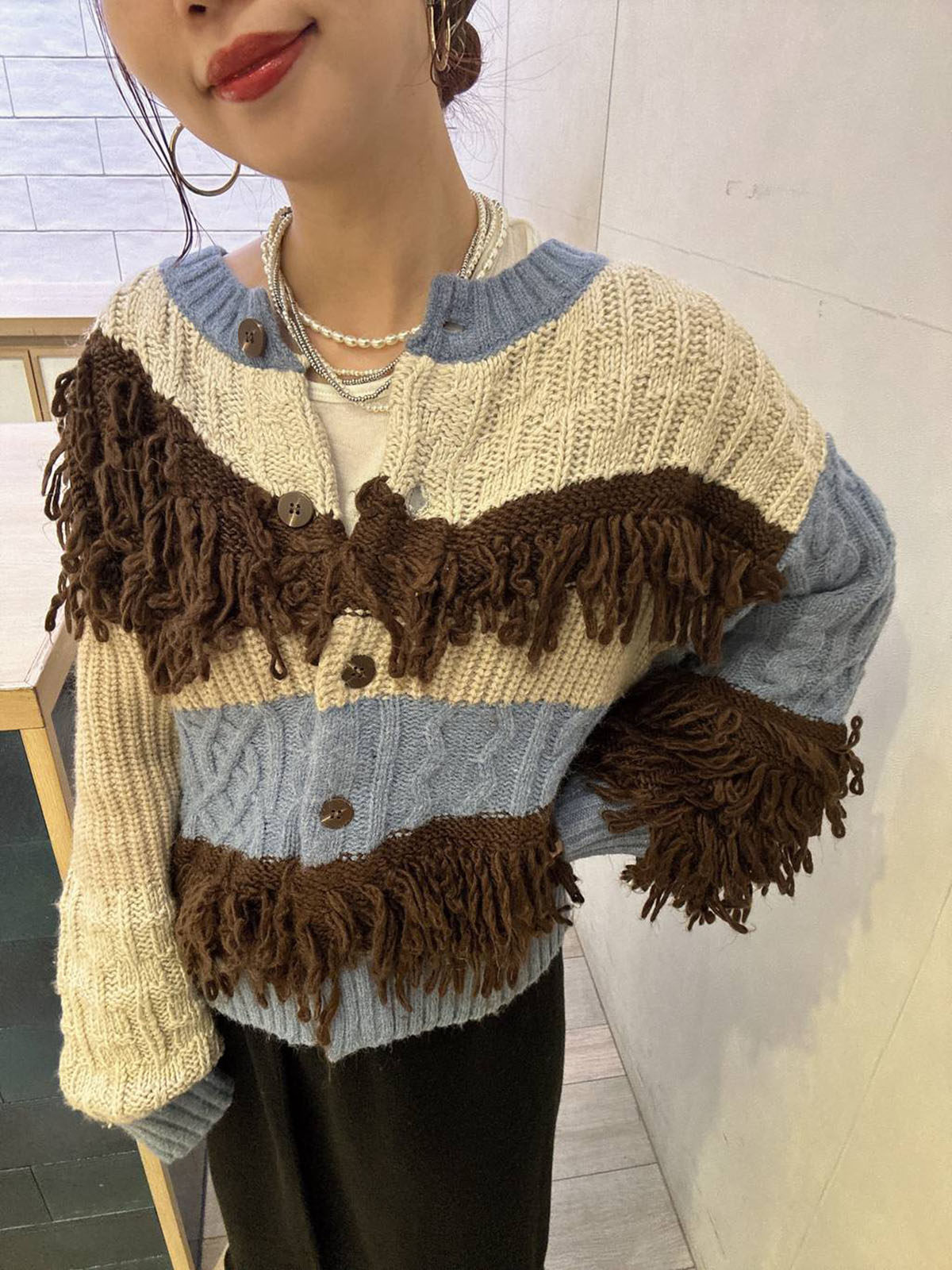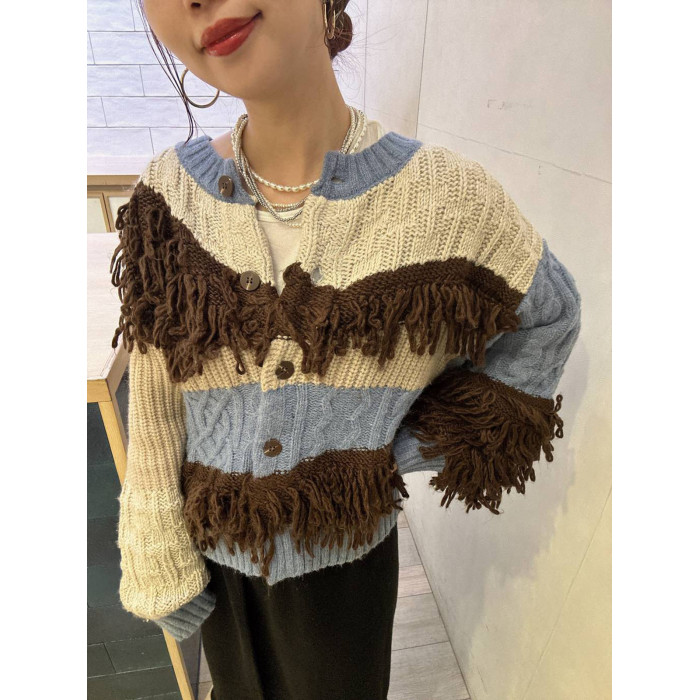 L 秋冬新款   拼色不規則流蘇單排釦圓領寬松長袖毛衣外套女