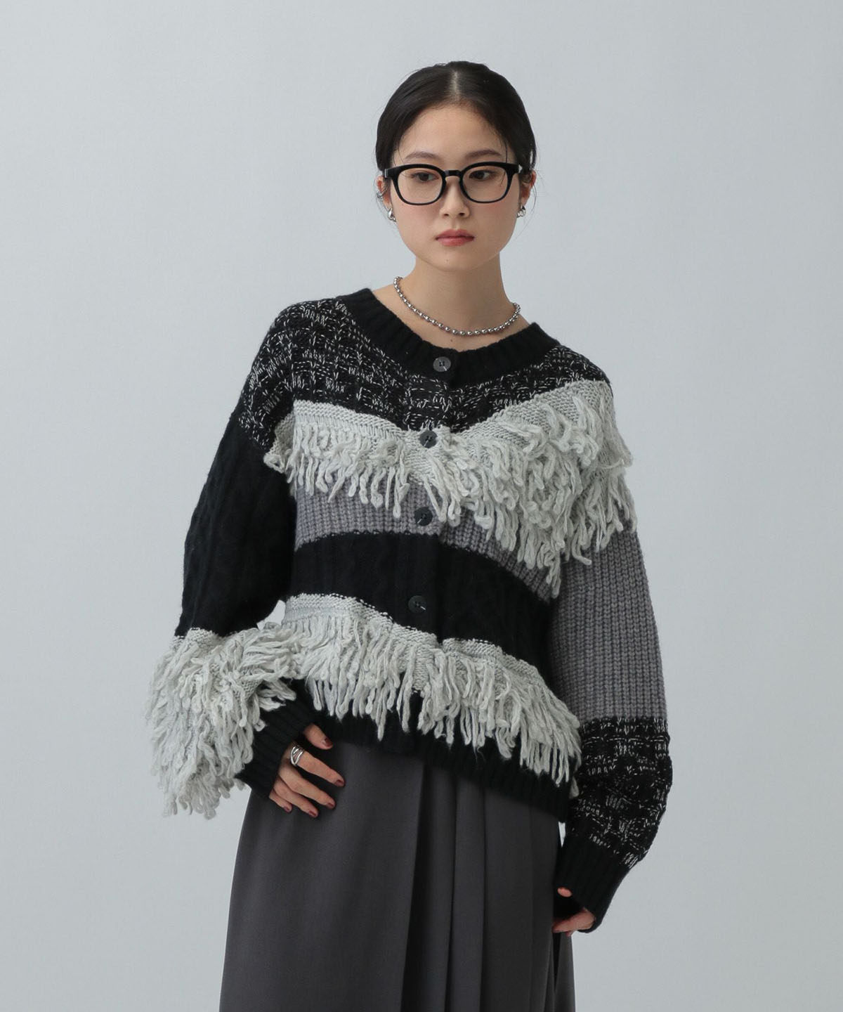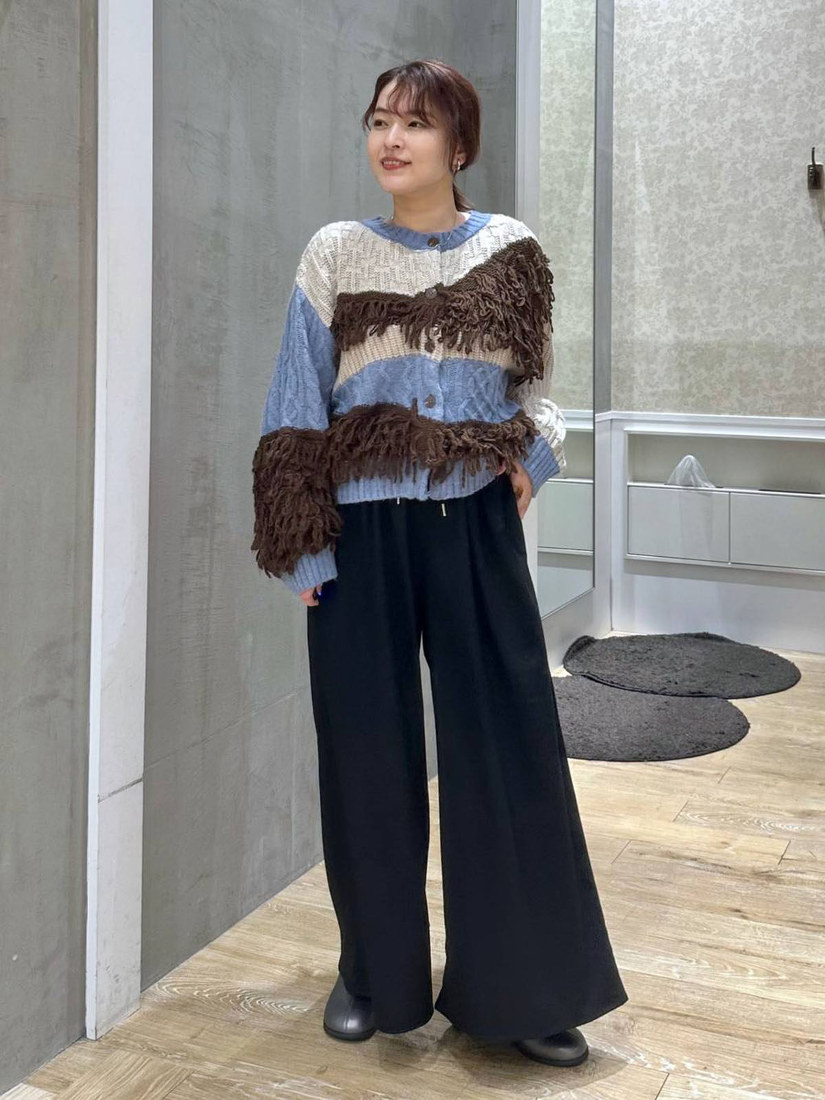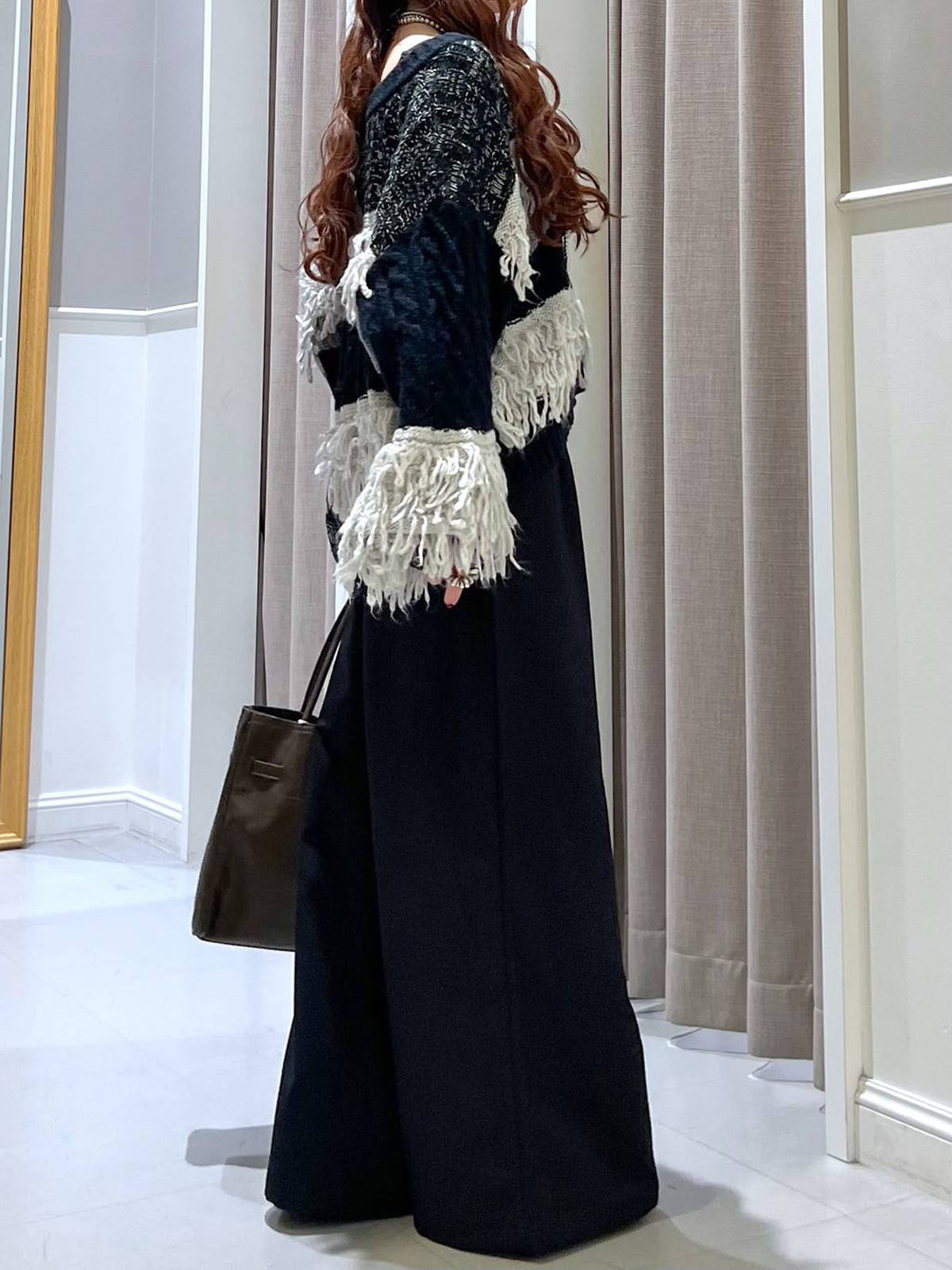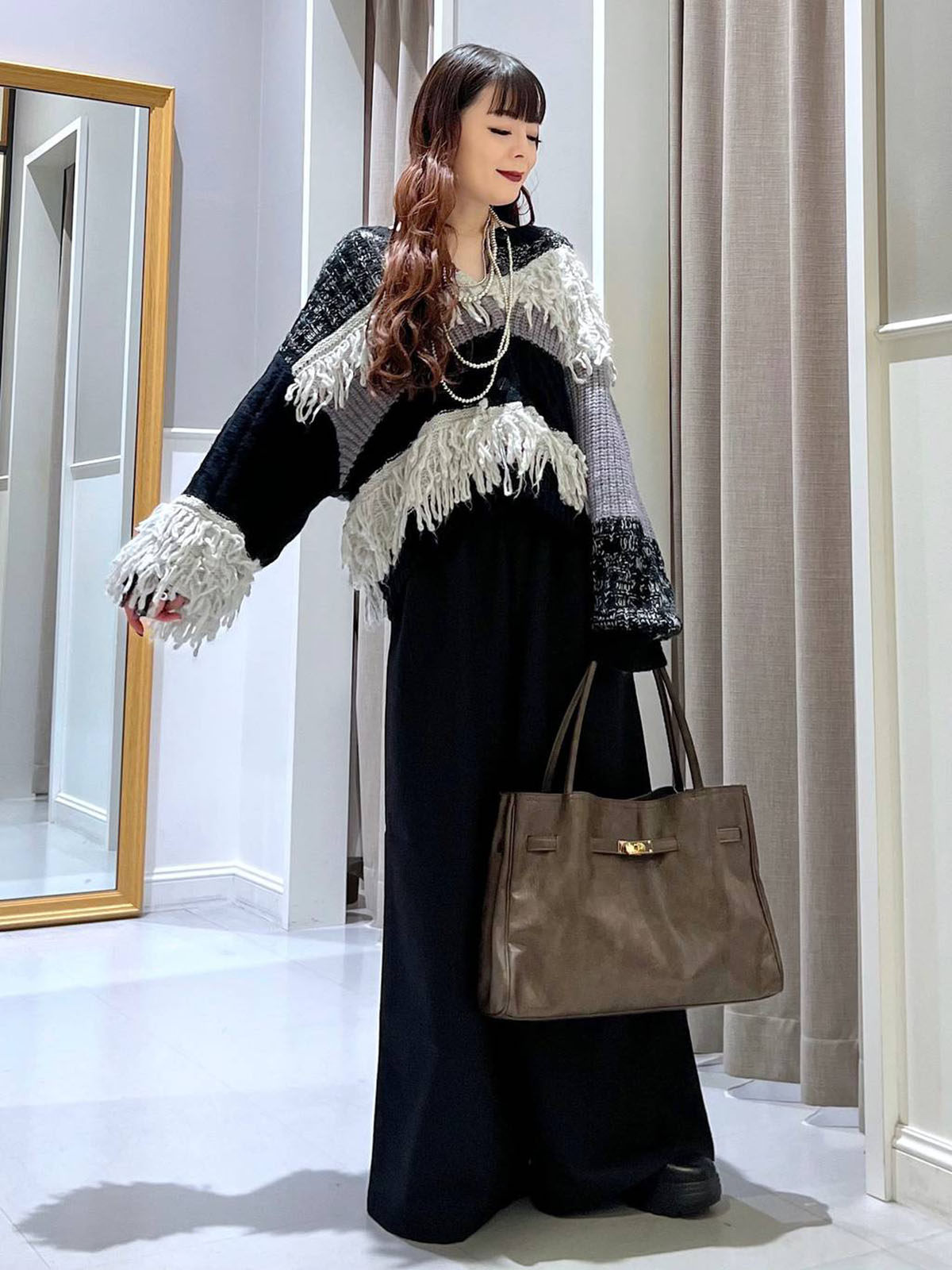 L 秋冬新款   拼色不規則流蘇單排釦圓領寬松長袖毛衣外套女