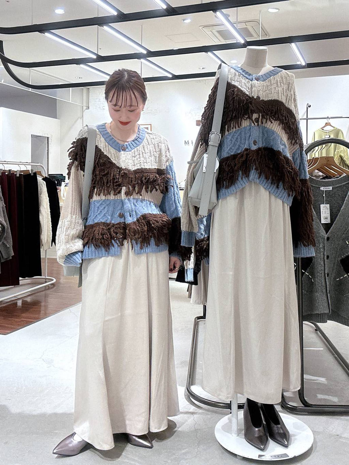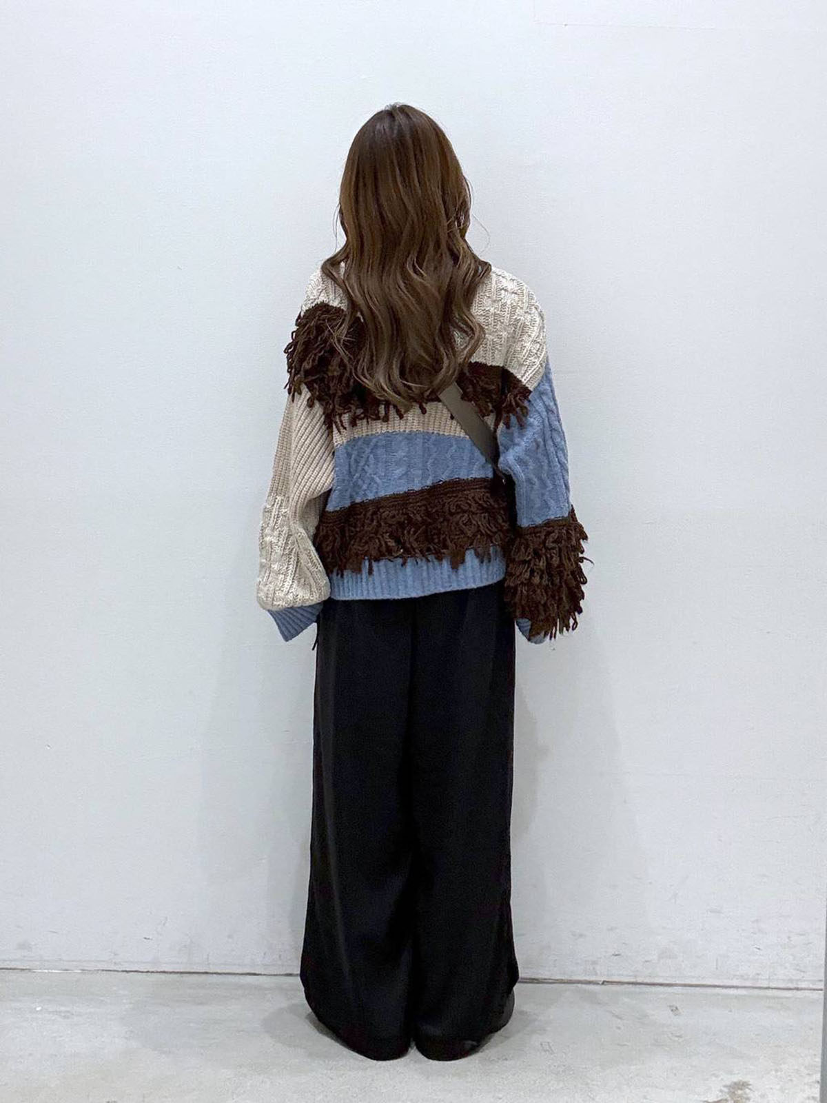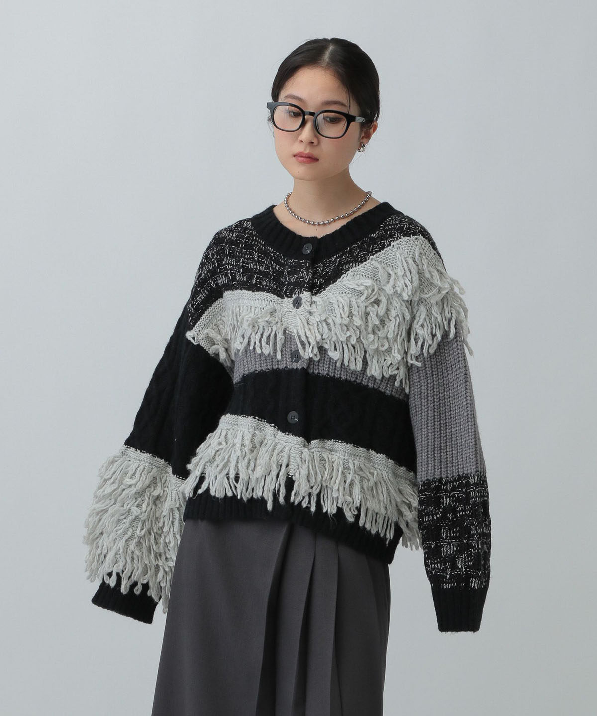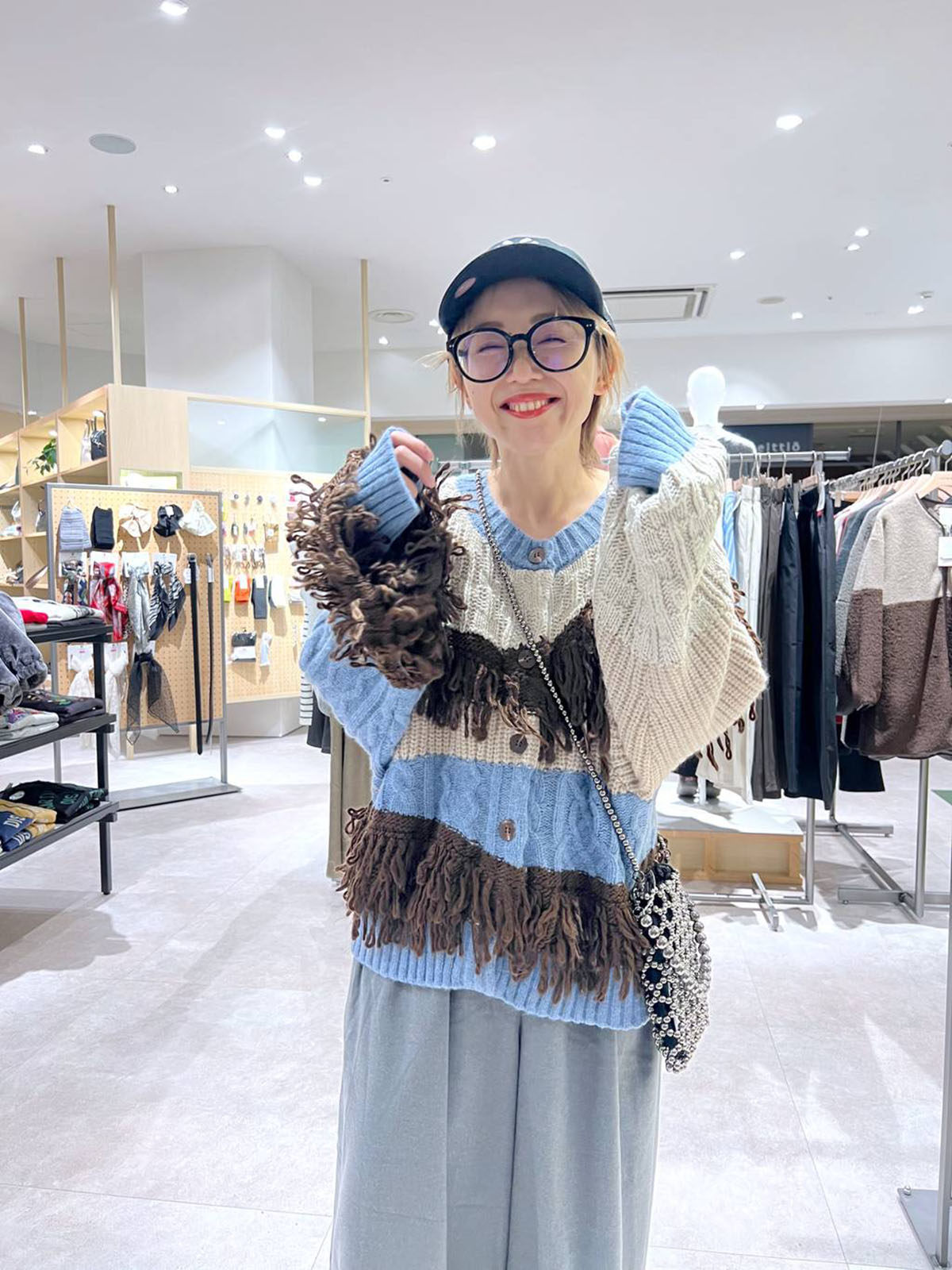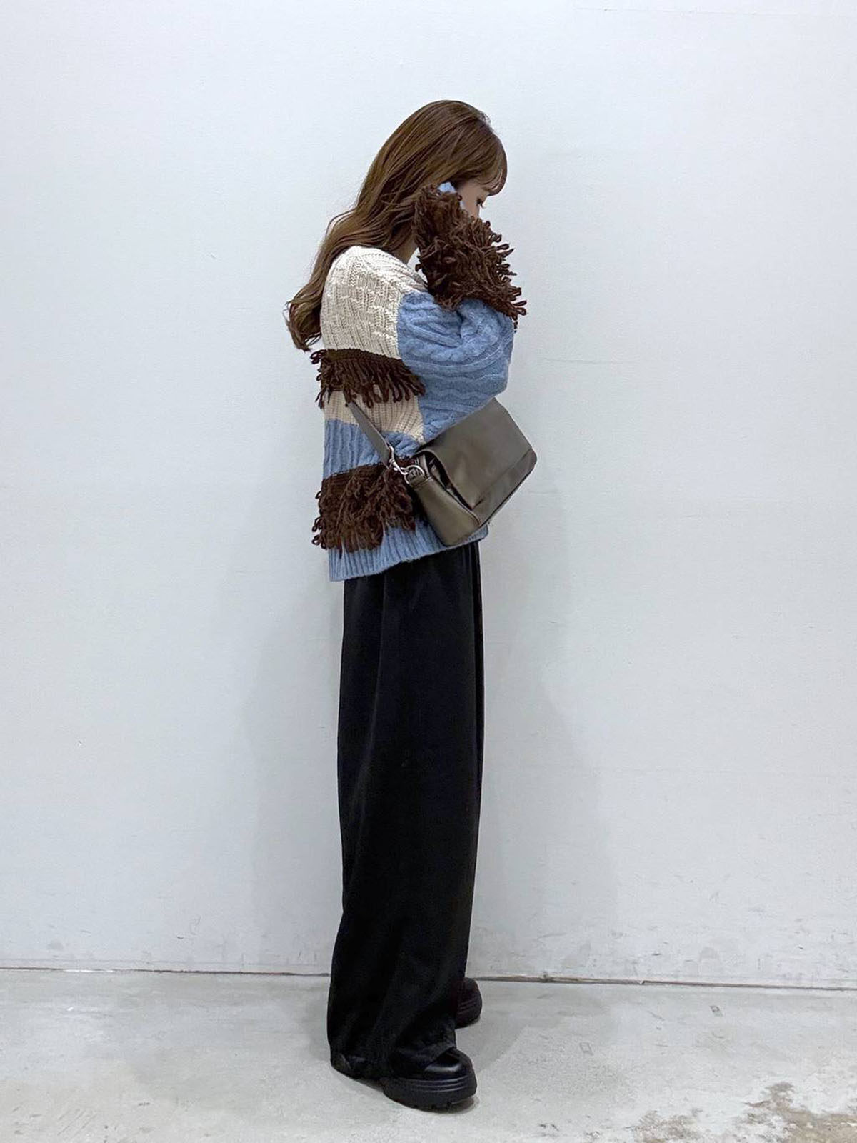 L 秋冬新款   拼色不規則流蘇單排釦圓領寬松長袖毛衣外套女