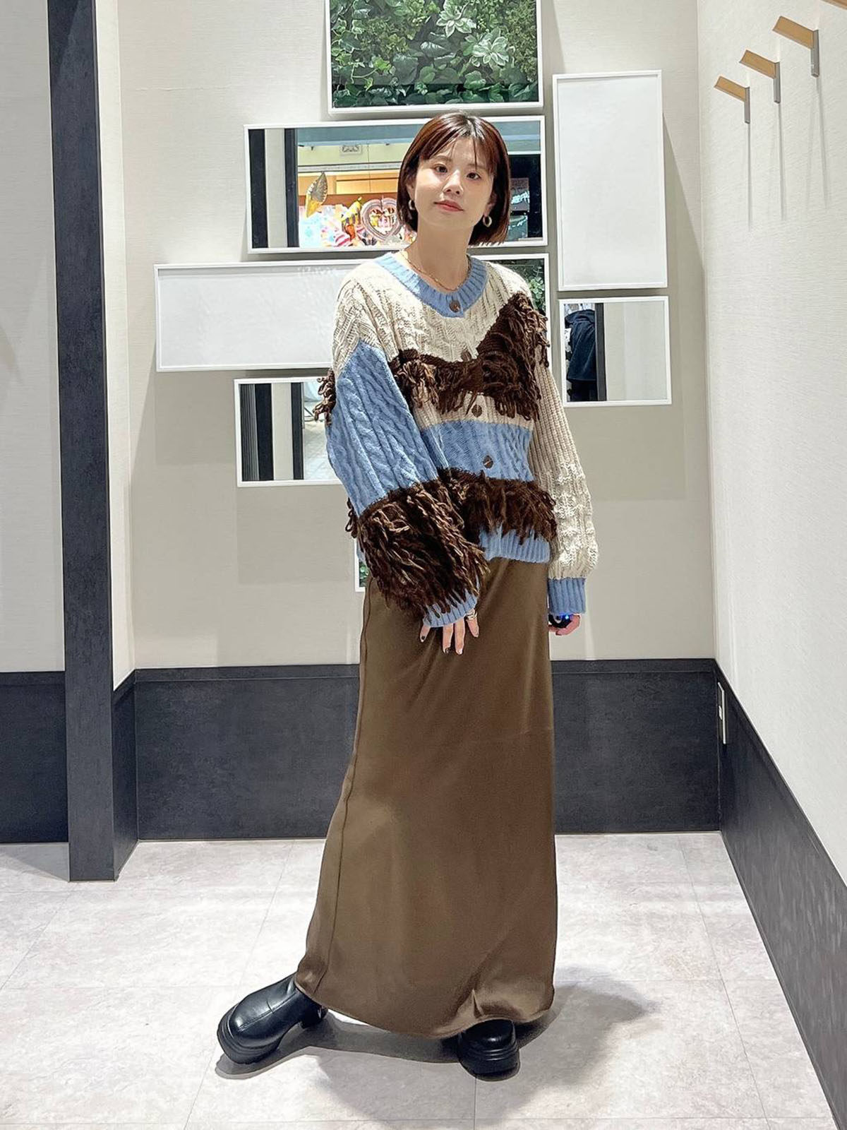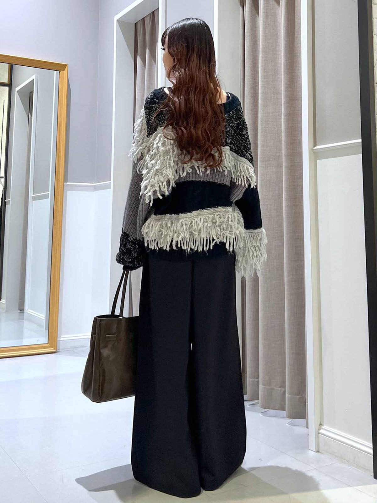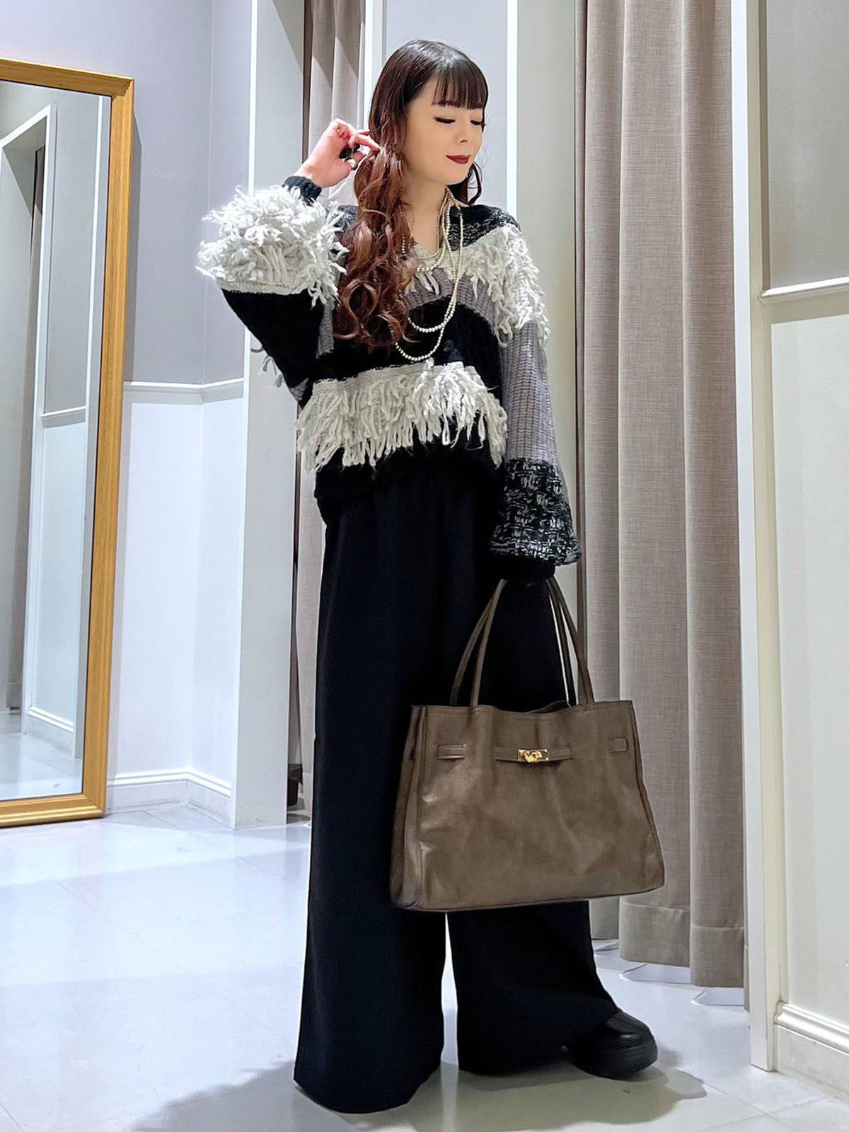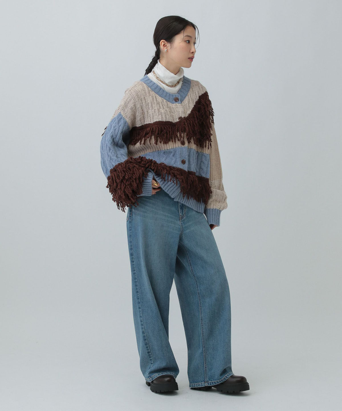 L 秋冬新款   拼色不規則流蘇單排釦圓領寬松長袖毛衣外套女