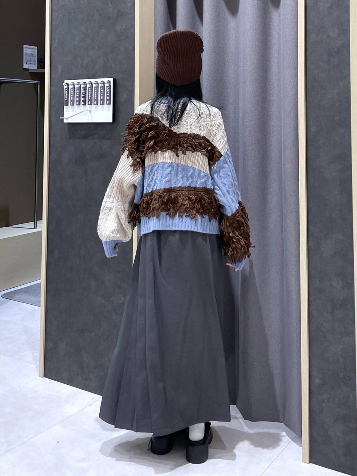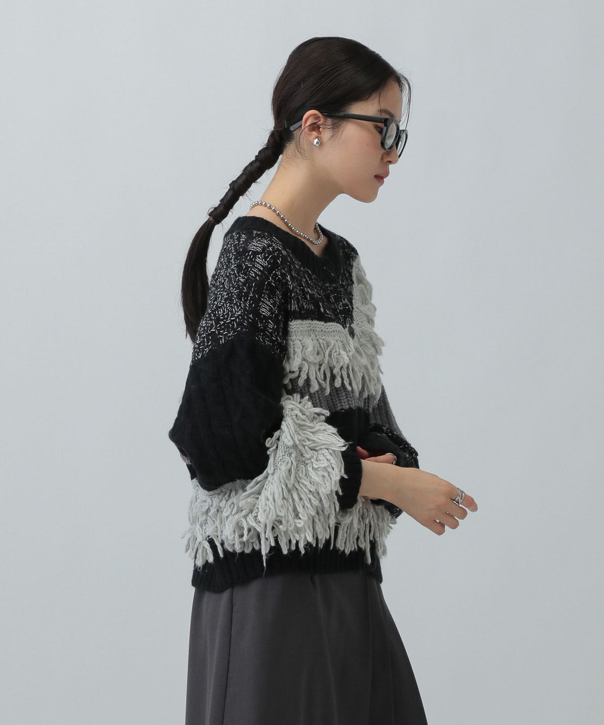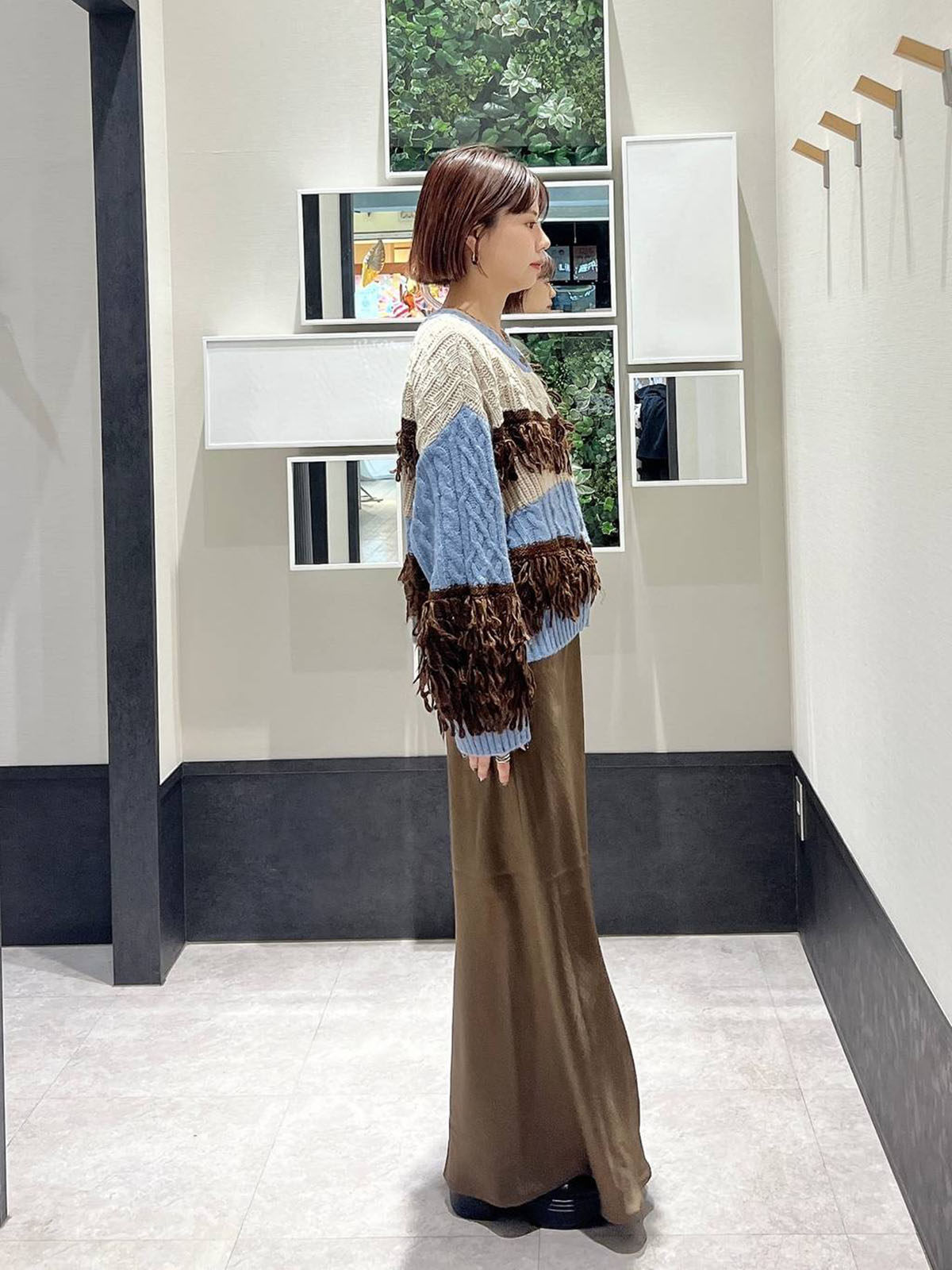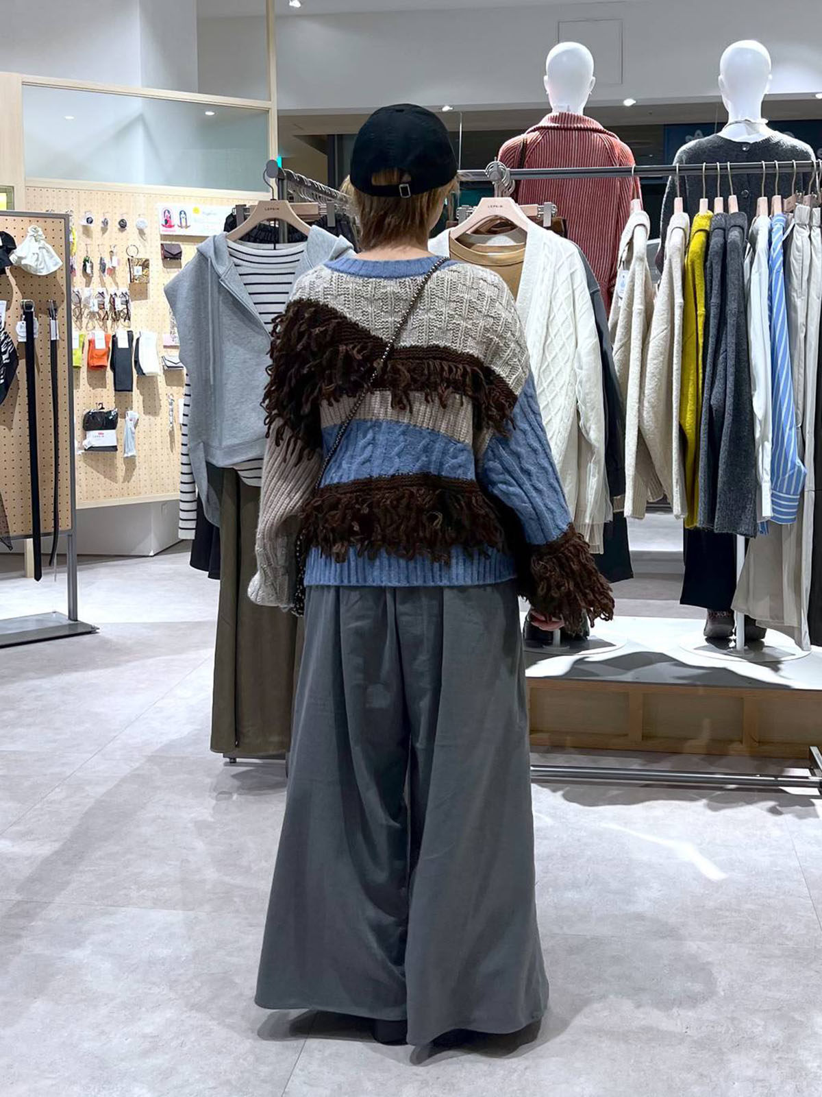 L 秋冬新款   拼色不規則流蘇單排釦圓領寬松長袖毛衣外套女