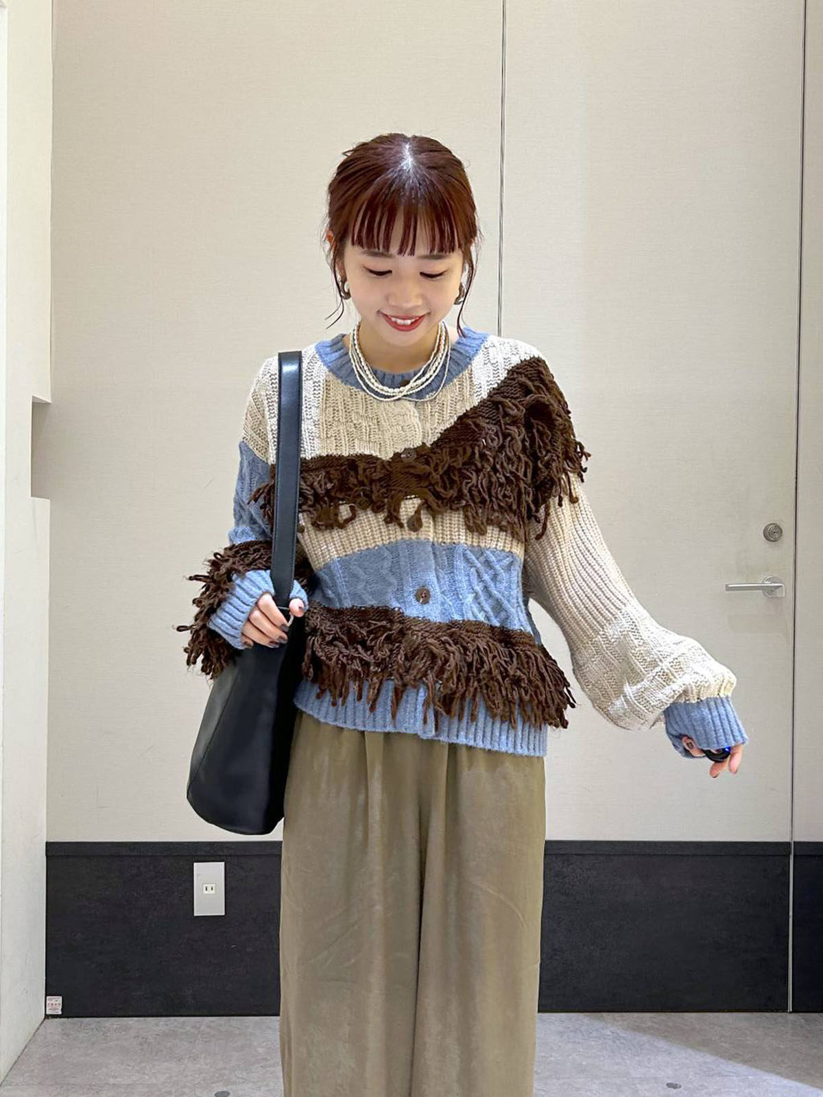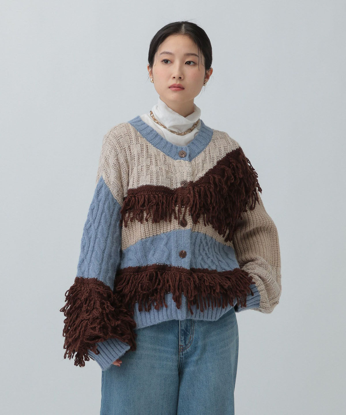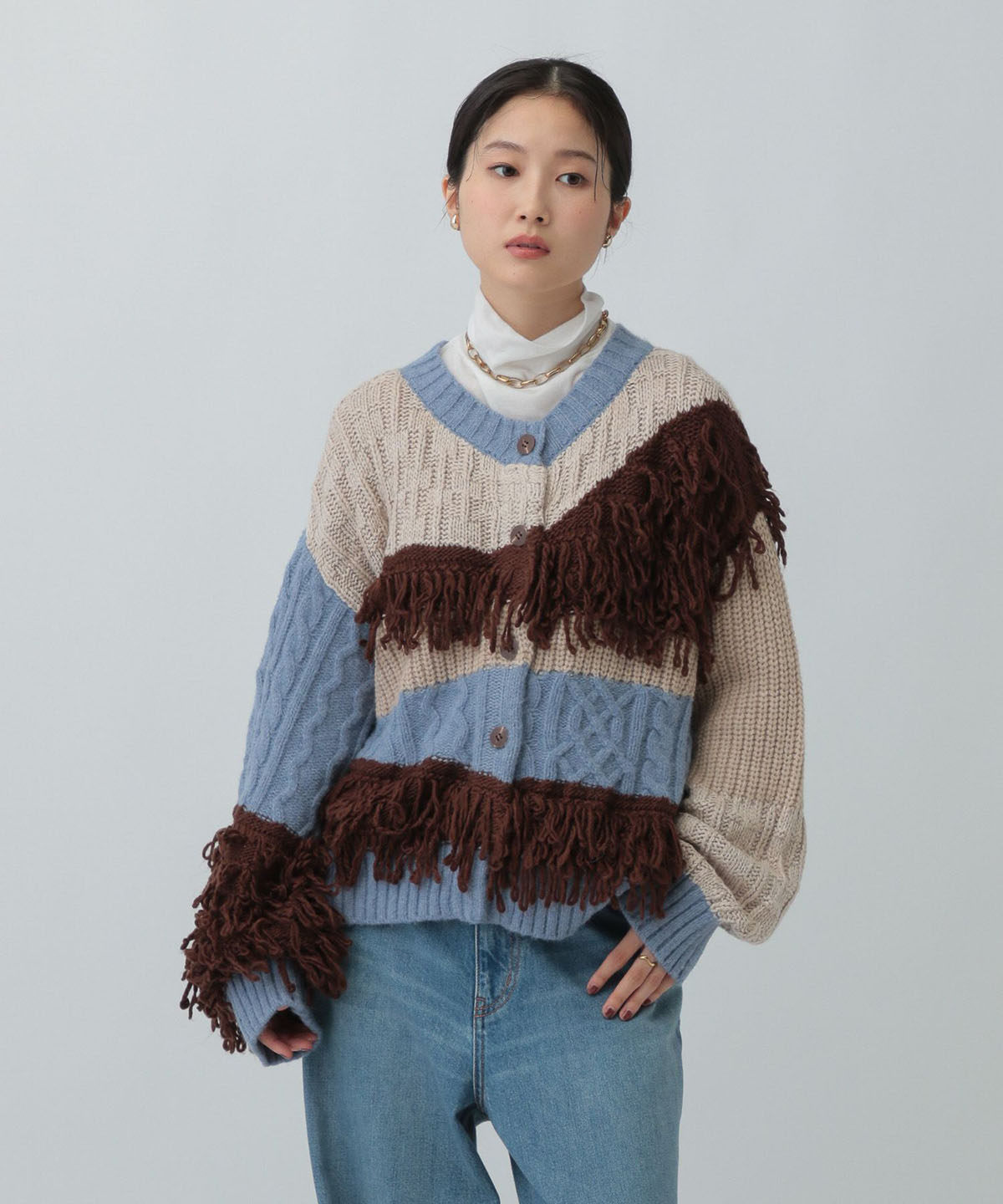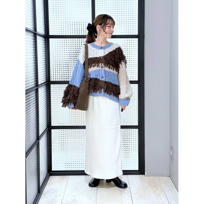 L 秋冬新款 拼色不規則流蘇單排釦圓領寬松長袖毛衣外套女