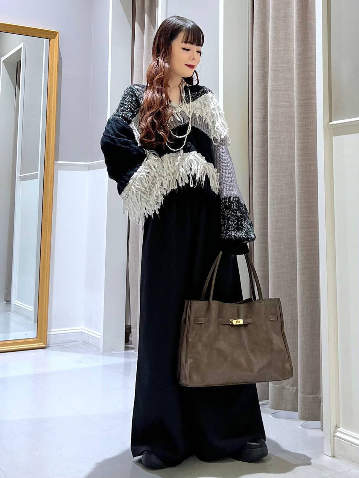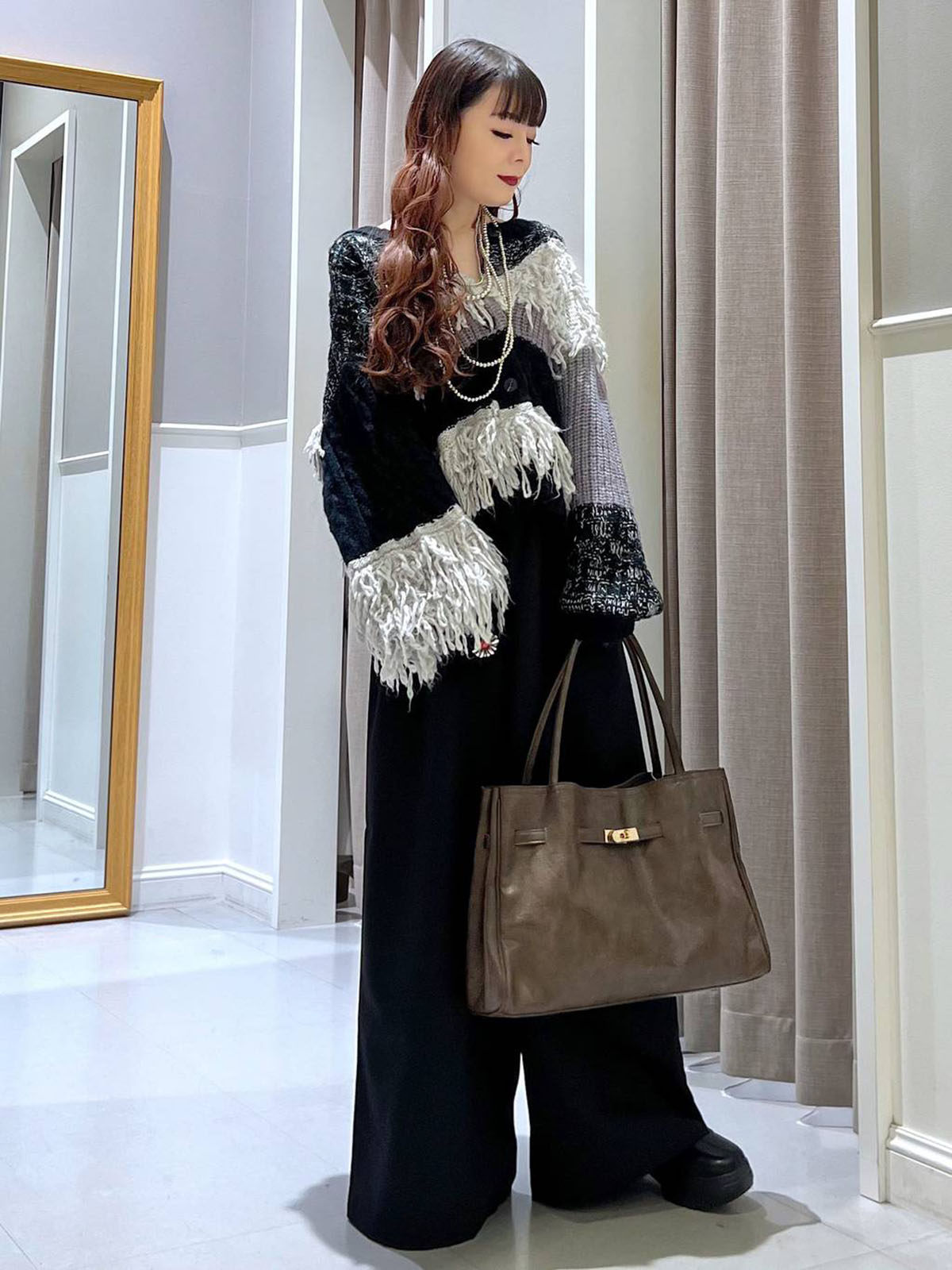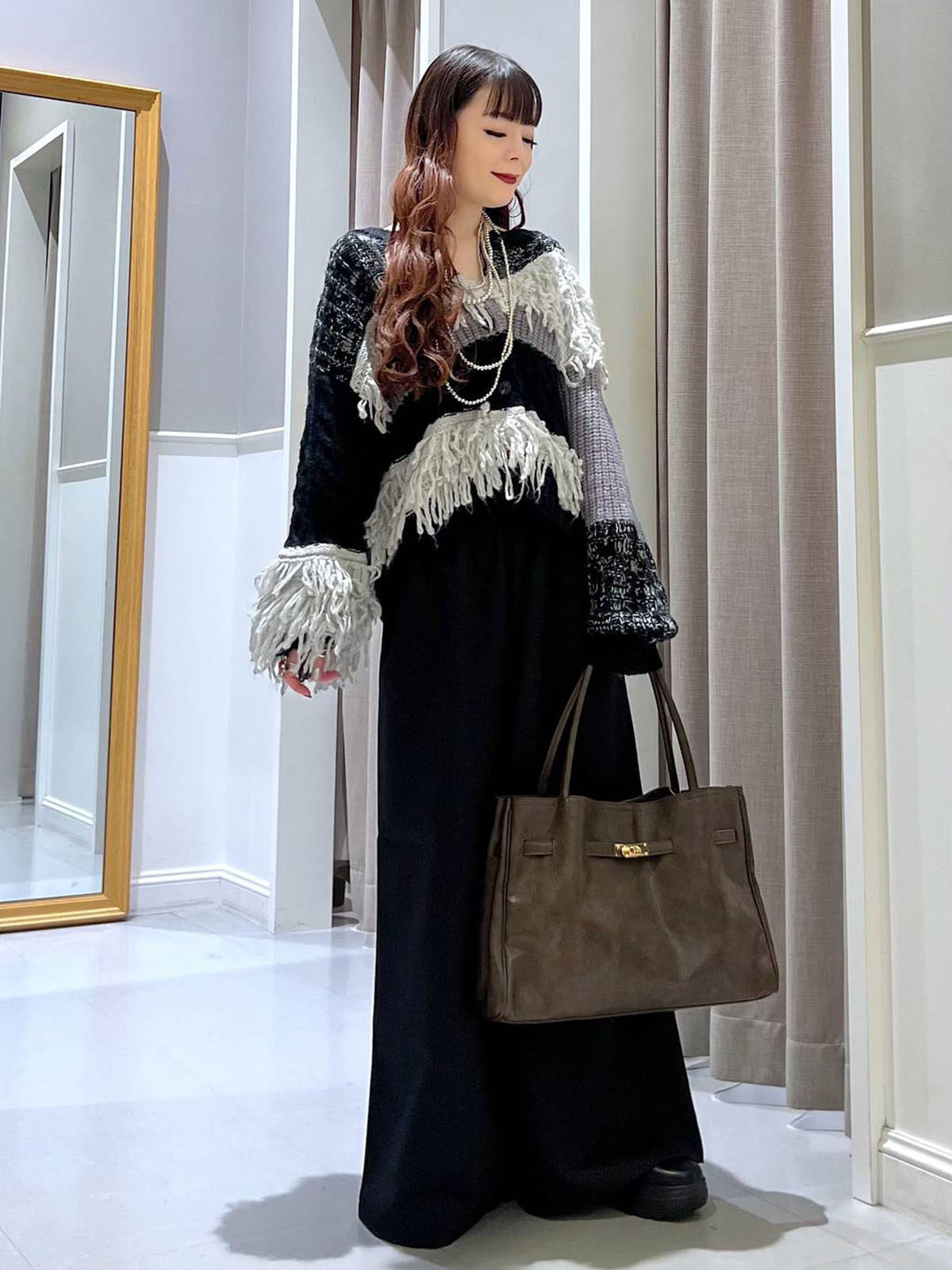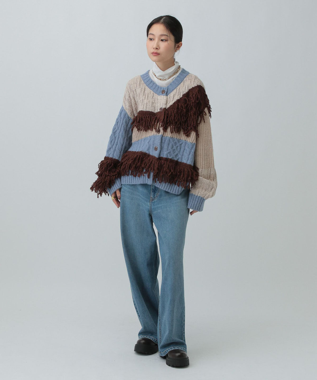 L 秋冬新款 拼色不規則流蘇單排釦圓領寬松長袖毛衣外套女
