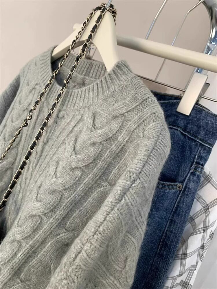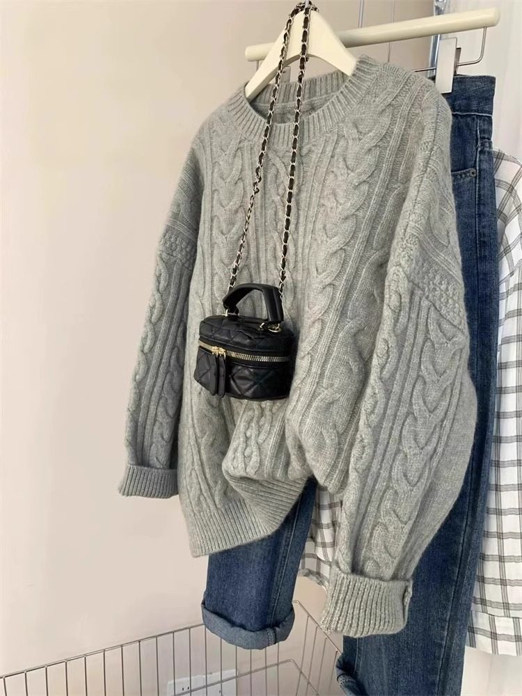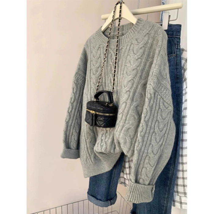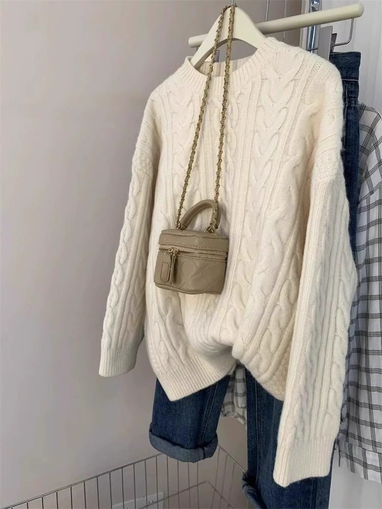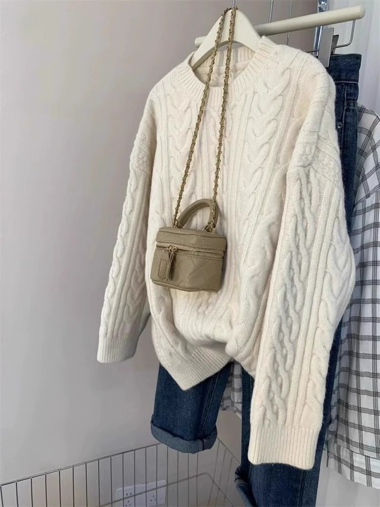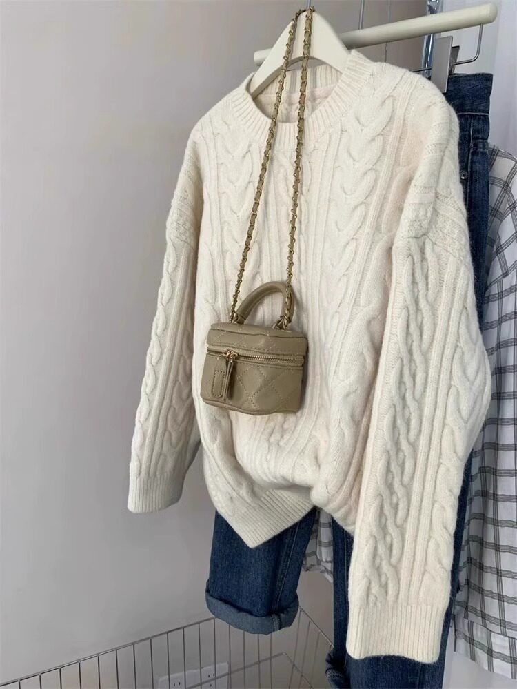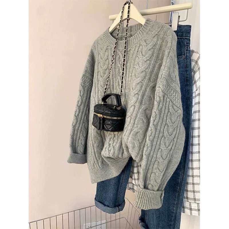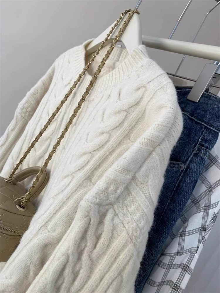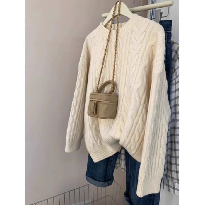 2024秋冬慵懶風加厚復古麻花馬海毛寬松外穿圓領打底套頭毛衣女潮