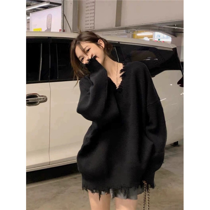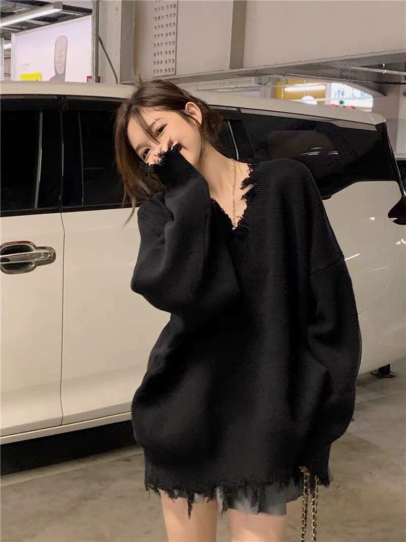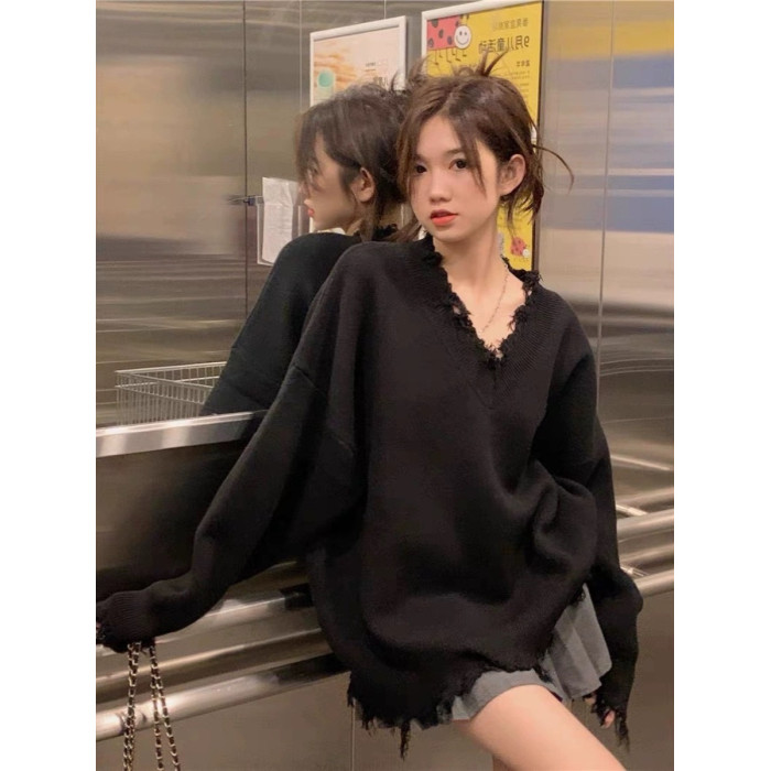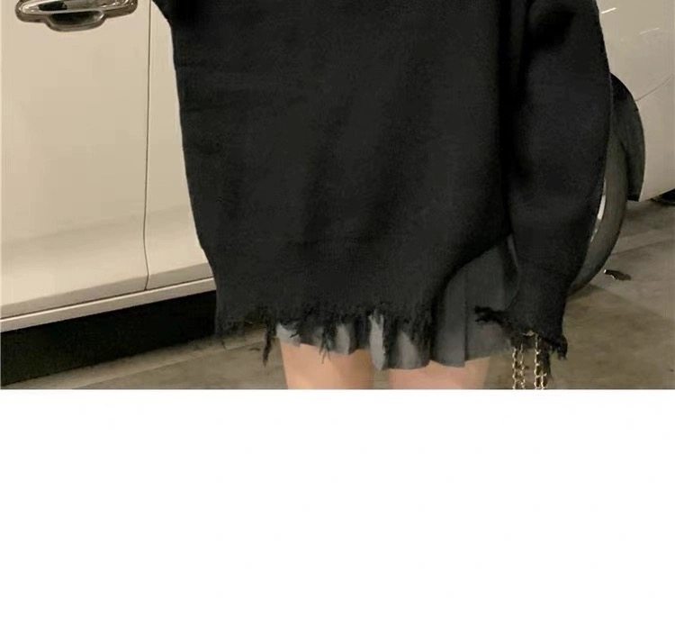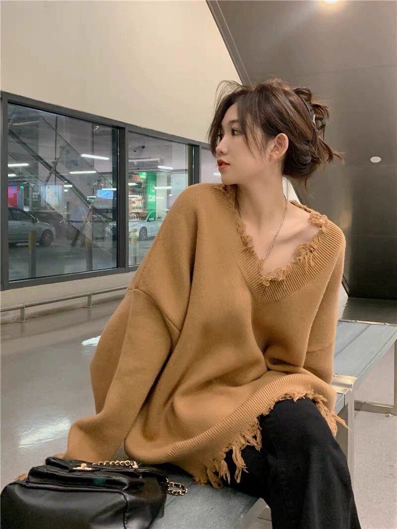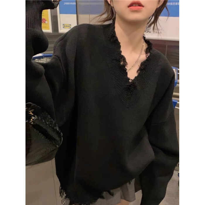 復古日系慵懶風韓系設計感毛衣女新款2022秋冬寬松外穿破洞針織衫