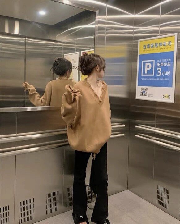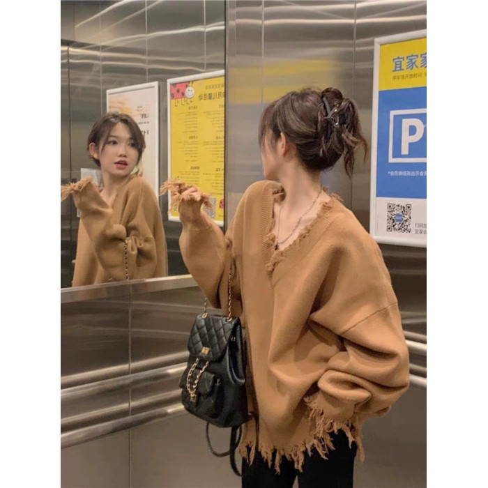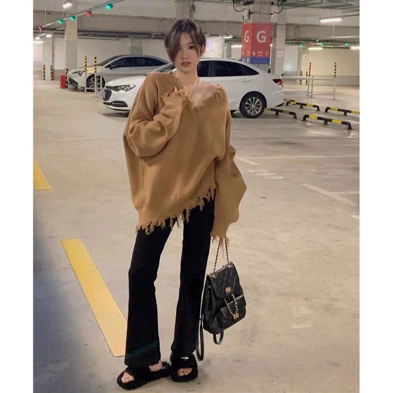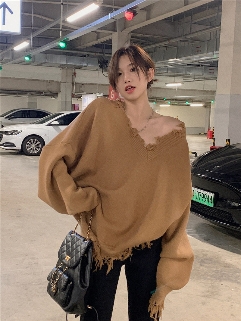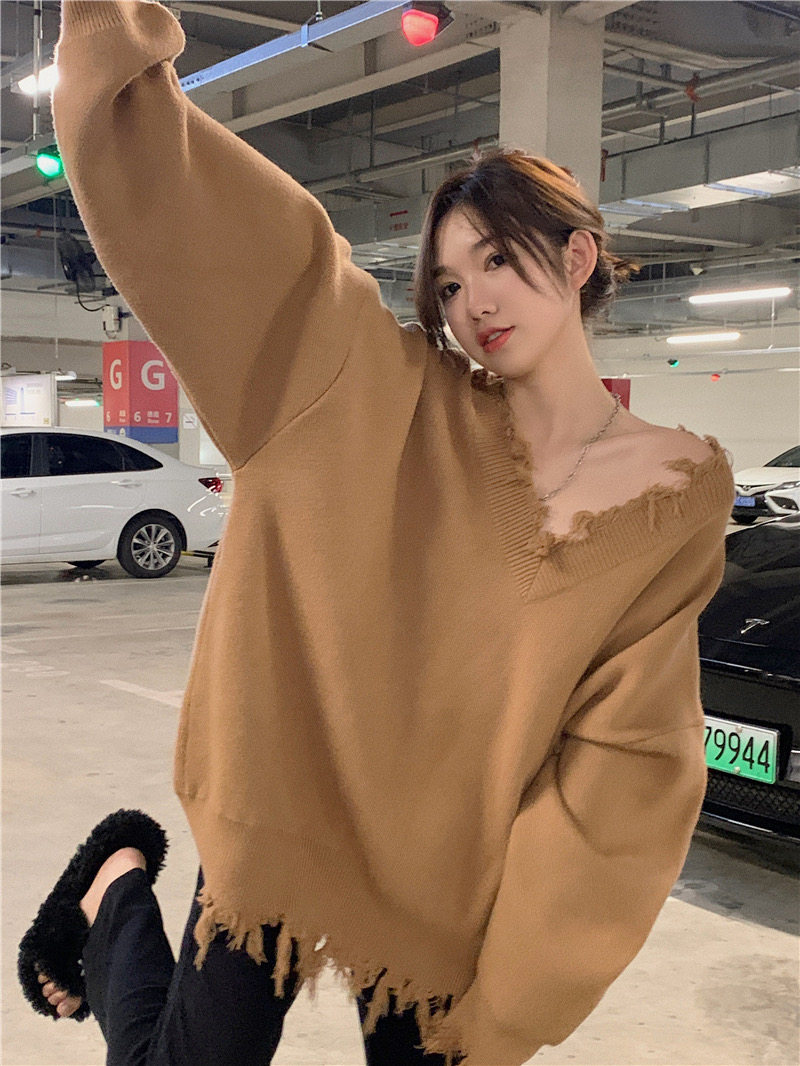 復古日系慵懶風韓系設計感毛衣女新款2022秋冬寬松外穿破洞針織衫