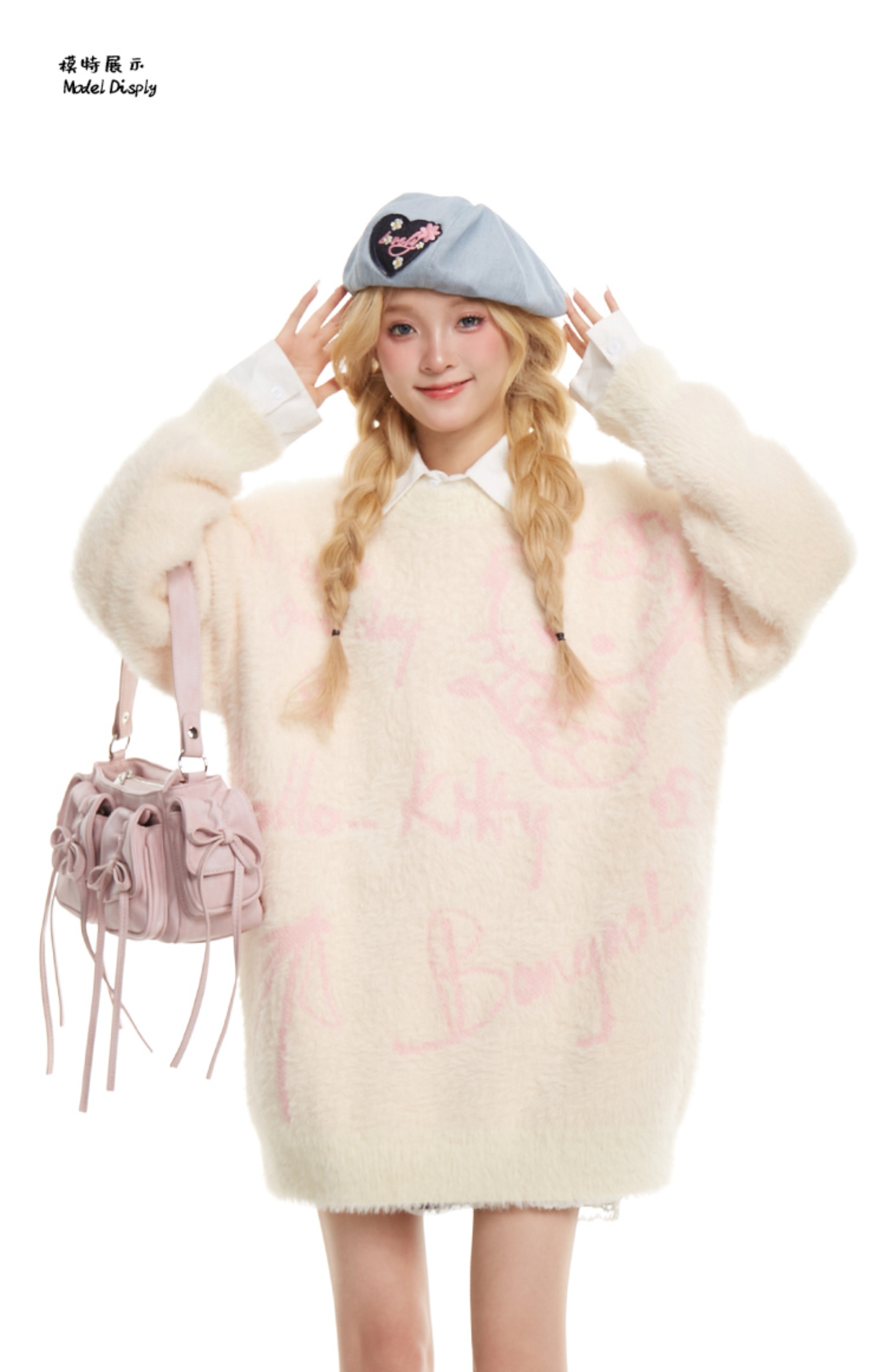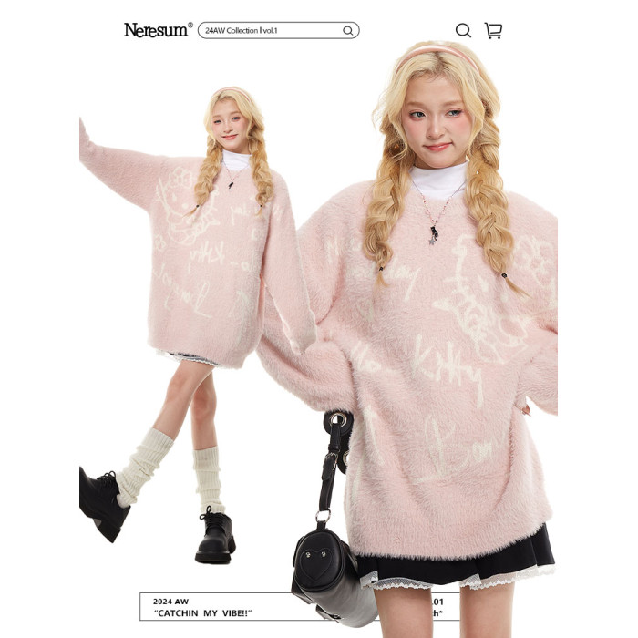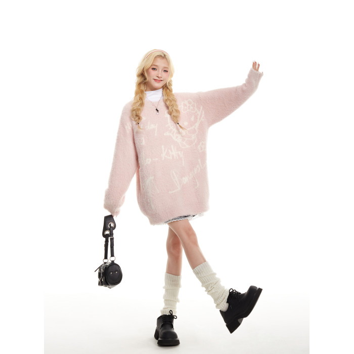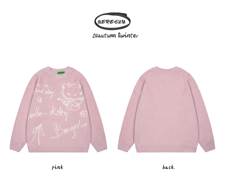 NERESUM日系甜酷馬海毛kitty貓粉色毛衣女秋冬奶fufu慵懶風針織衫