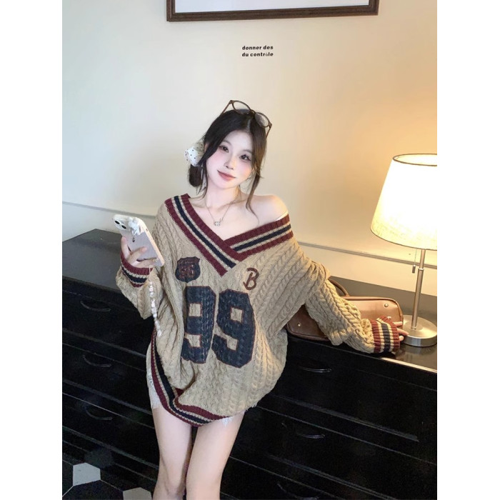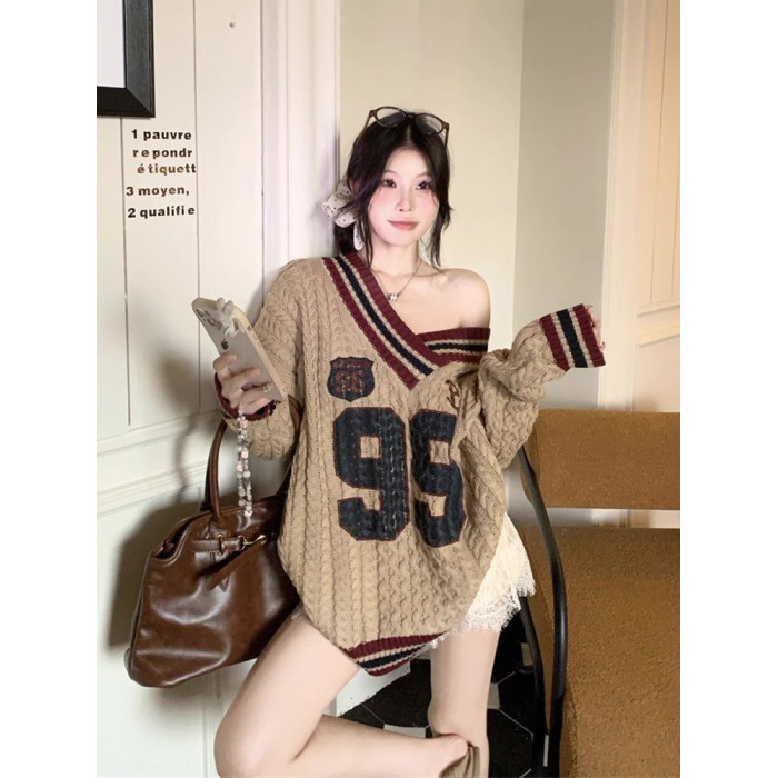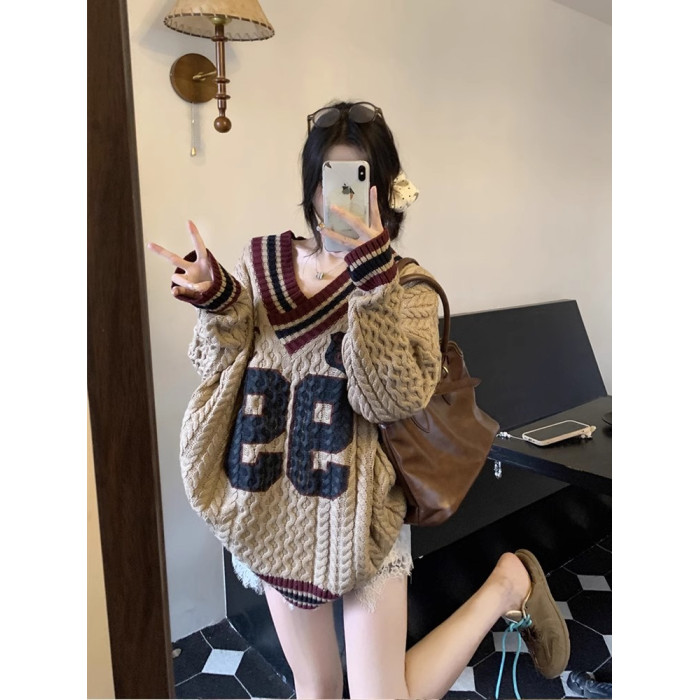 美式復古字母麻花條紋v領毛衣女秋冬小個子慵懶風寬松中長款針織