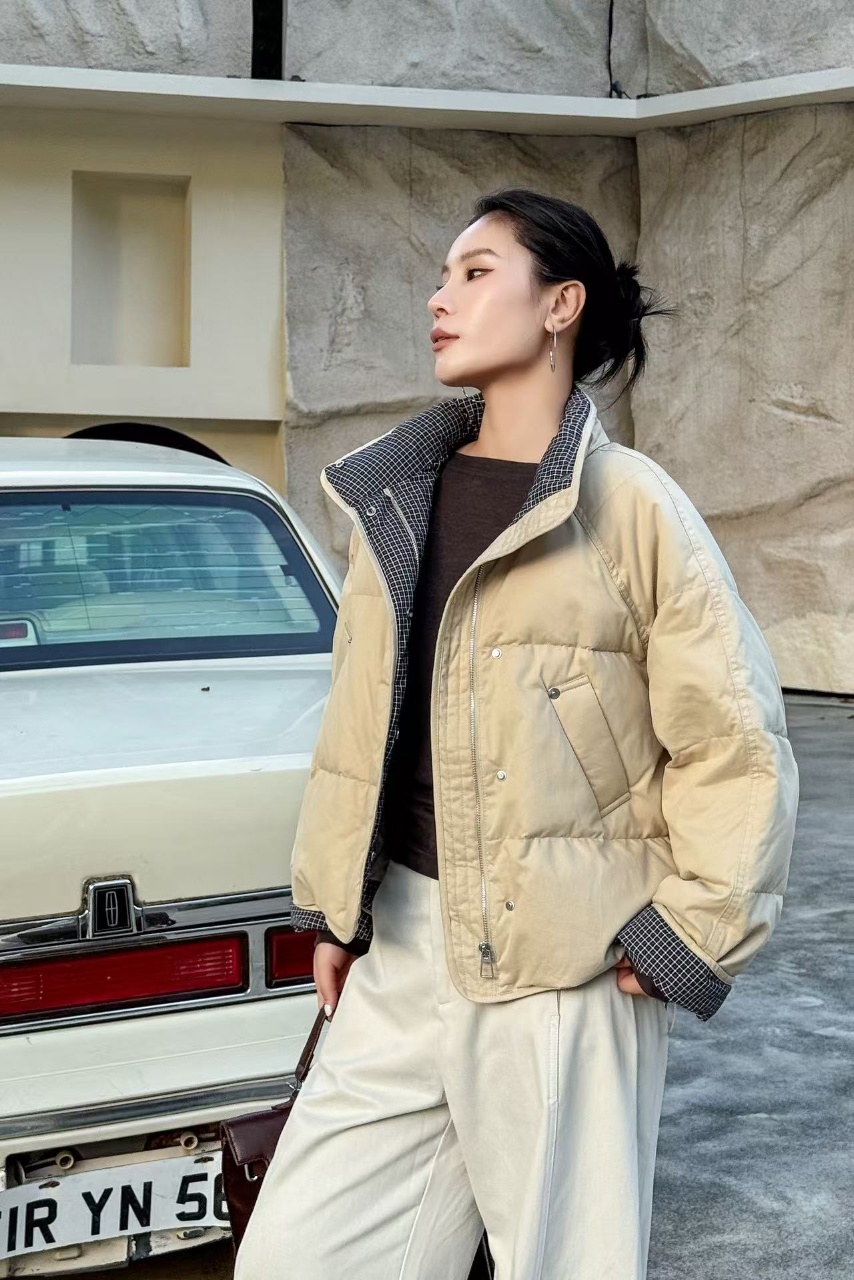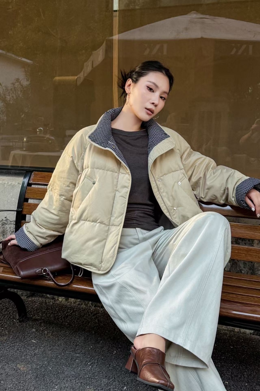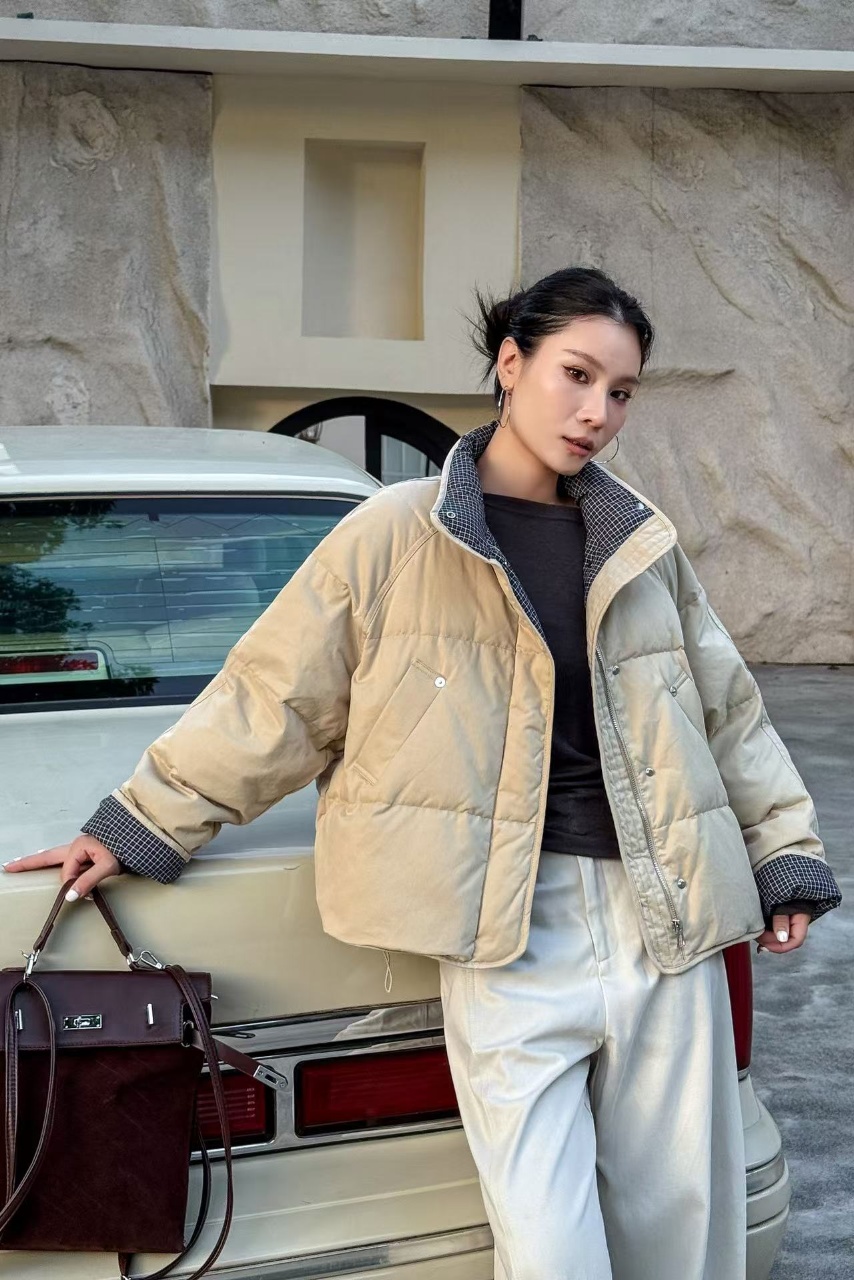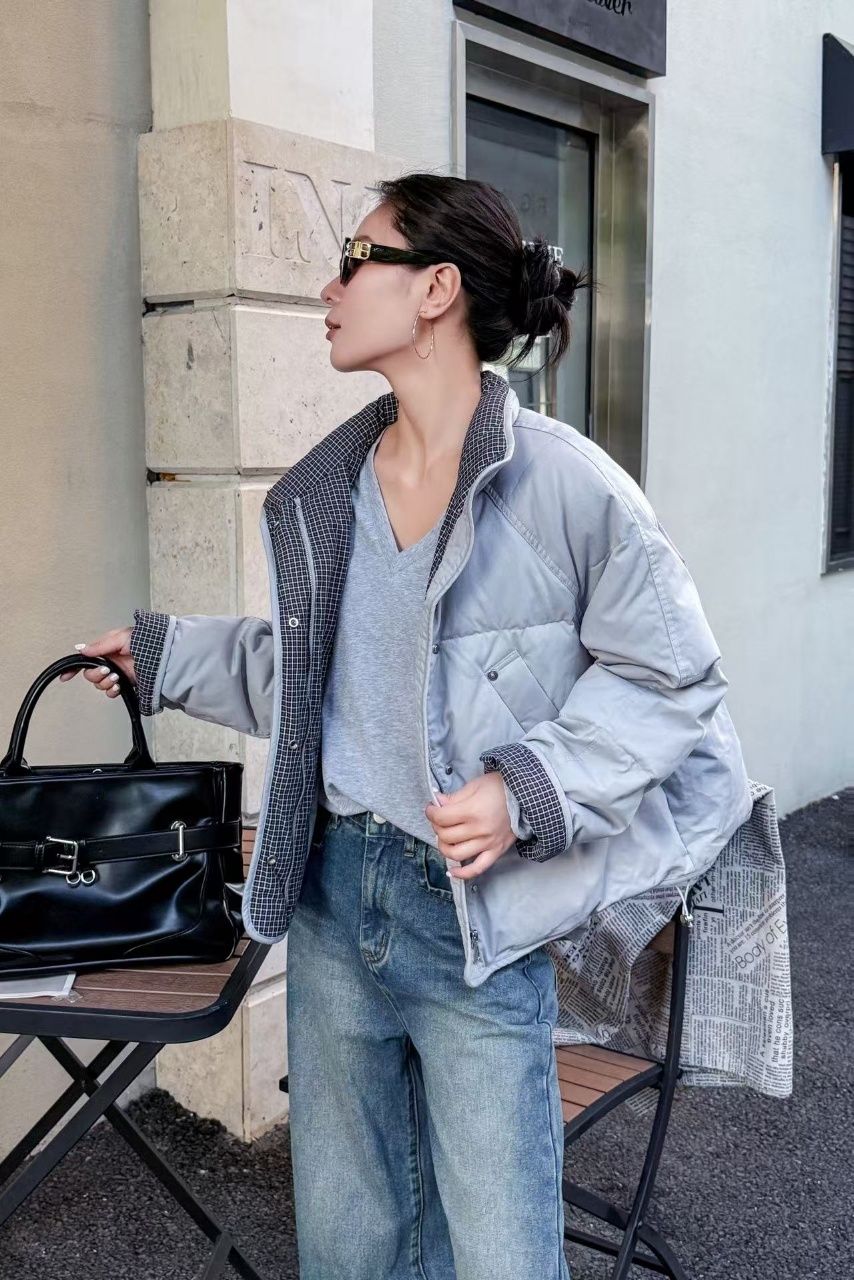 2025新款冬季羽絨服女短款格子拼接加厚小個子文藝休閒白鴨絨外套
