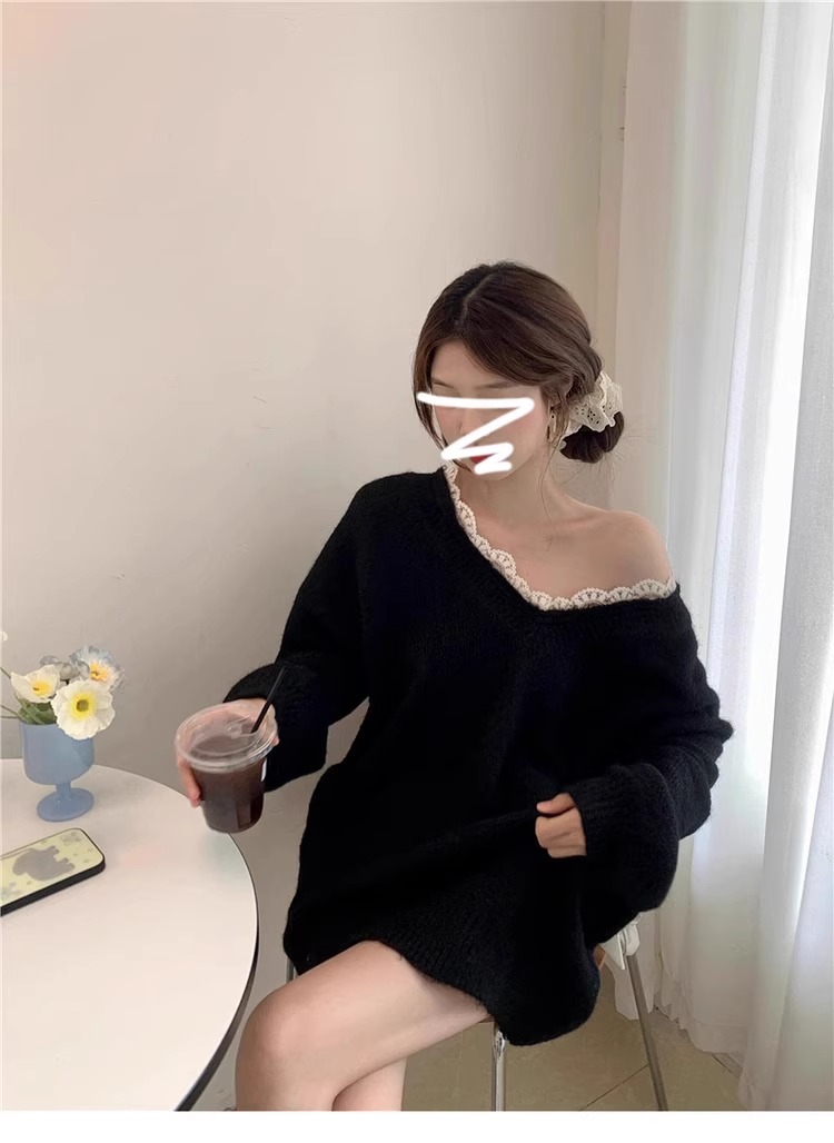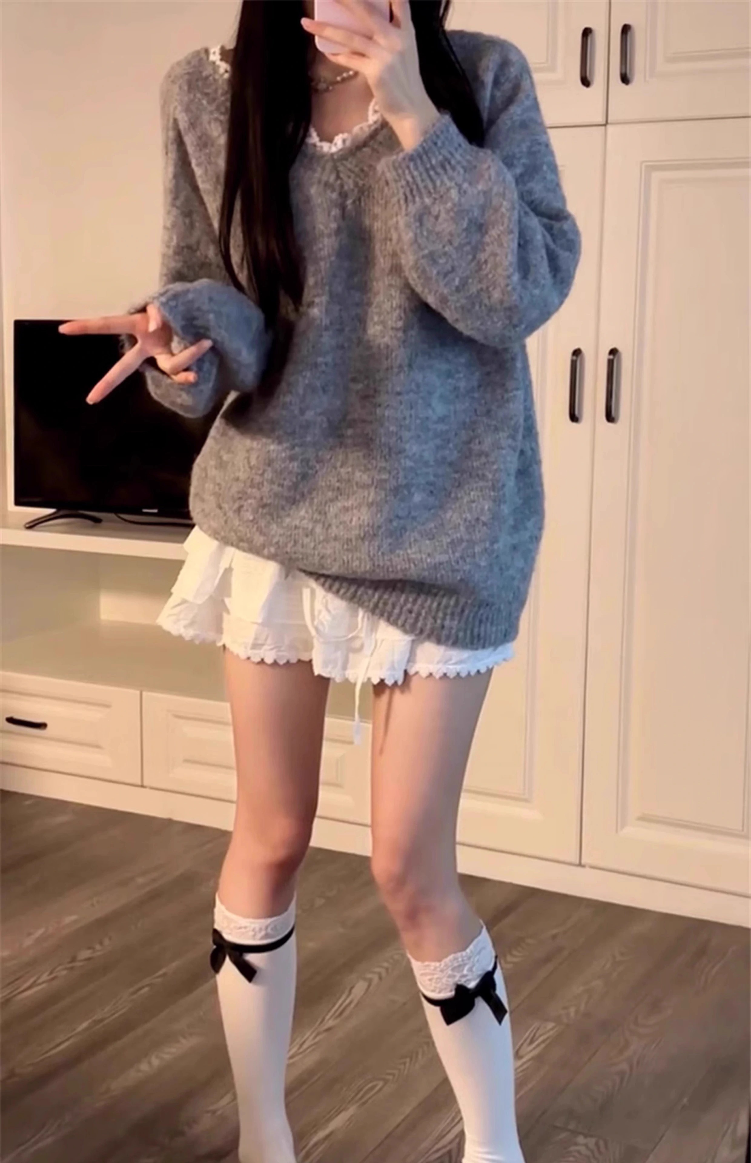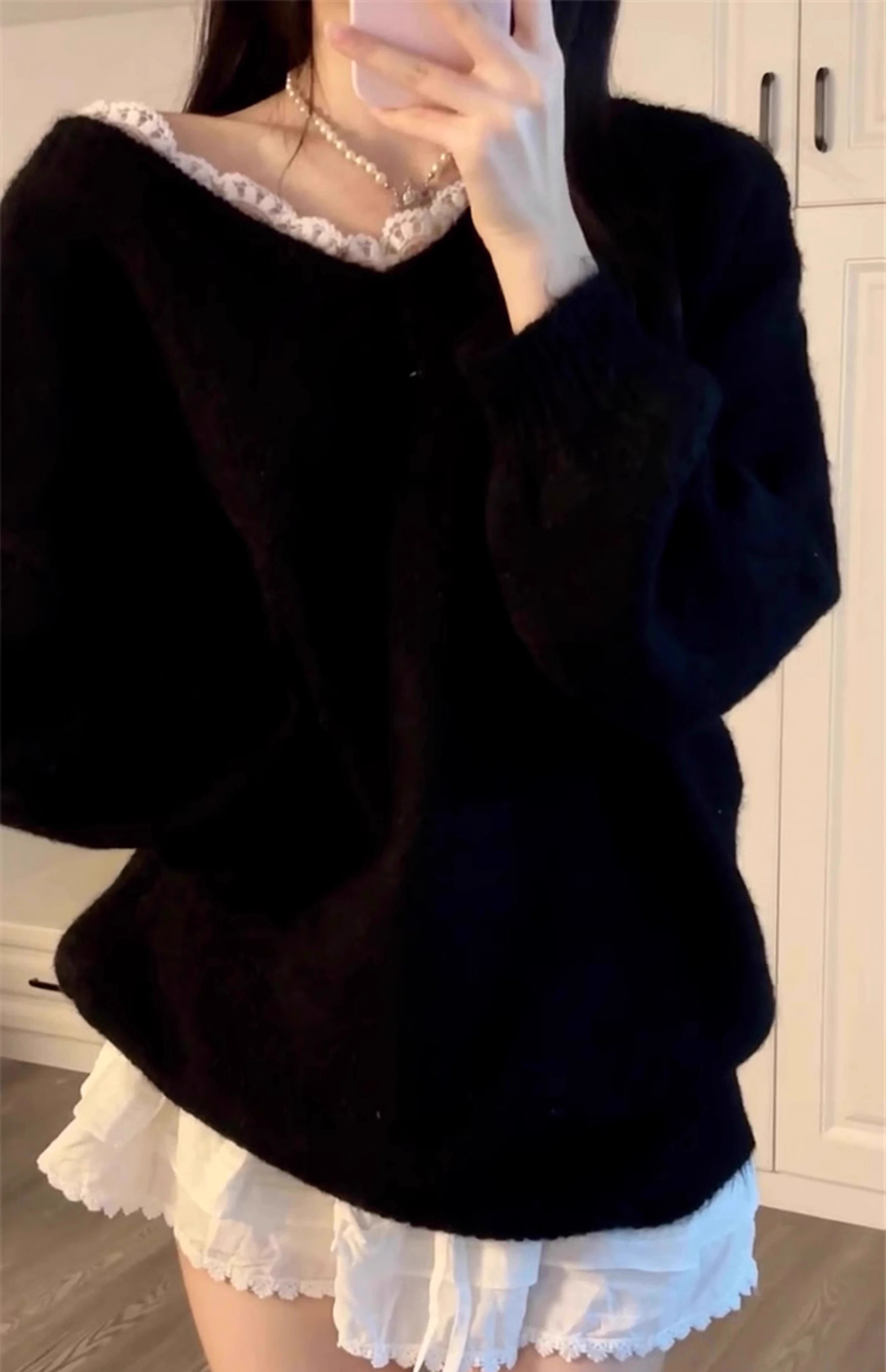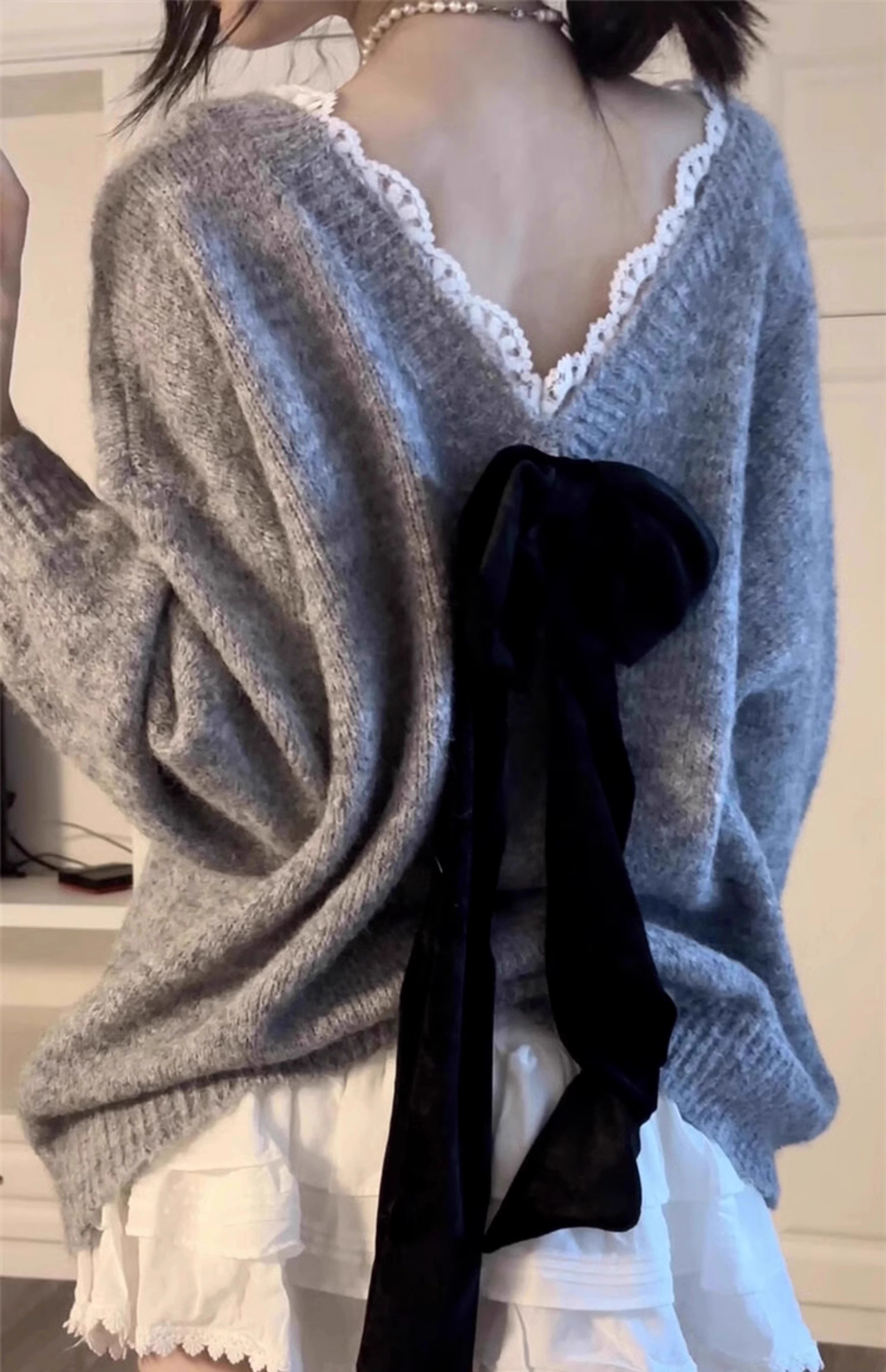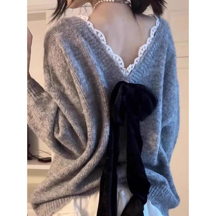 黑色蝴蝶結露背v領毛衣女秋冬2024新款慵懶風高級感寬松針織上衣