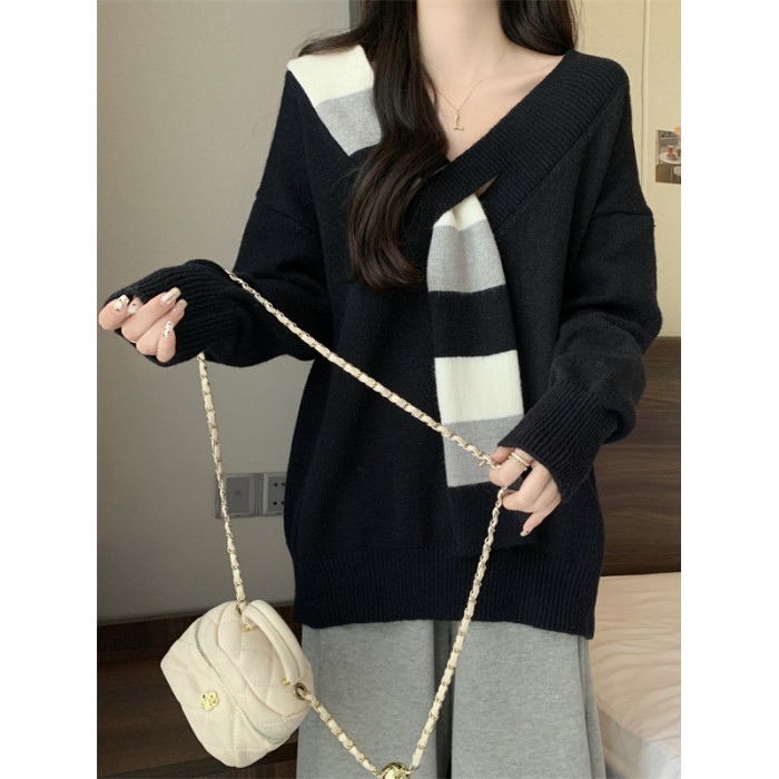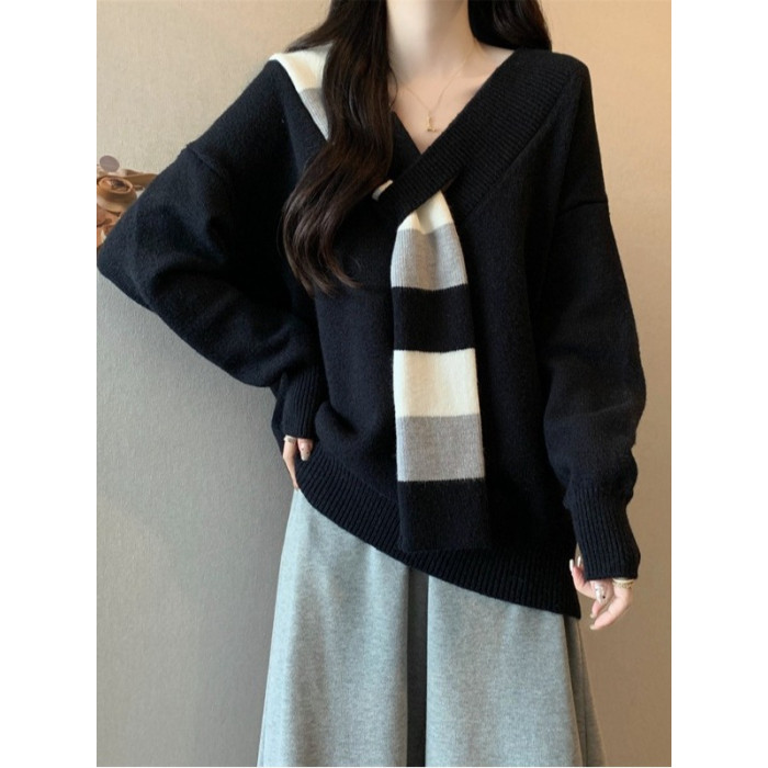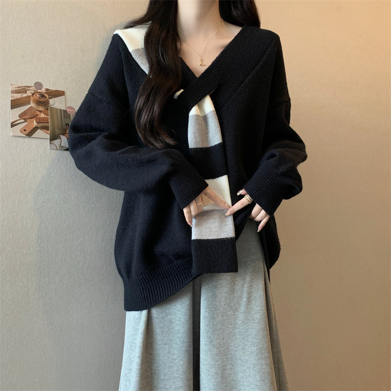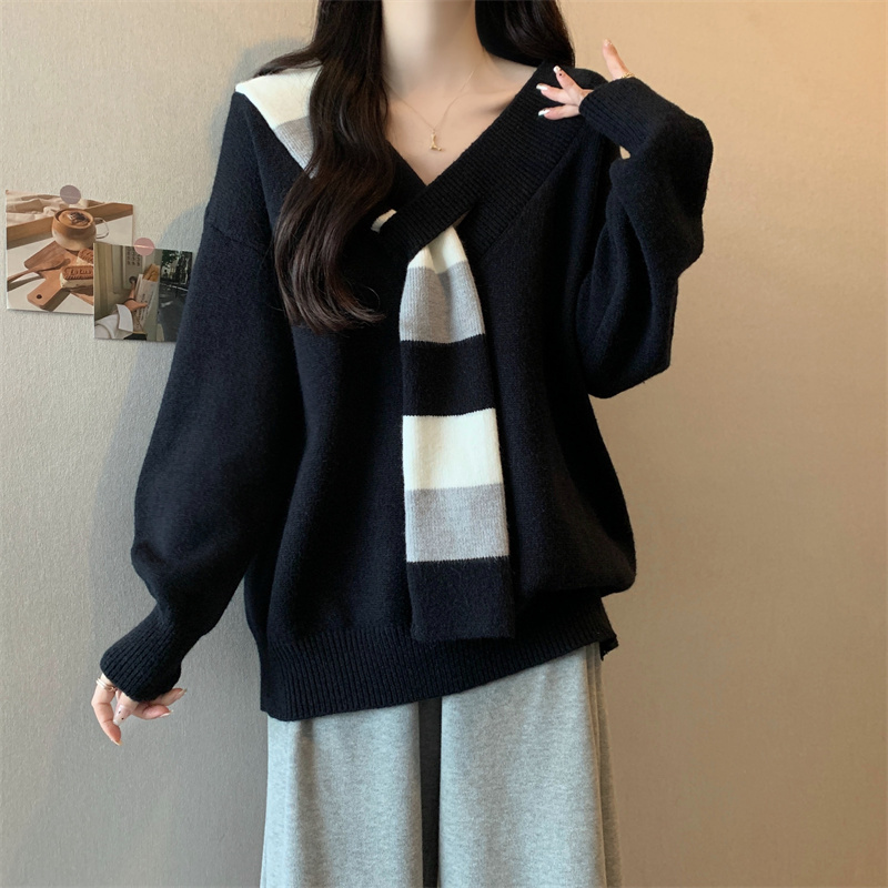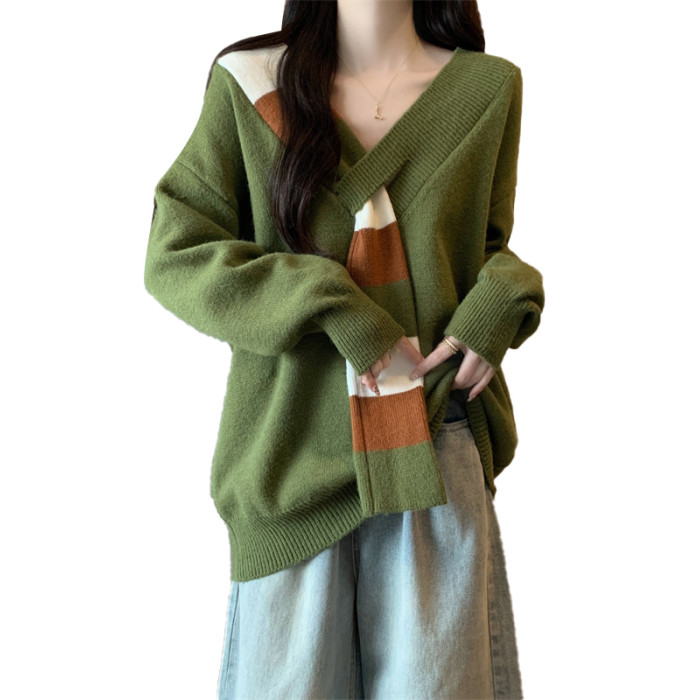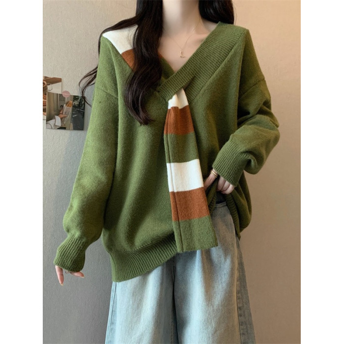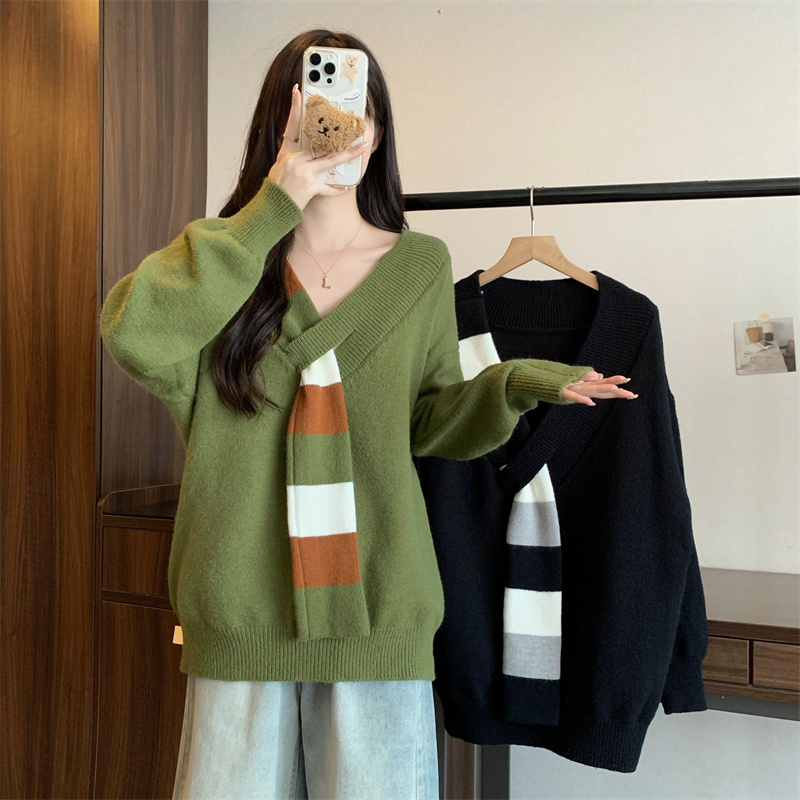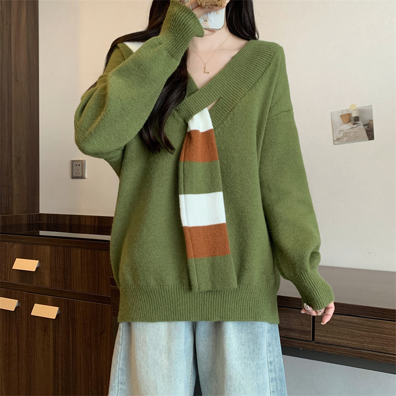 2025秋冬新款韓系綠色V領毛衣上衣大碼女裝胖mm寬松慵懶風針織衫