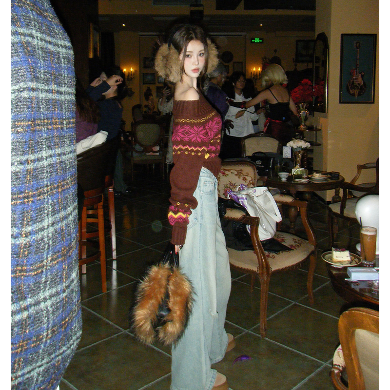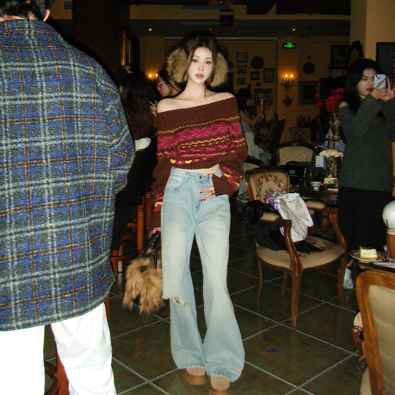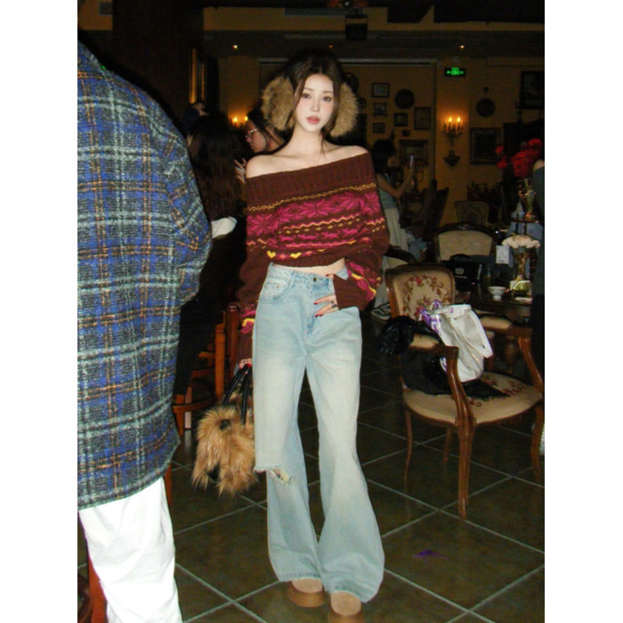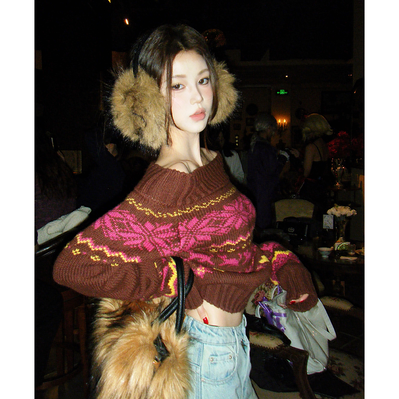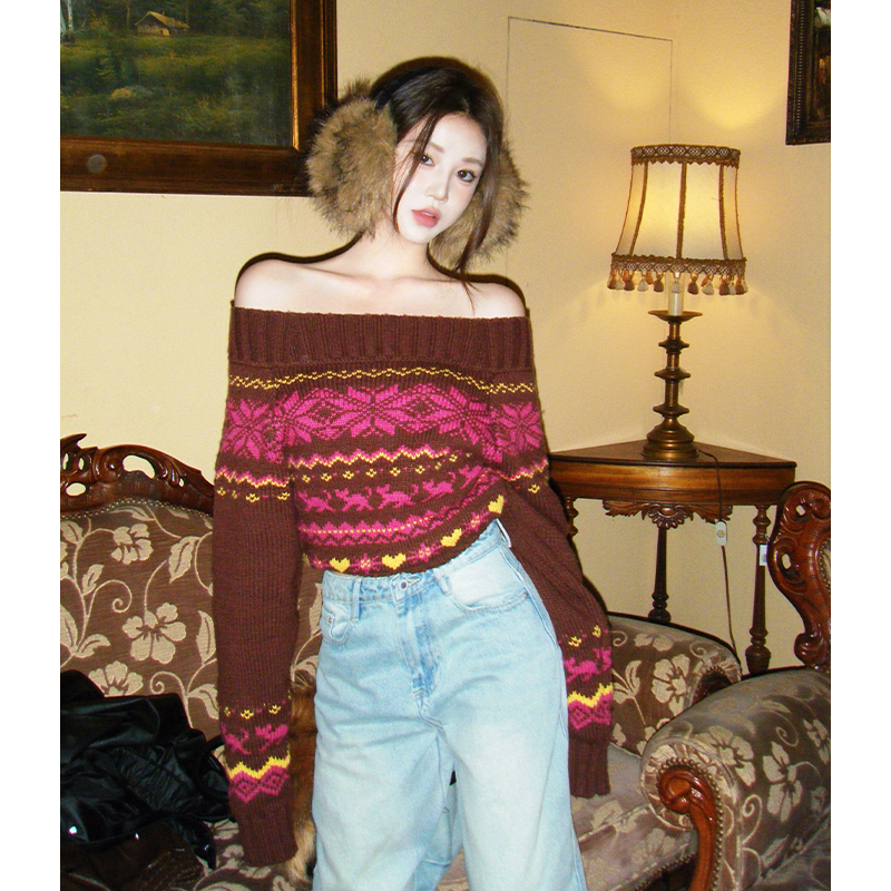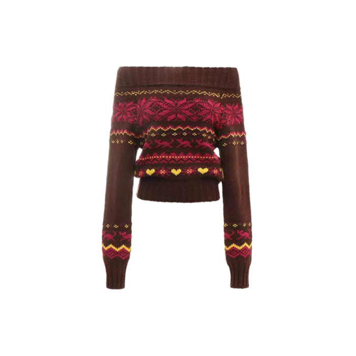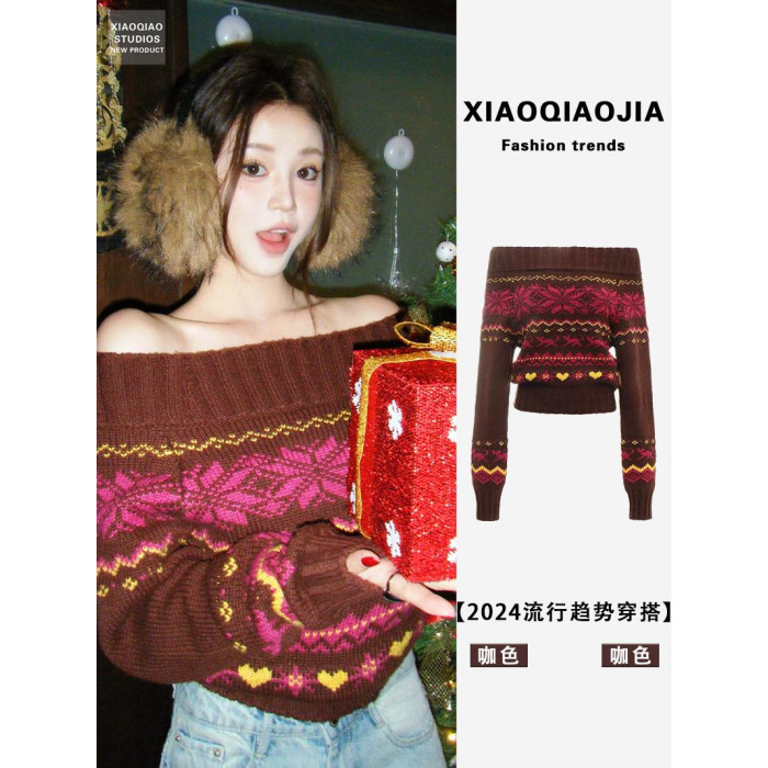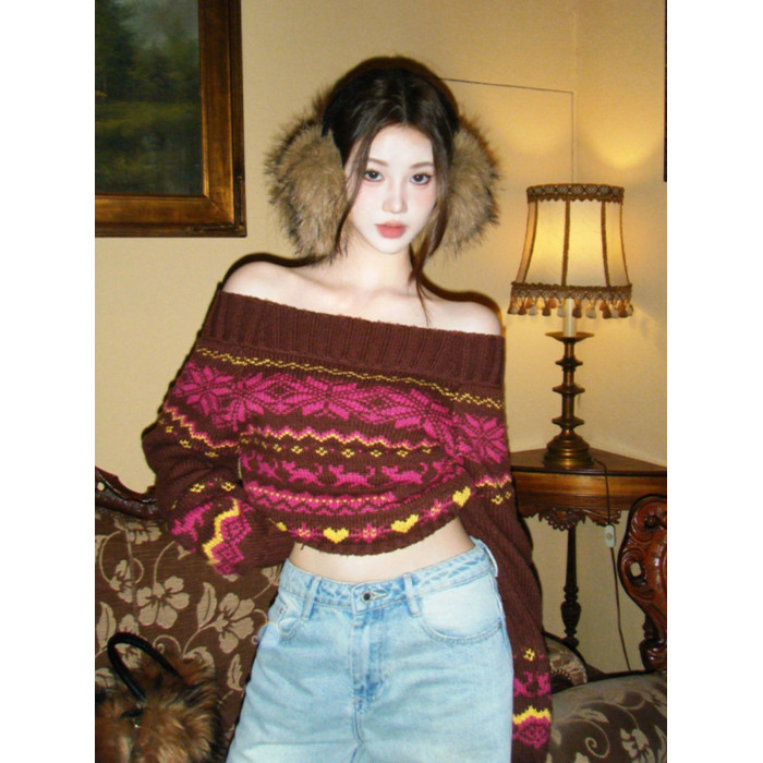 聖誕節穿搭紅色一字肩套頭毛衣女冬季新款別致絕美辣妹露肩短上衣