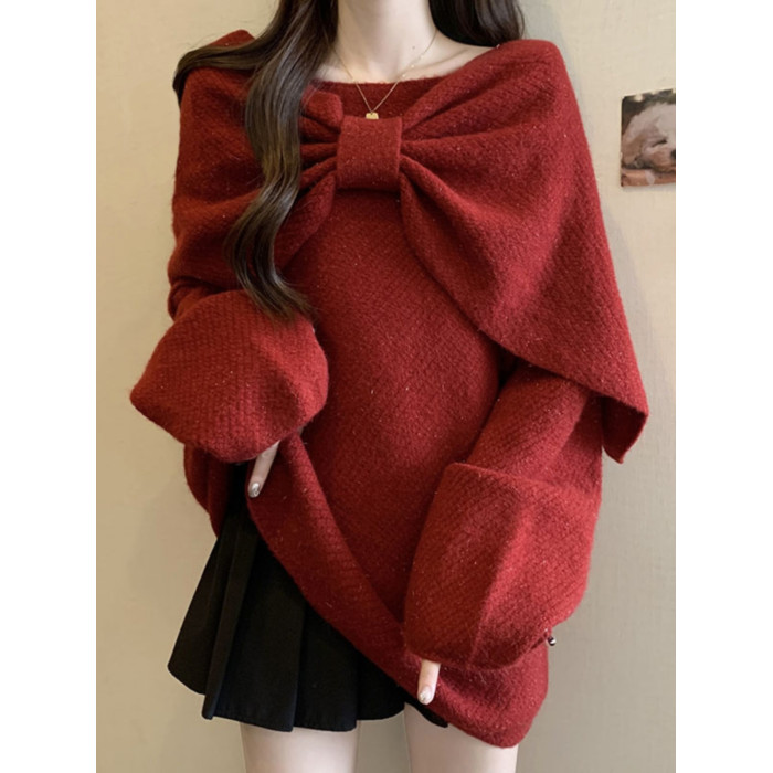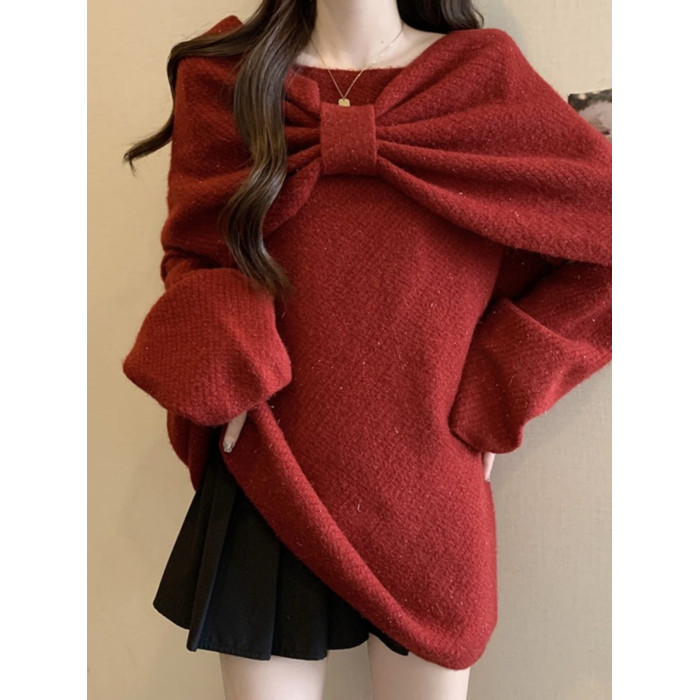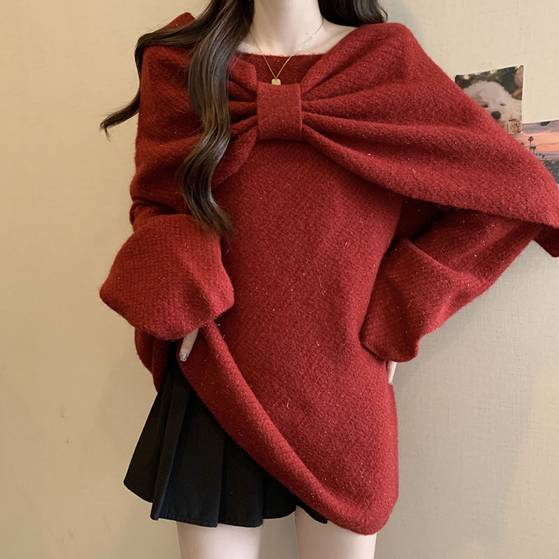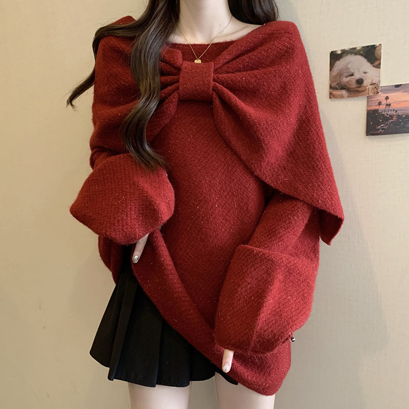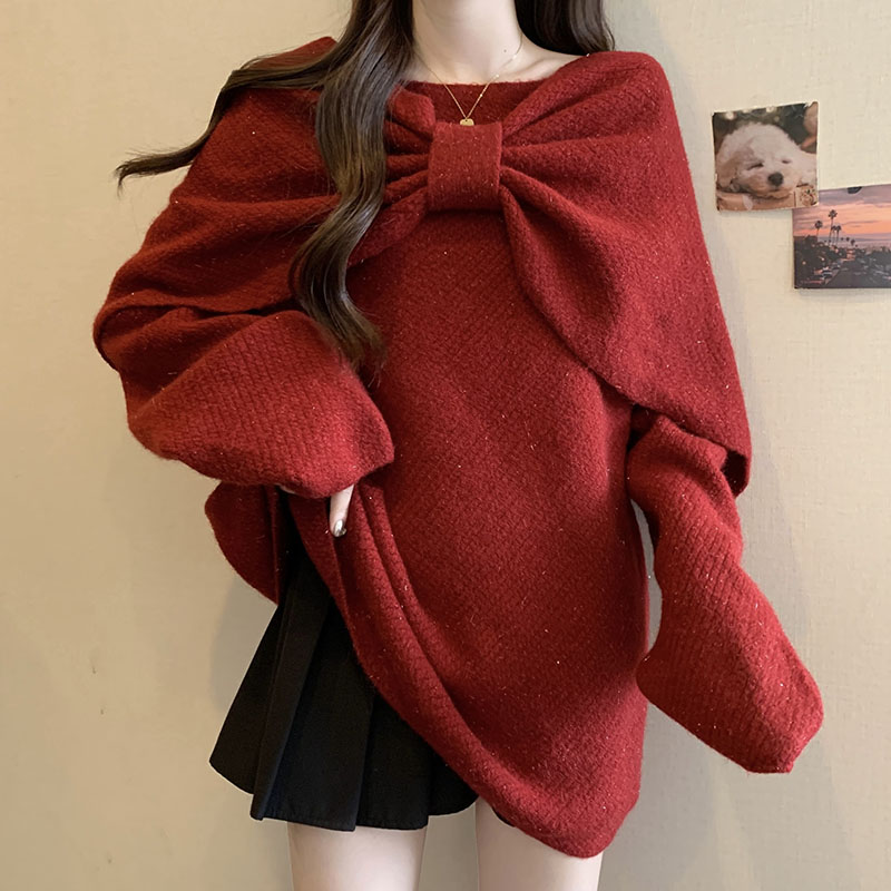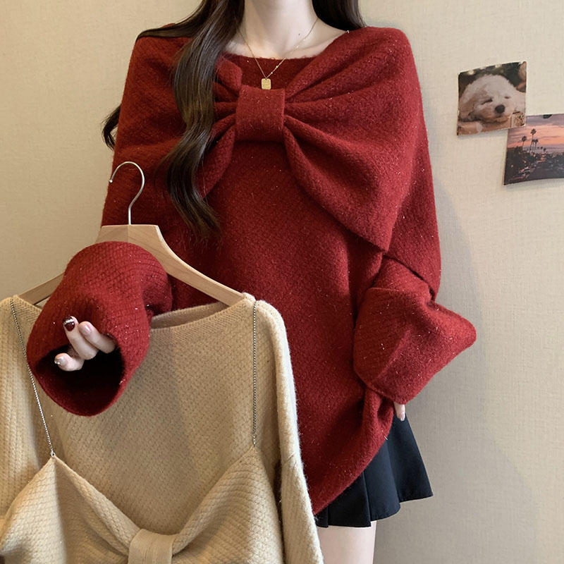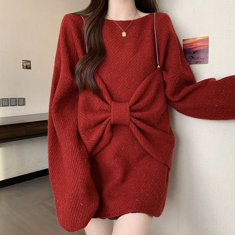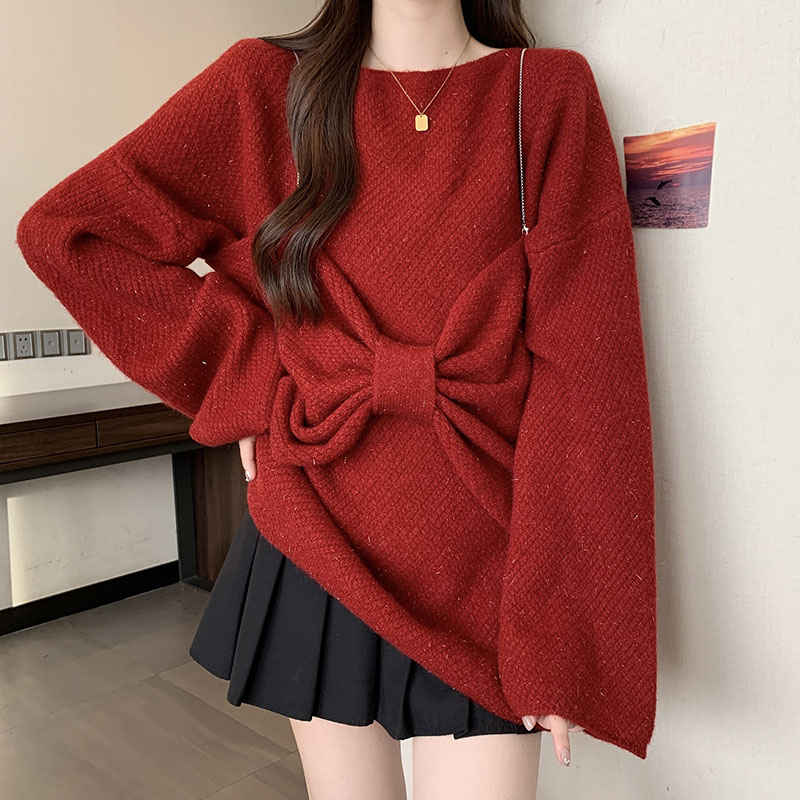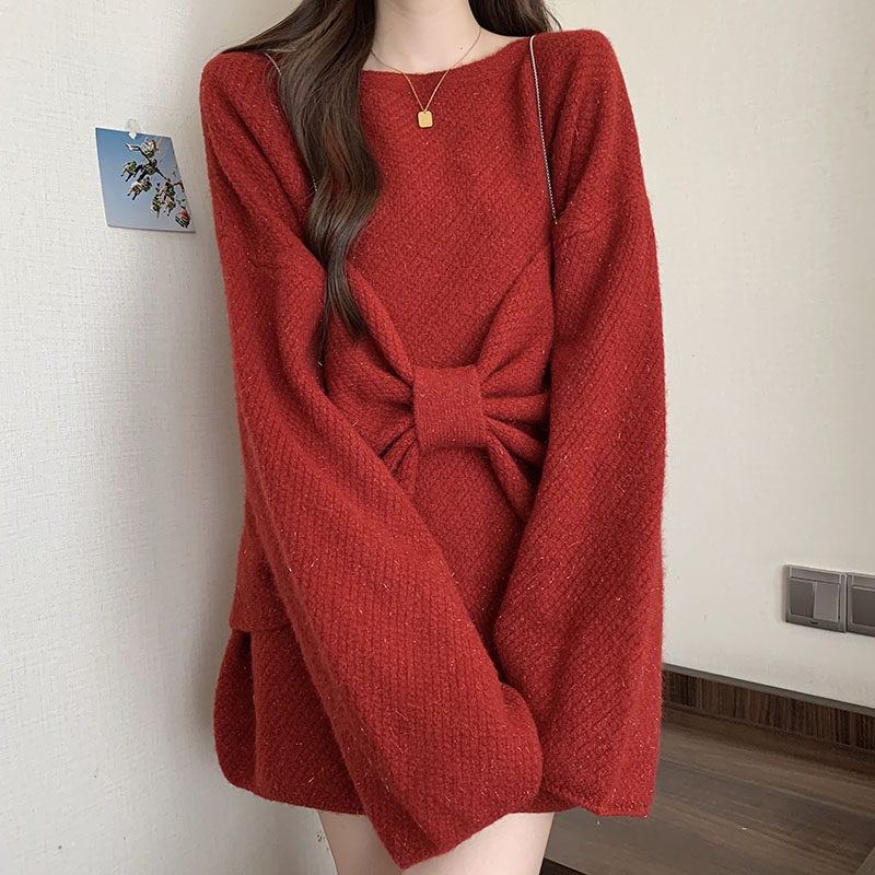 蝴蝶結紅色亮絲針織衫毛衣大碼女裝2025秋季胖mm中長款上衣兩件套