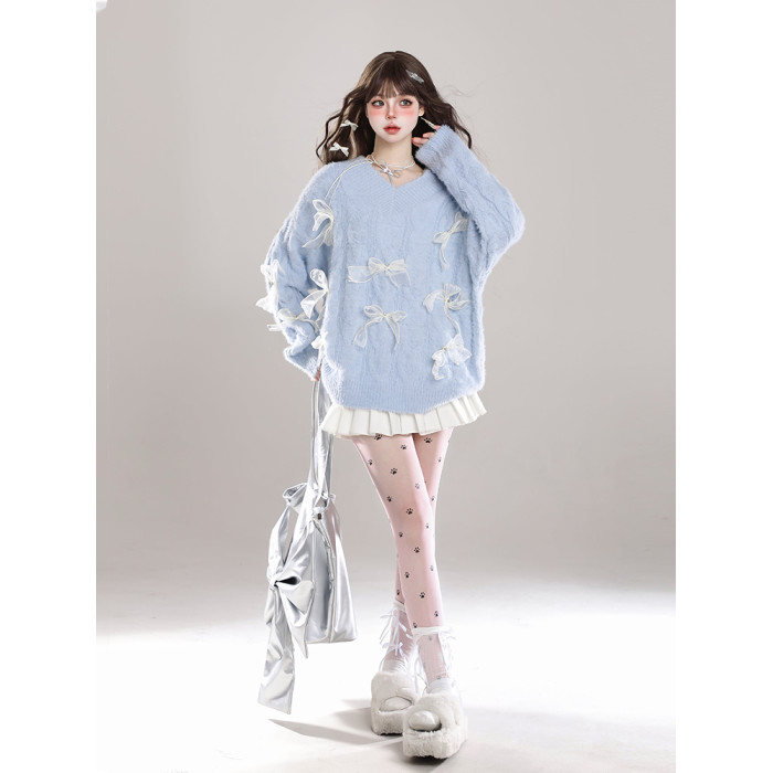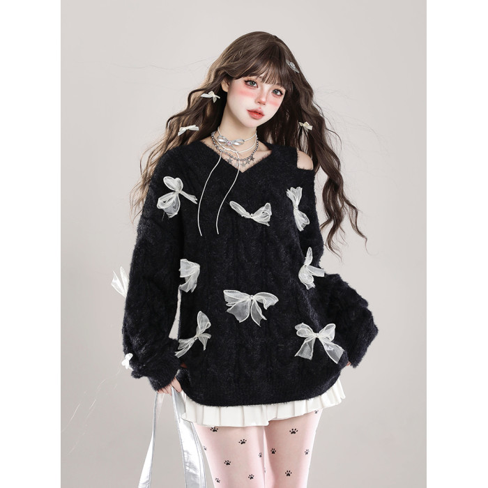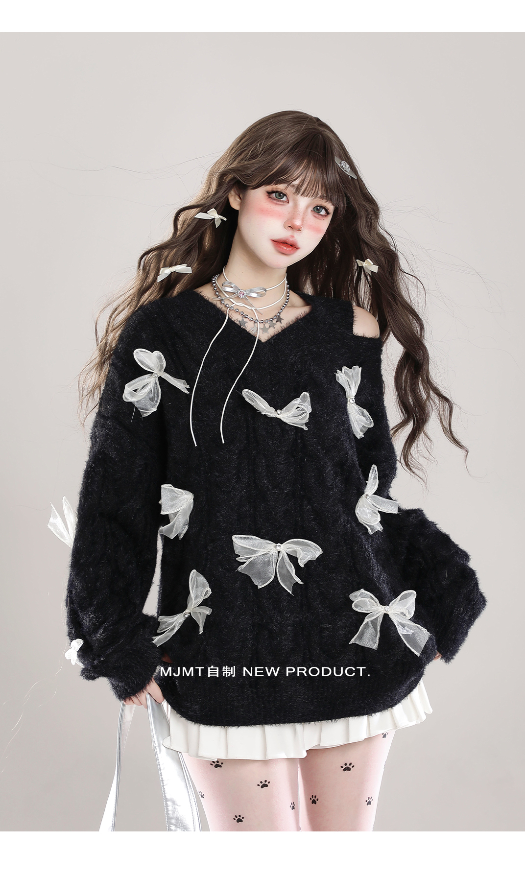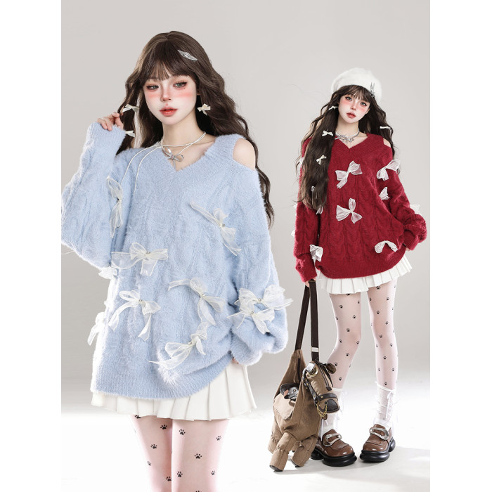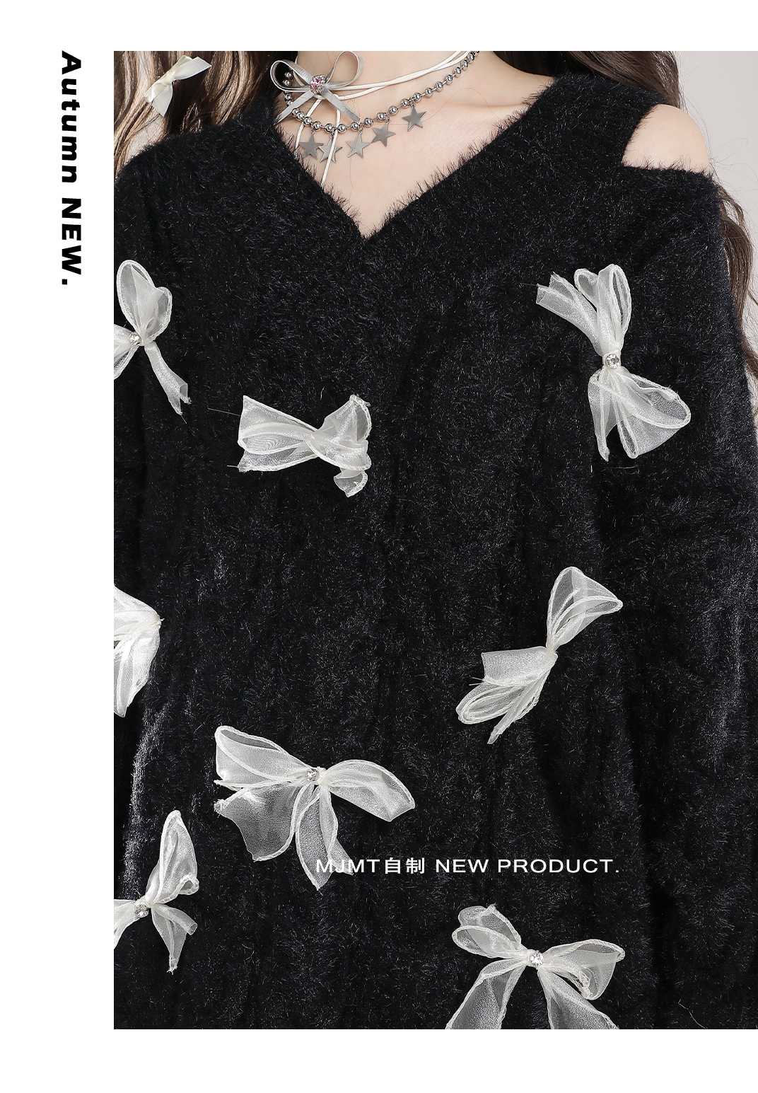 甜美軟糯露肩蝴蝶結v領毛衣女秋冬穿搭設計感慵懶chic甜辣針織衫