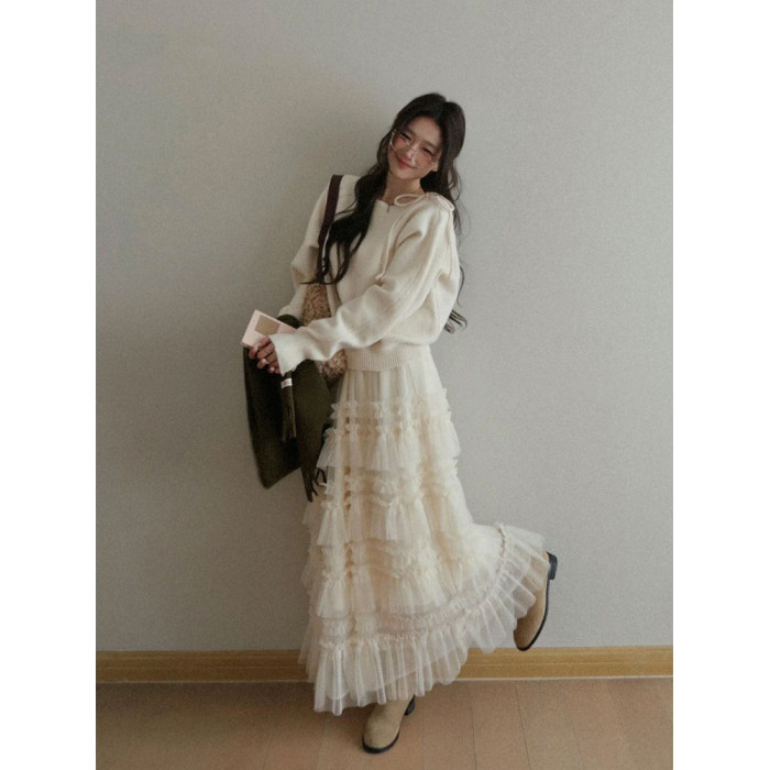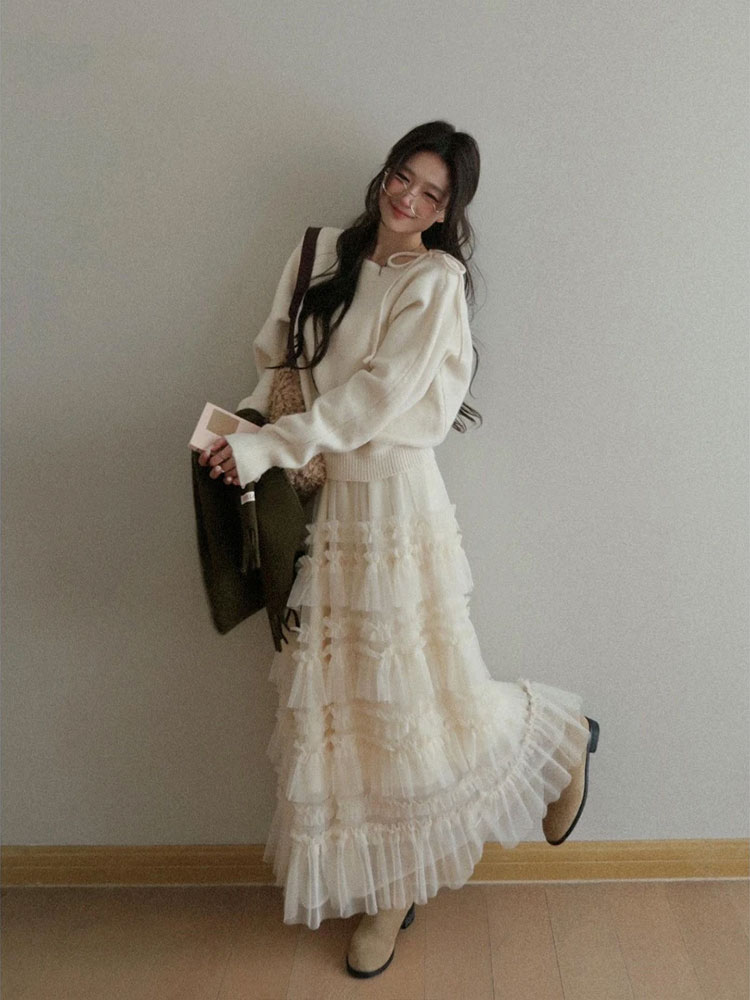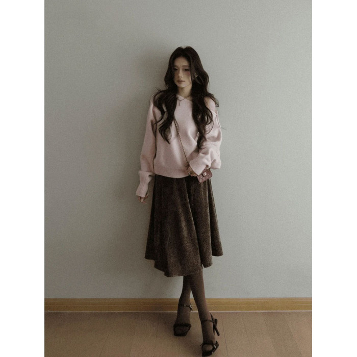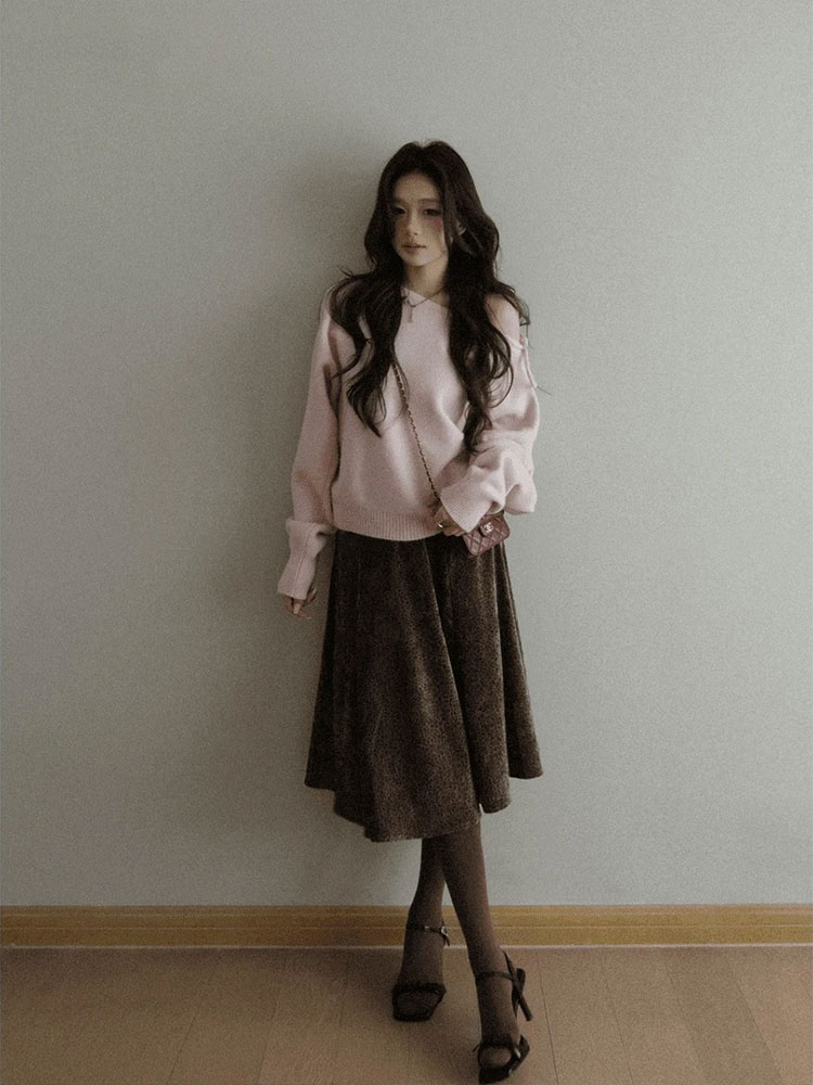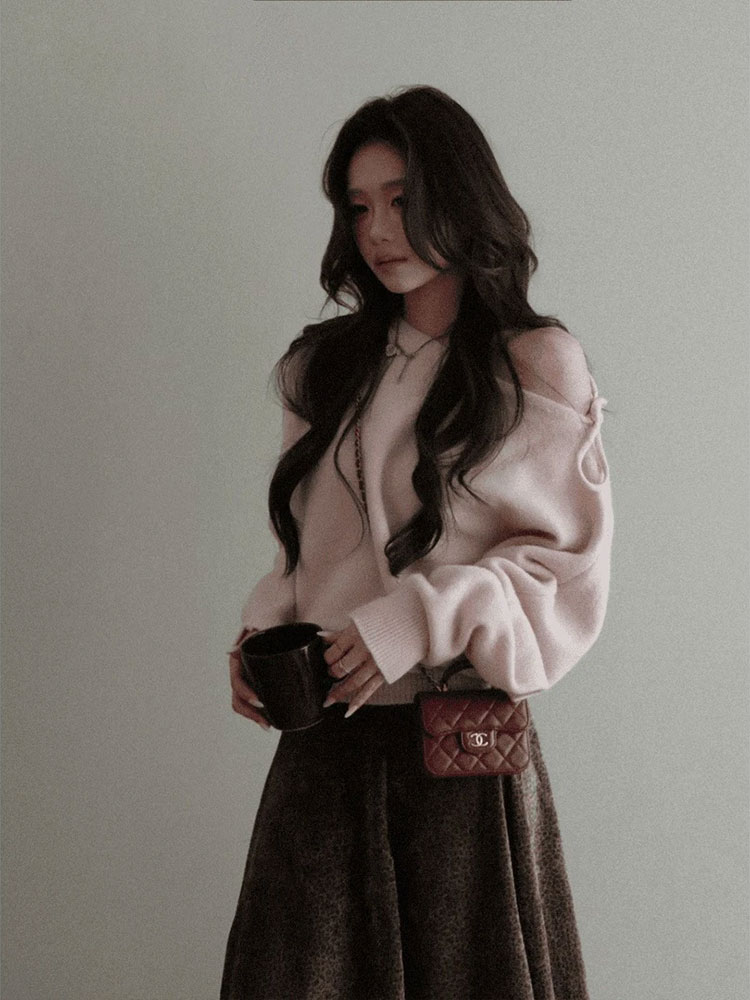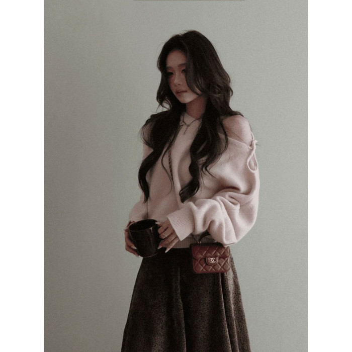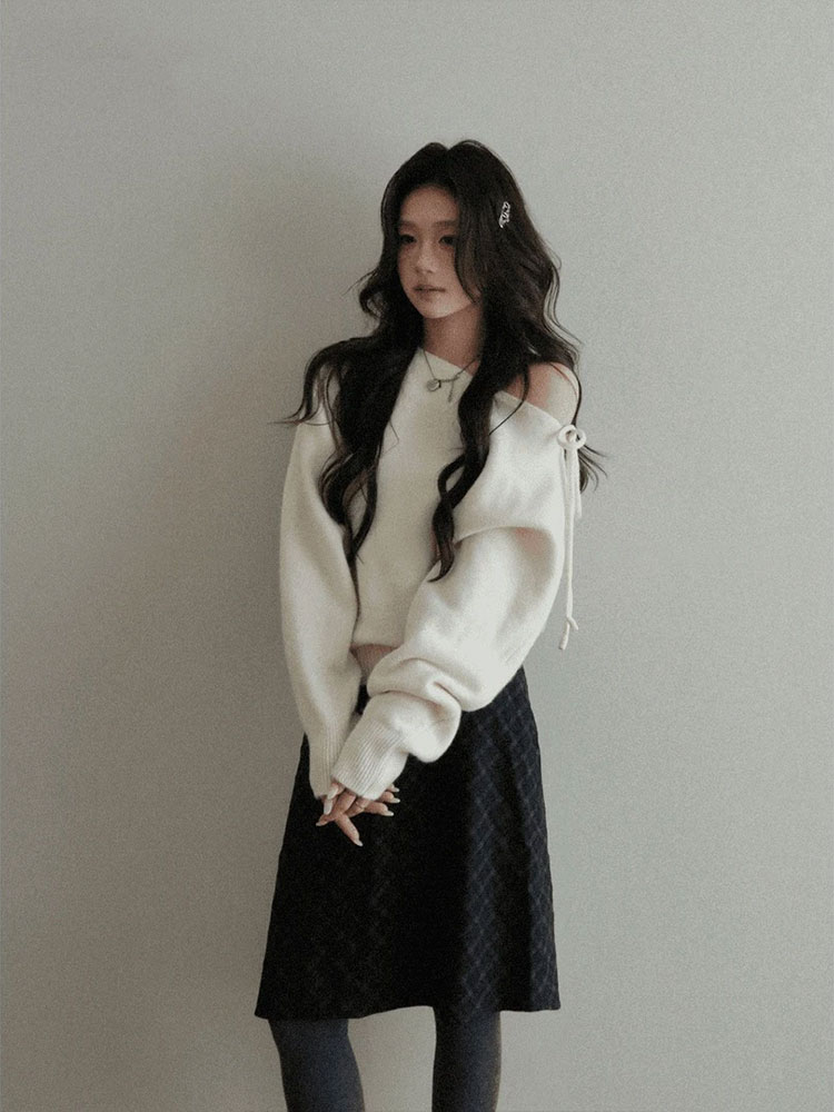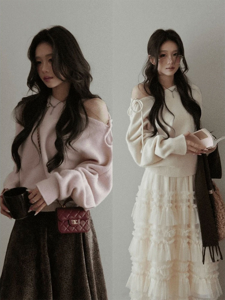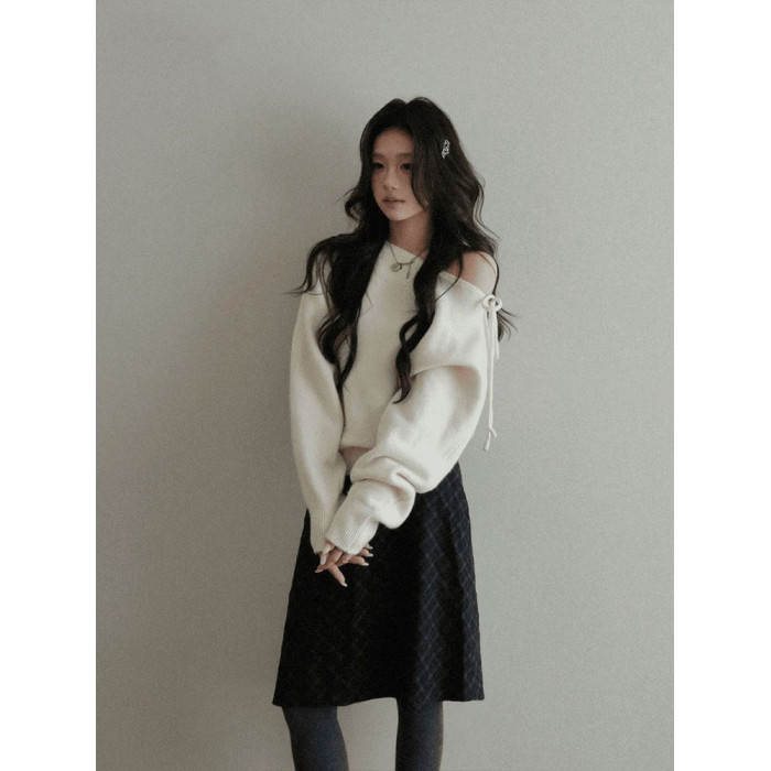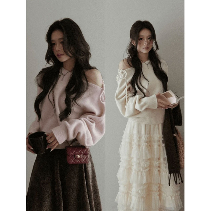 韓系溫柔風斜肩系帶針織衫女秋冬獨特漂亮氛圍感寬松顯瘦長袖上衣