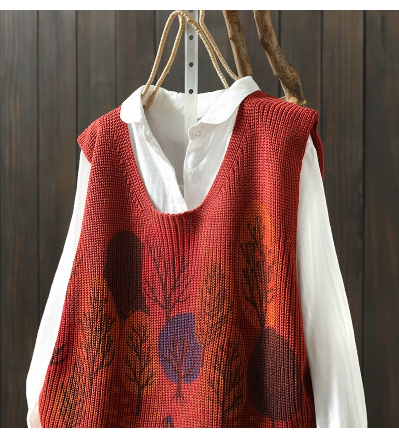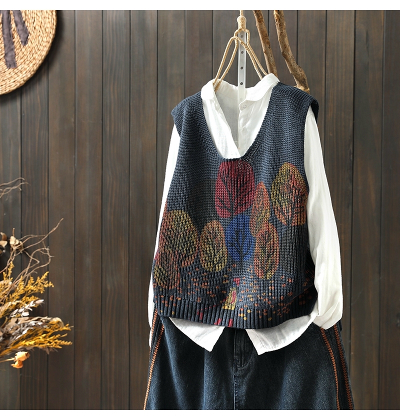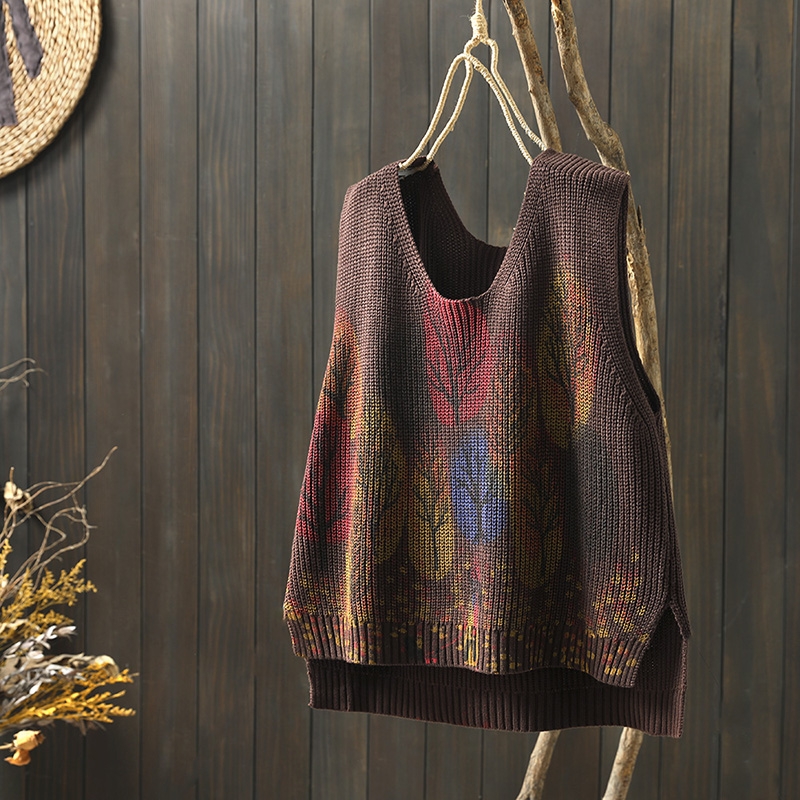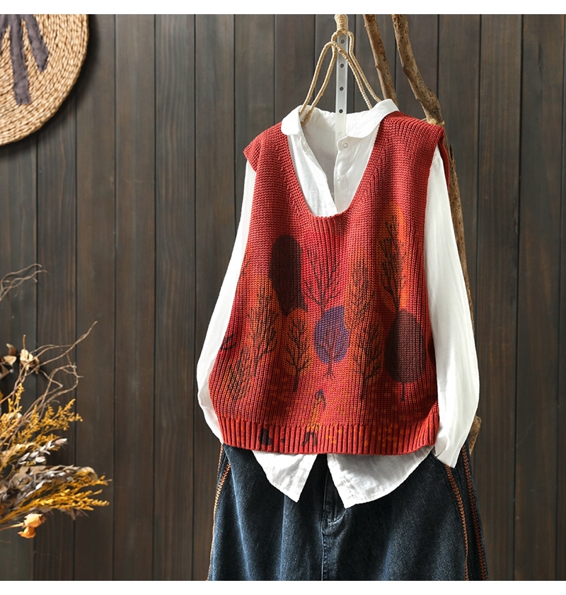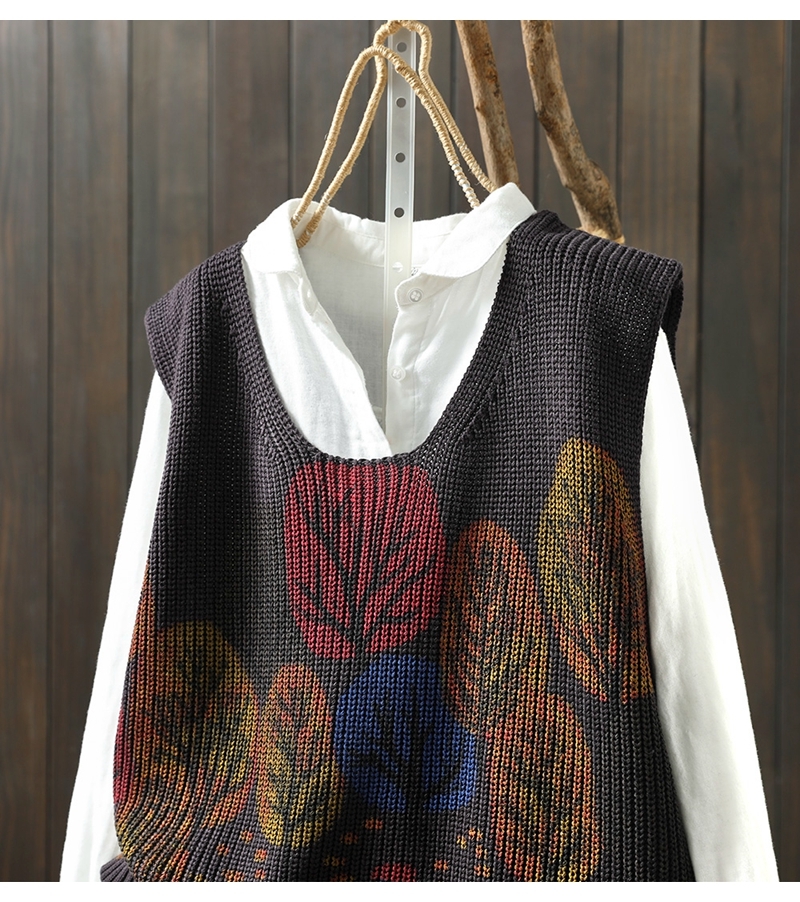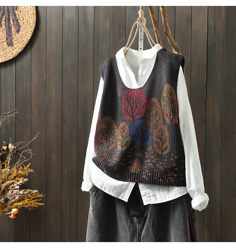 文藝復古印花棉線針織馬甲寬松女秋冬V領曡穿坎肩上衣毛衣背心潮