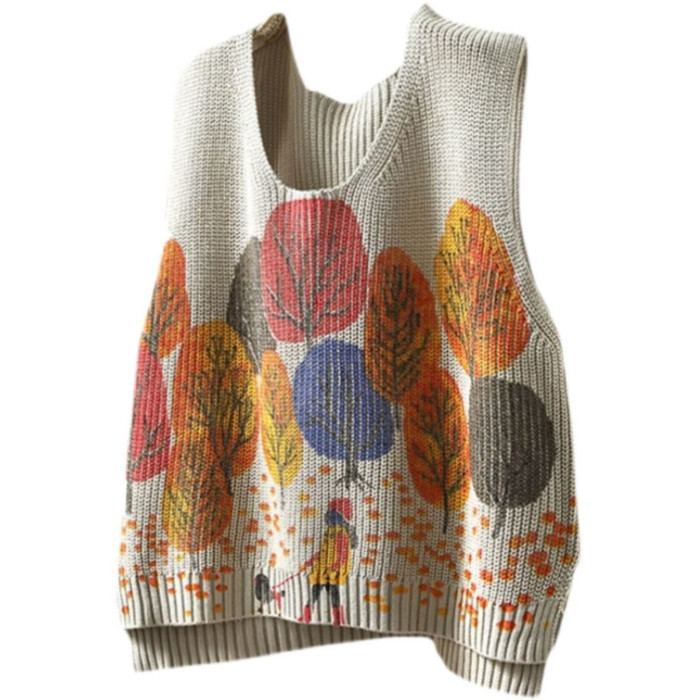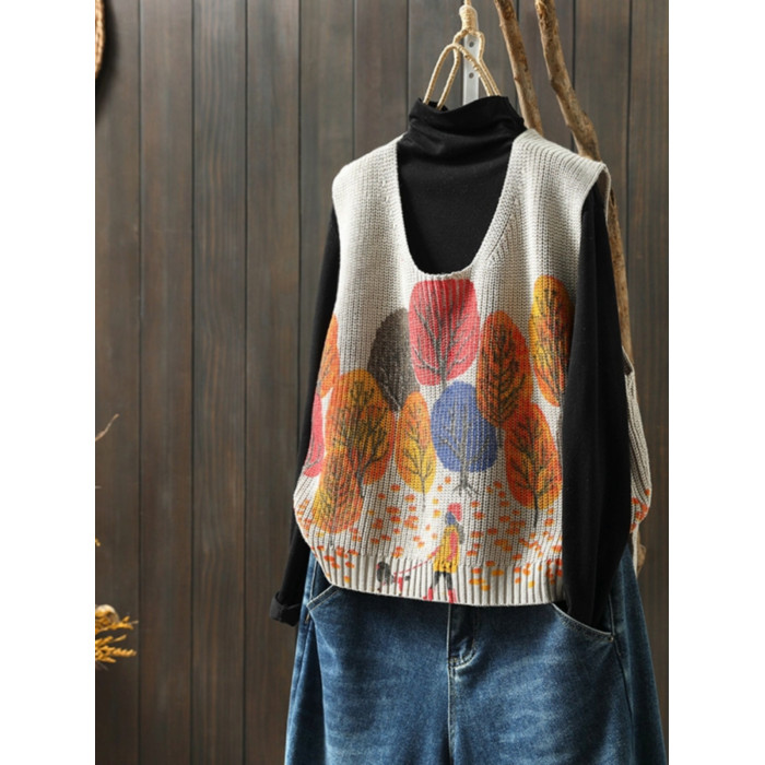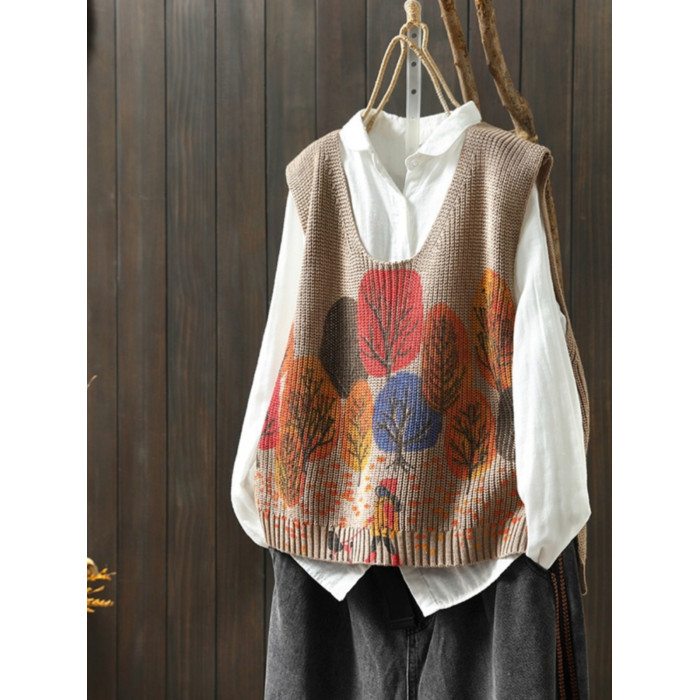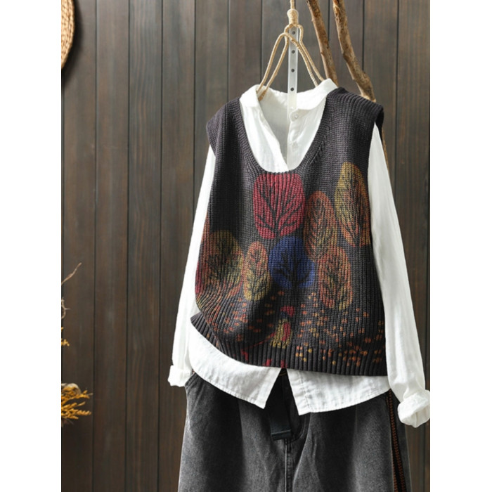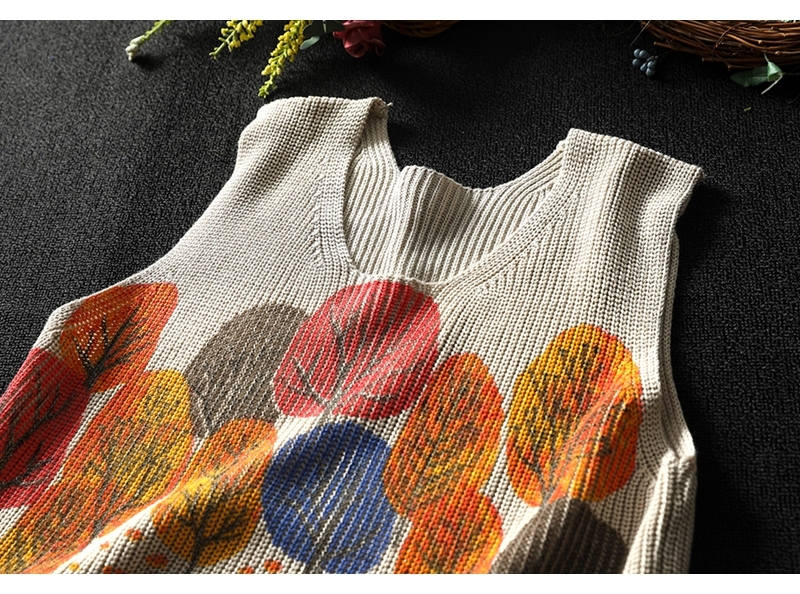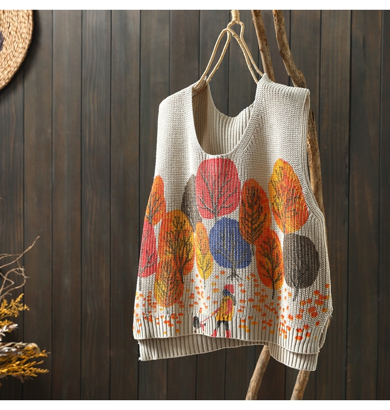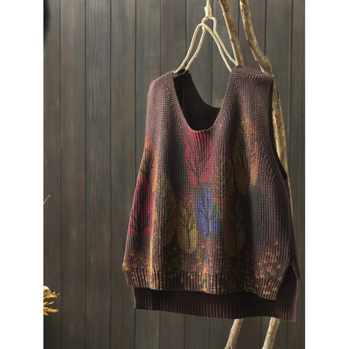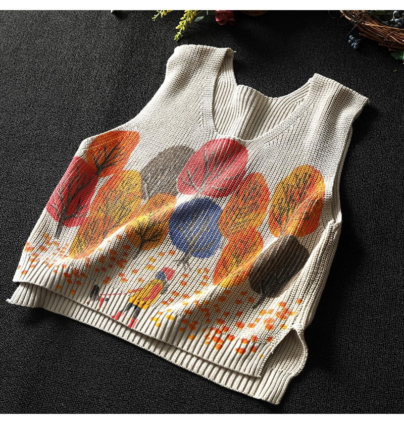 文藝復古印花棉線針織馬甲寬松女秋冬V領曡穿坎肩上衣毛衣背心潮