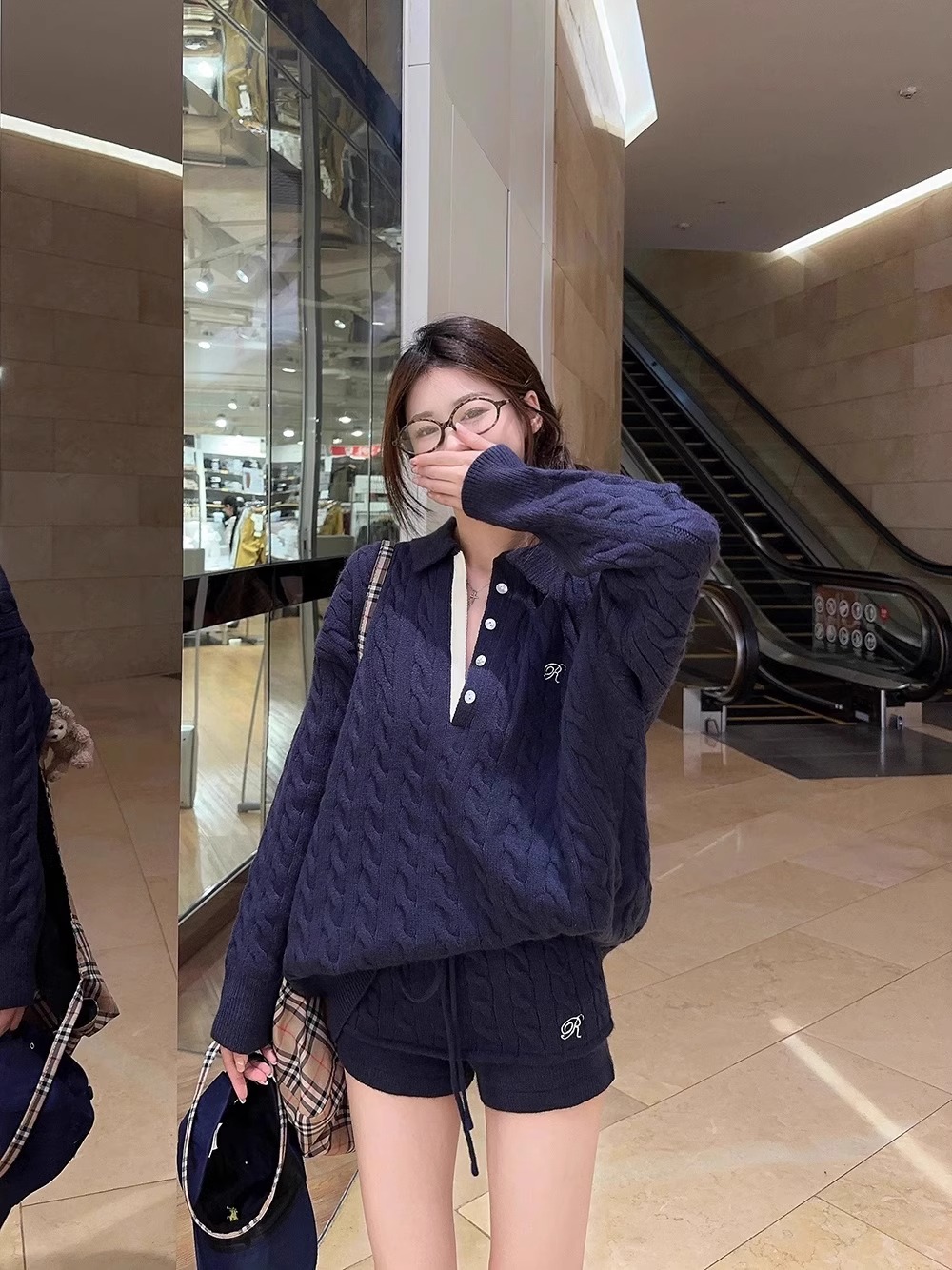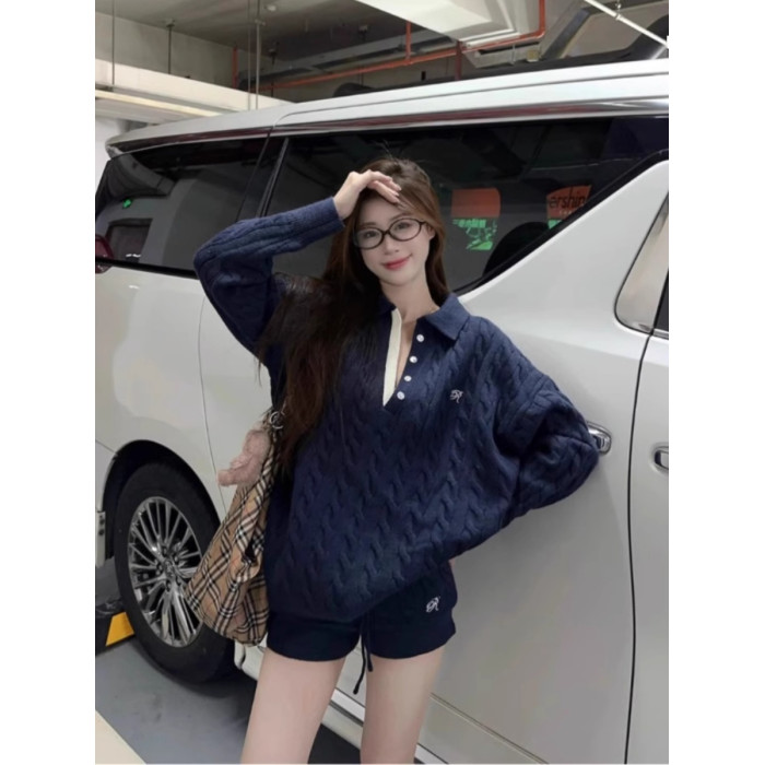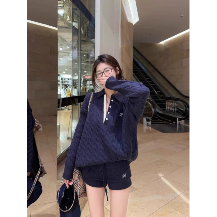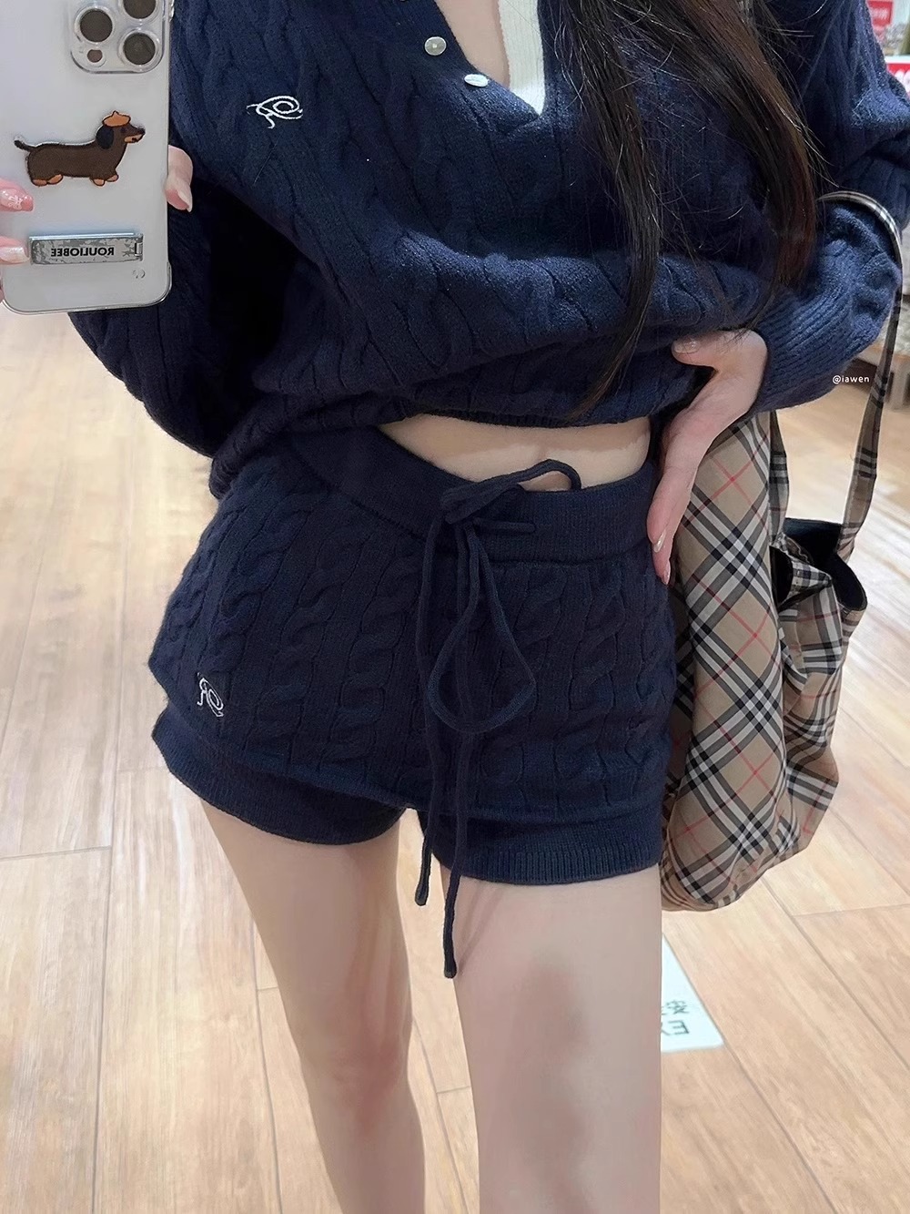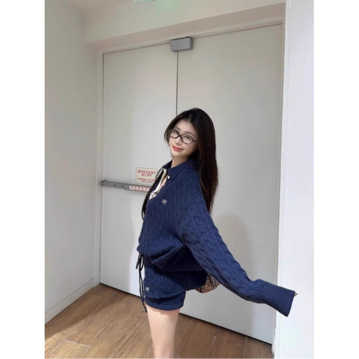 休閒套裝女藏青色翻領麻花針織毛衣秋冬松緊腰包臀短褲辣妹兩件套