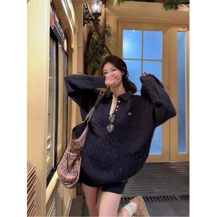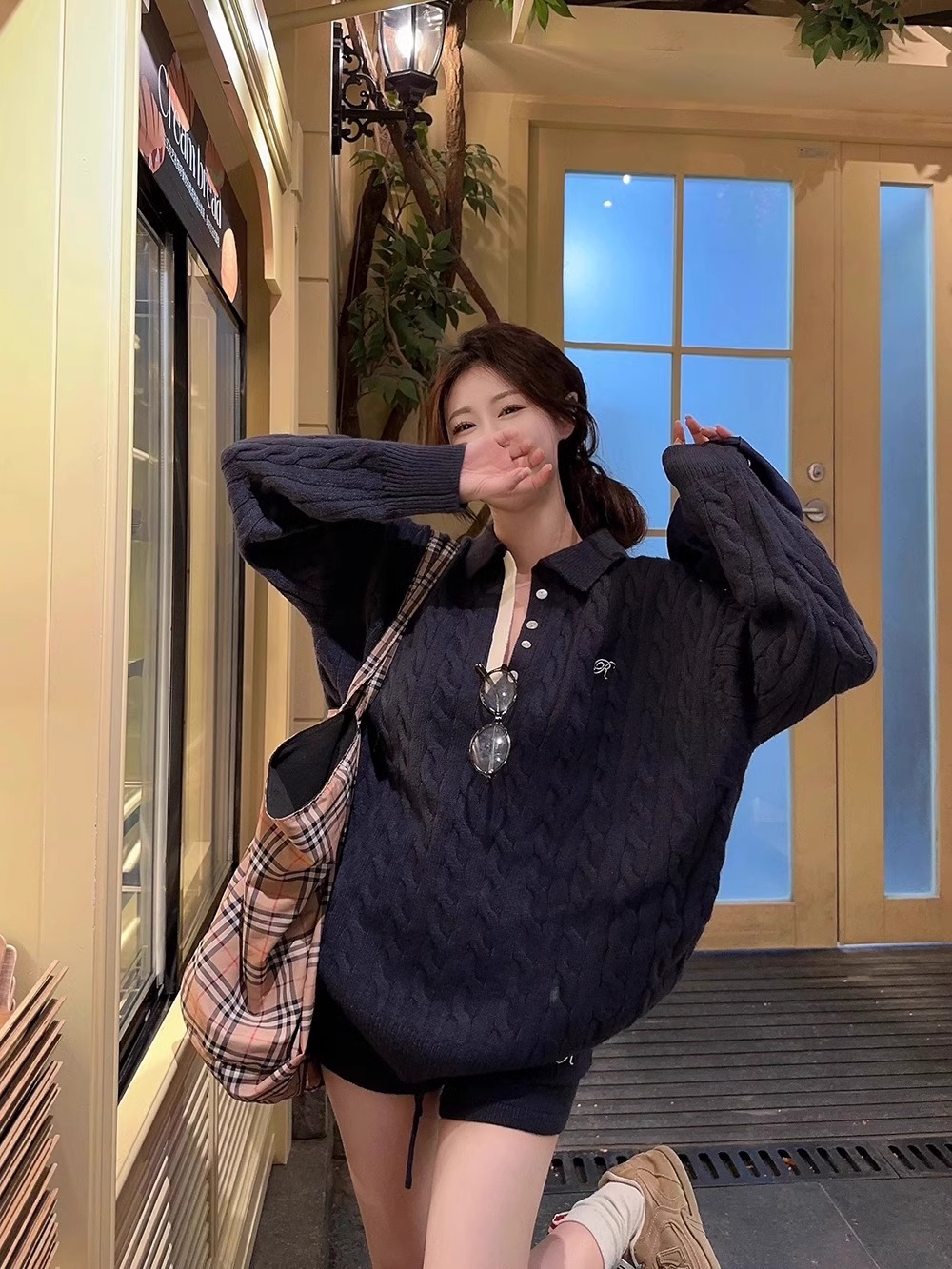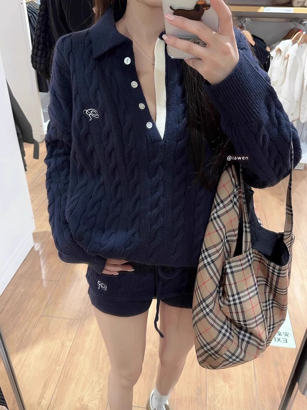休閒套裝女藏青色翻領麻花針織毛衣秋冬松緊腰包臀短褲辣妹兩件套