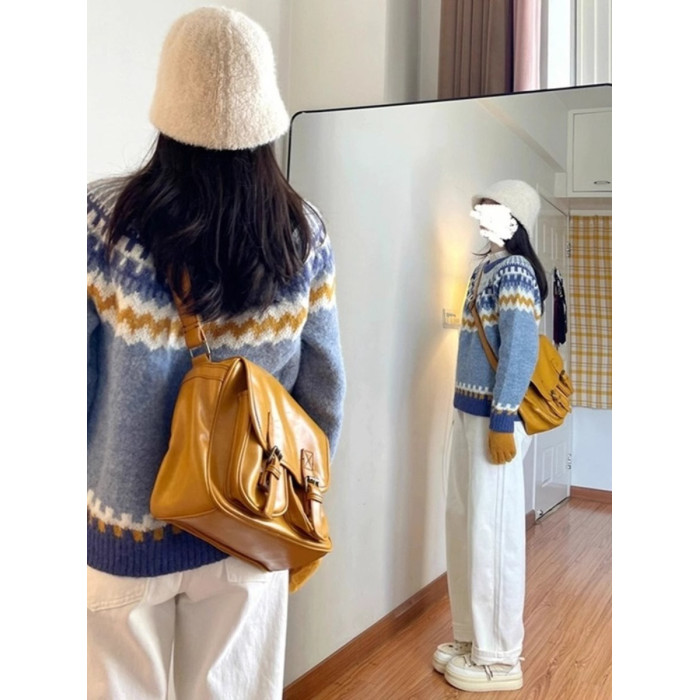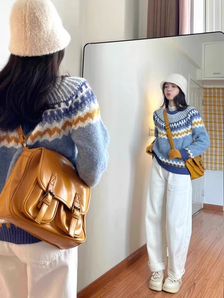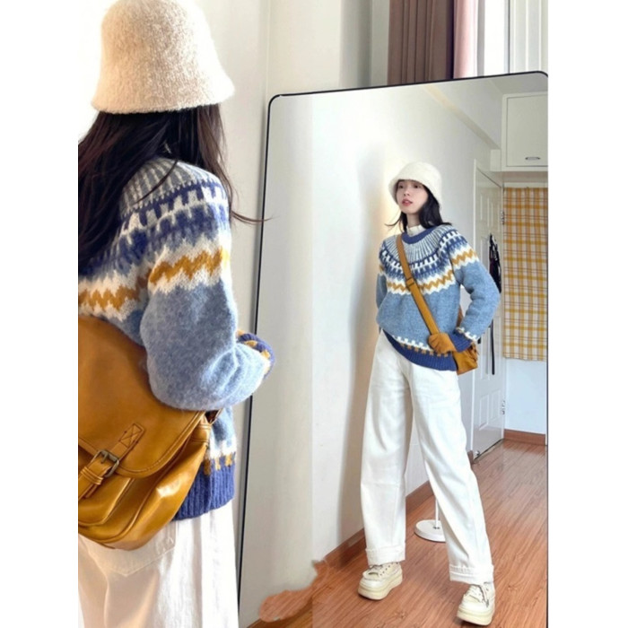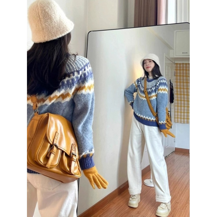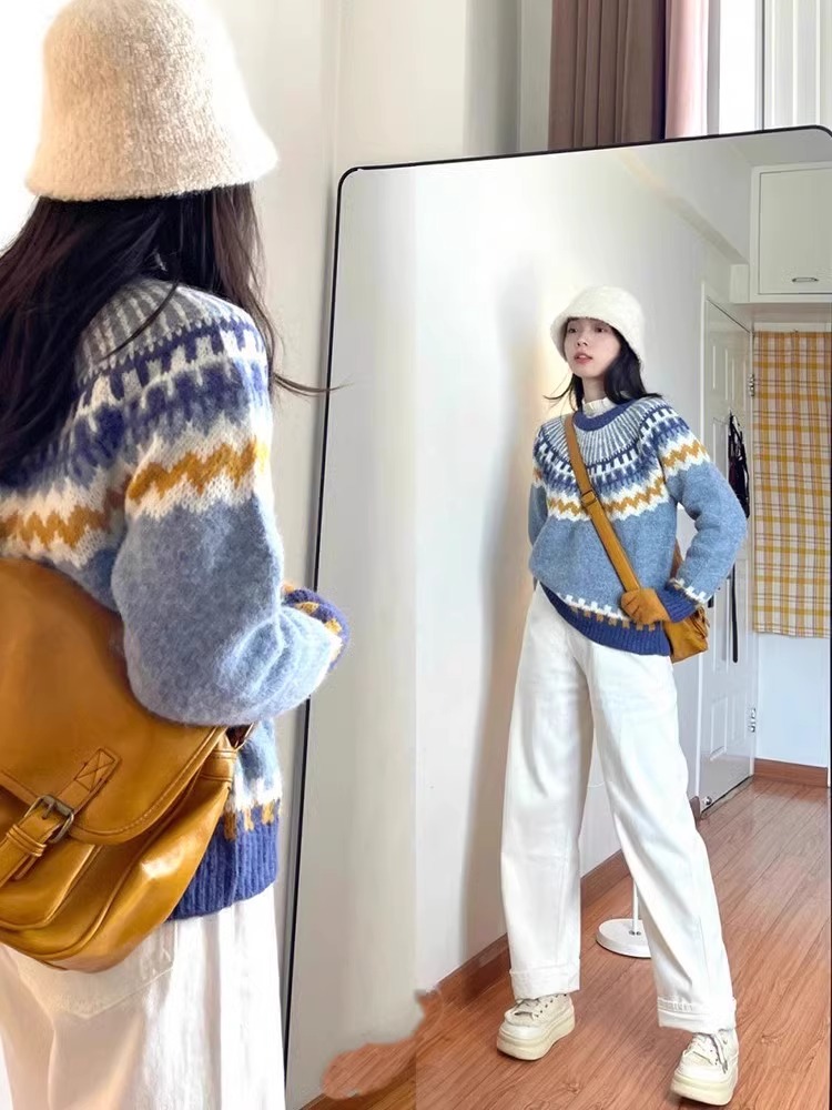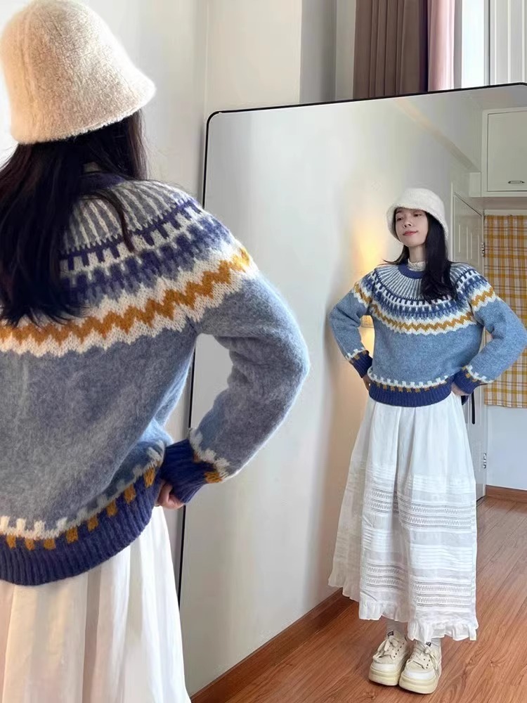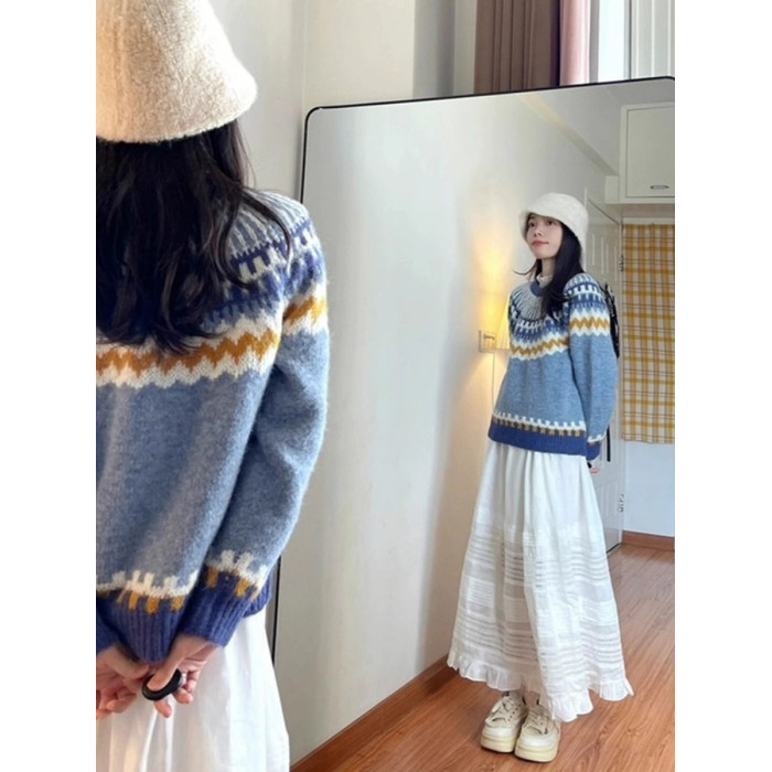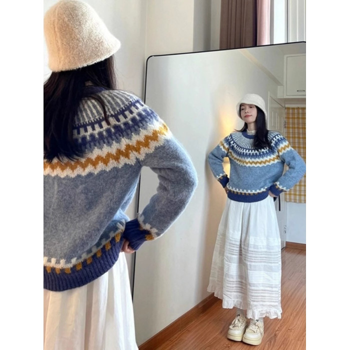 日系復古藍色費爾島馬海毛毛衣女秋冬慵懶風套頭針織衫寬松上衣厚