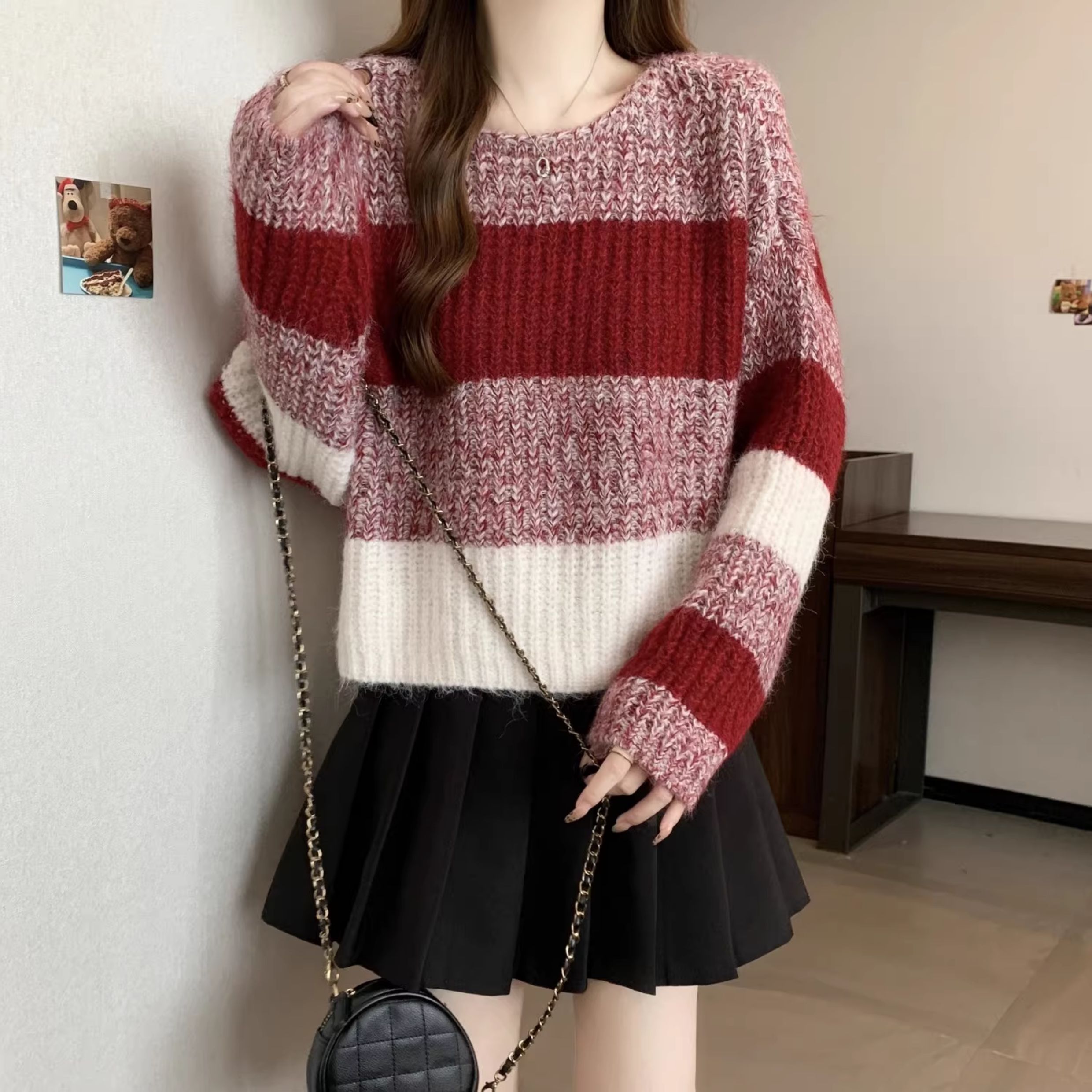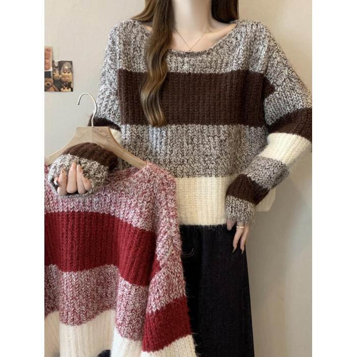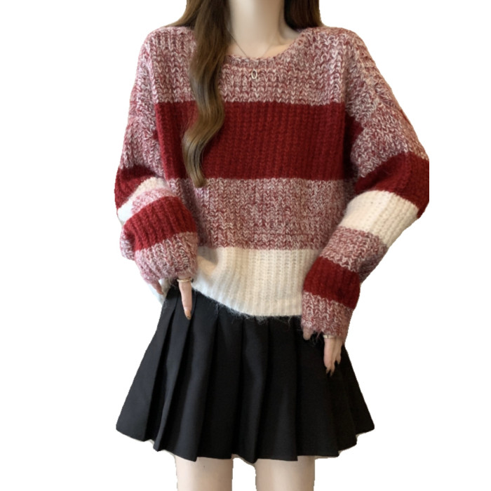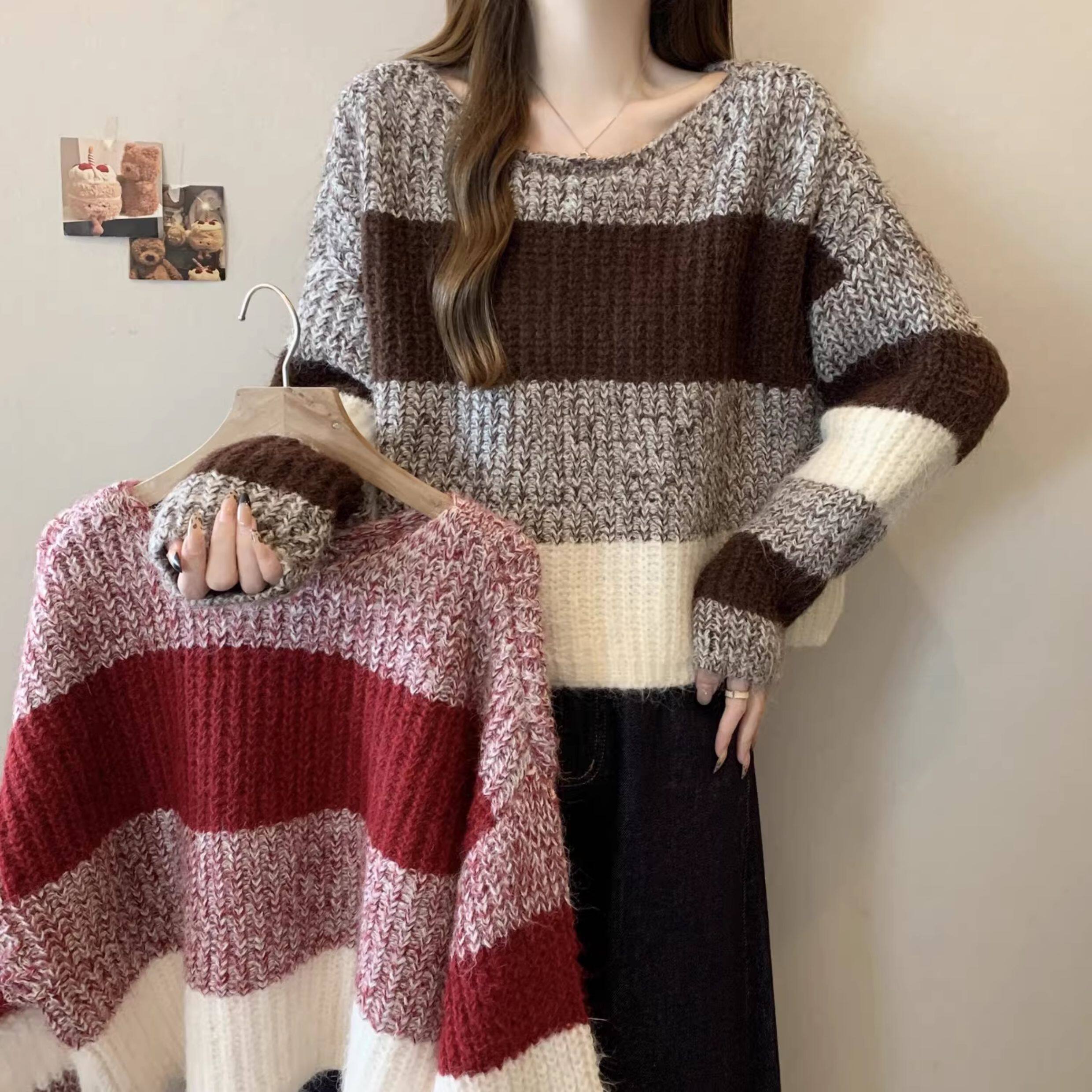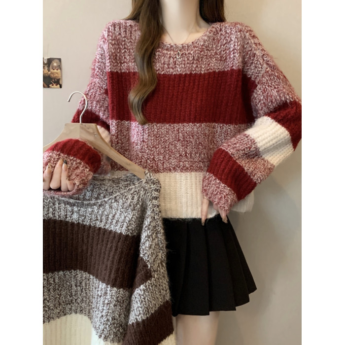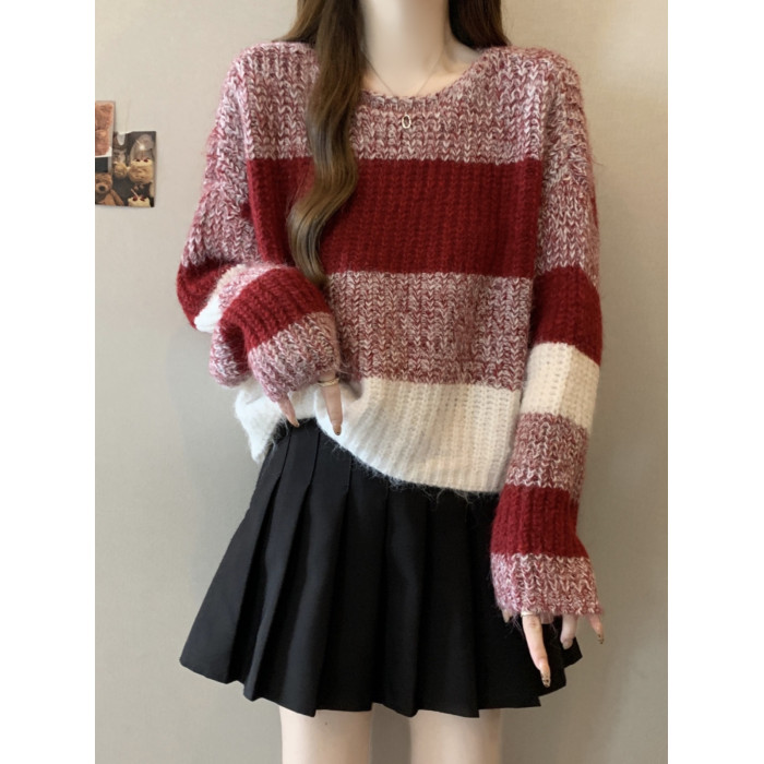 2025秋冬款高級感紅色條紋毛衣大碼女裝胖mm慵懶風套頭針織衫上衣