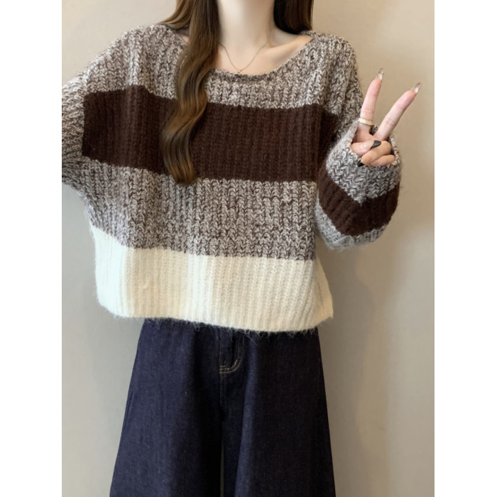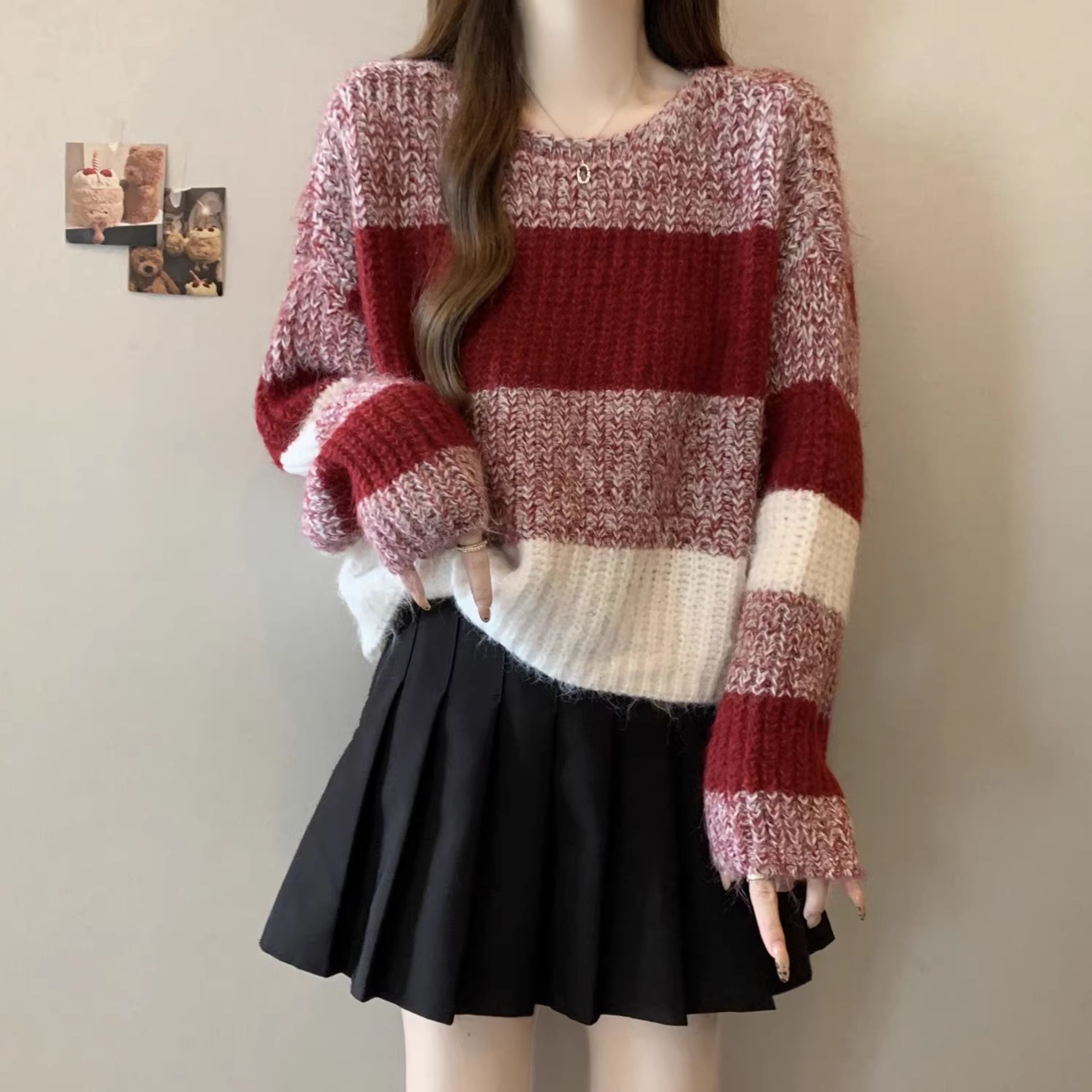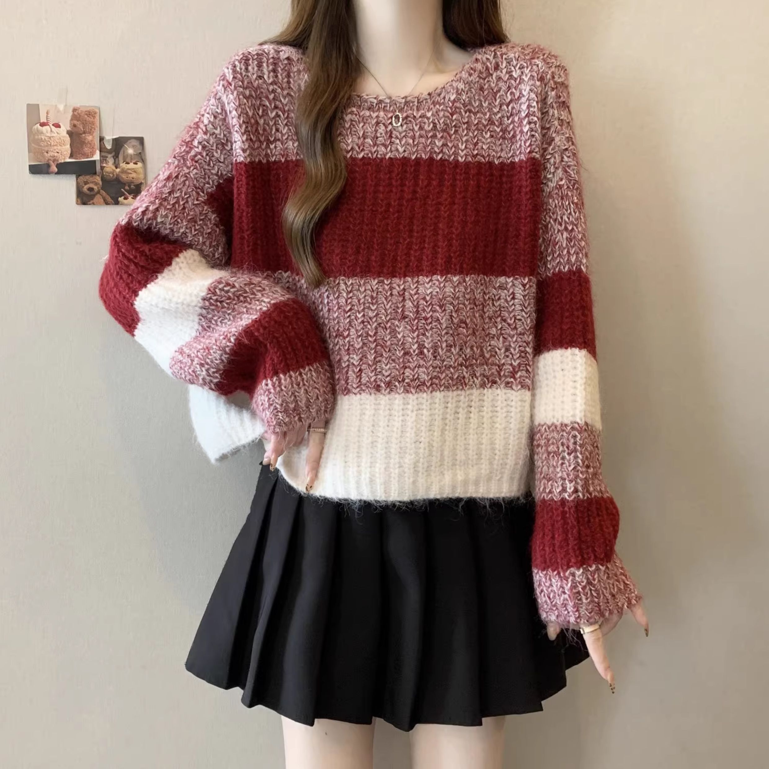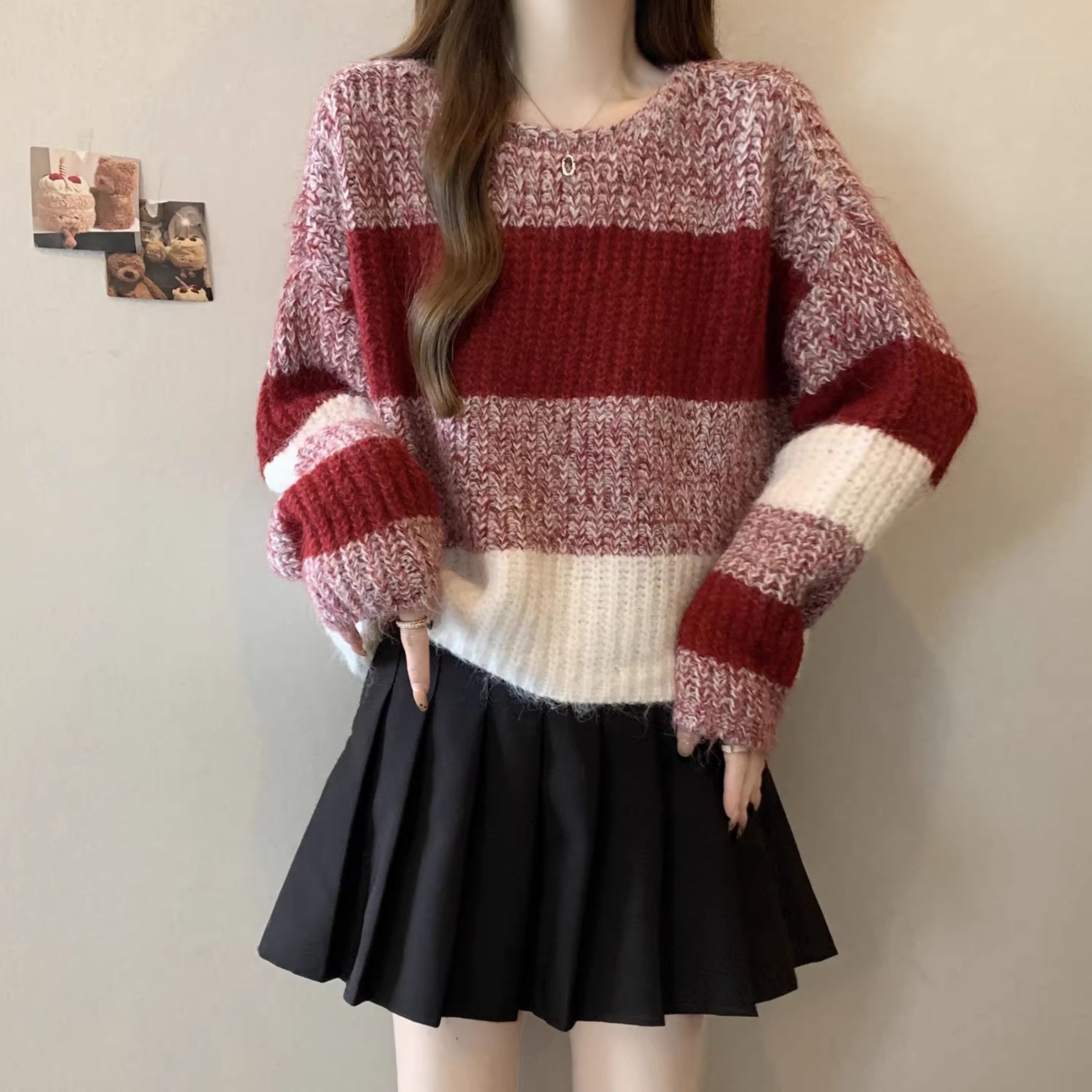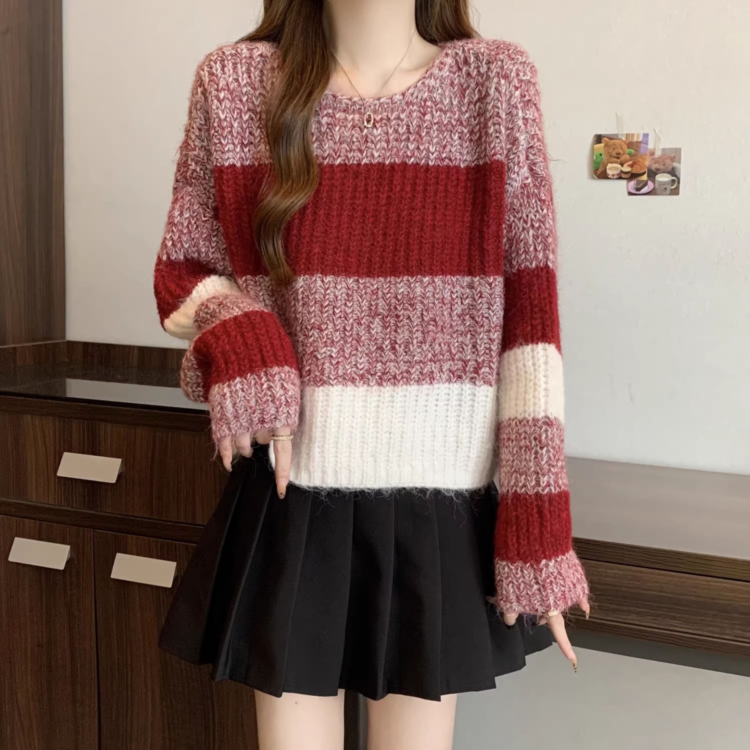 2025秋冬款高級感紅色條紋毛衣大碼女裝胖mm慵懶風套頭針織衫上衣