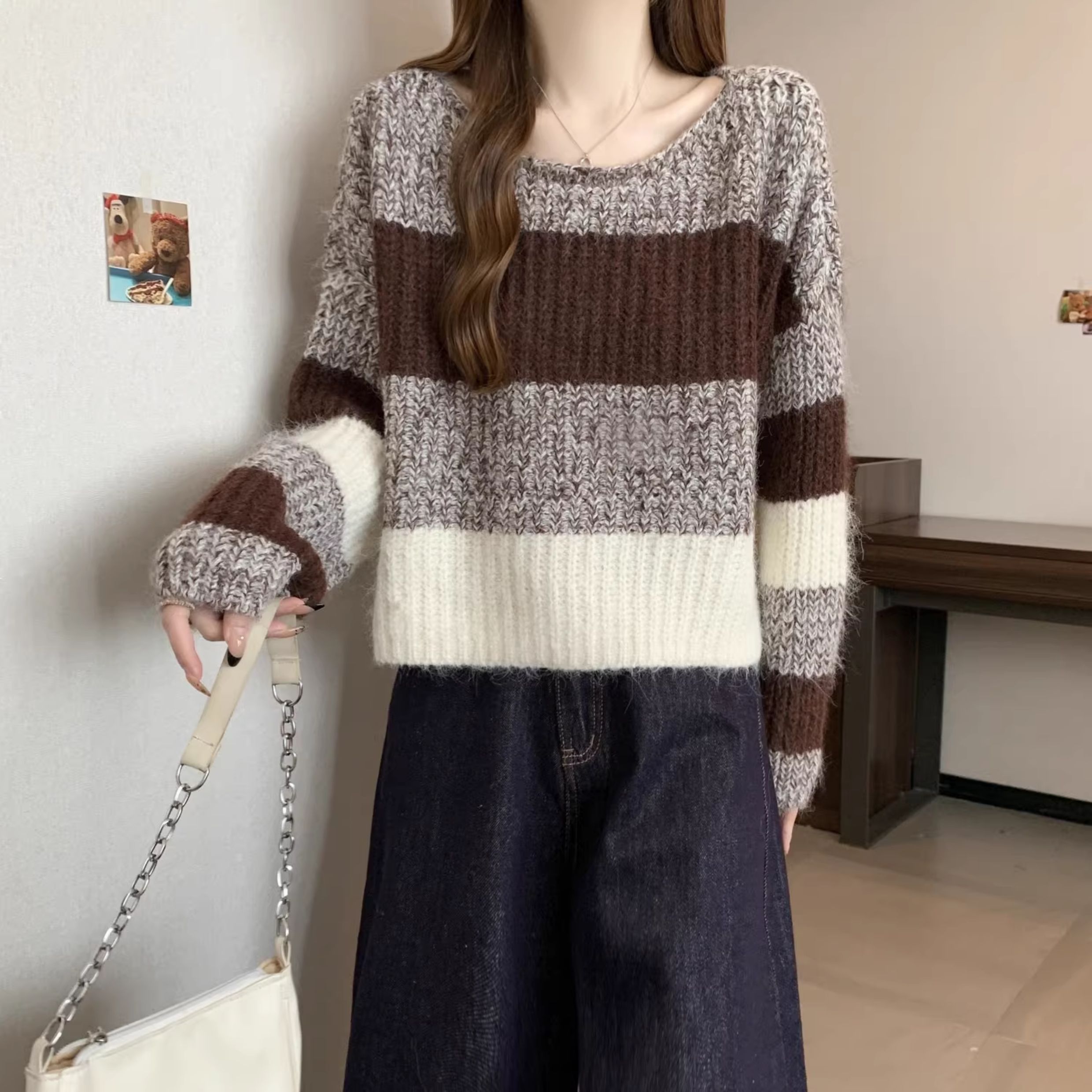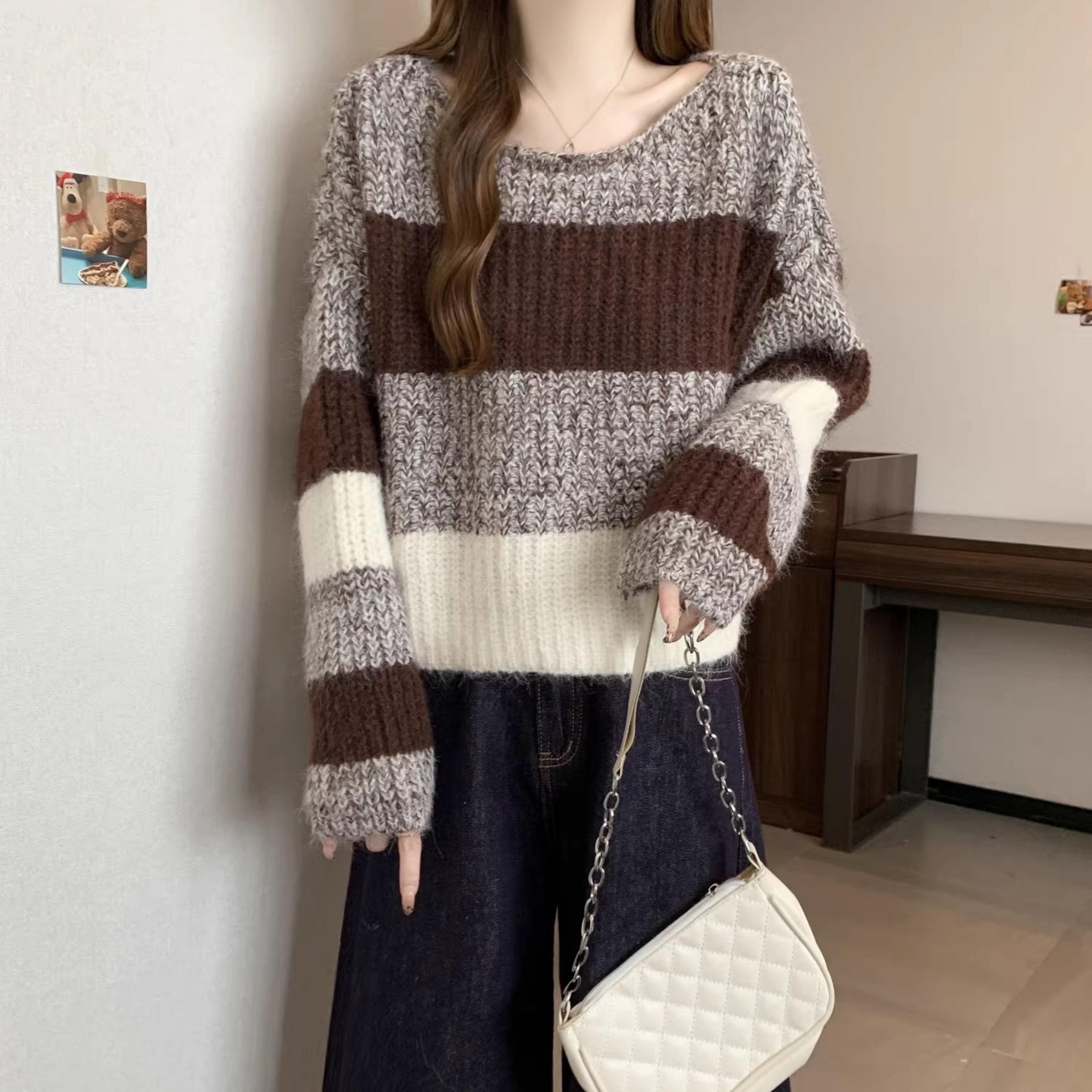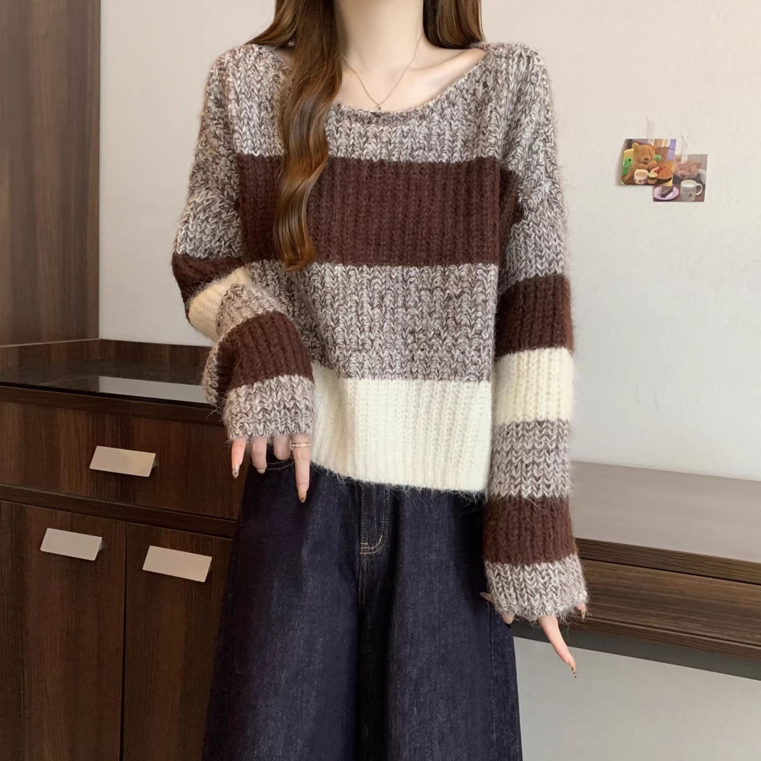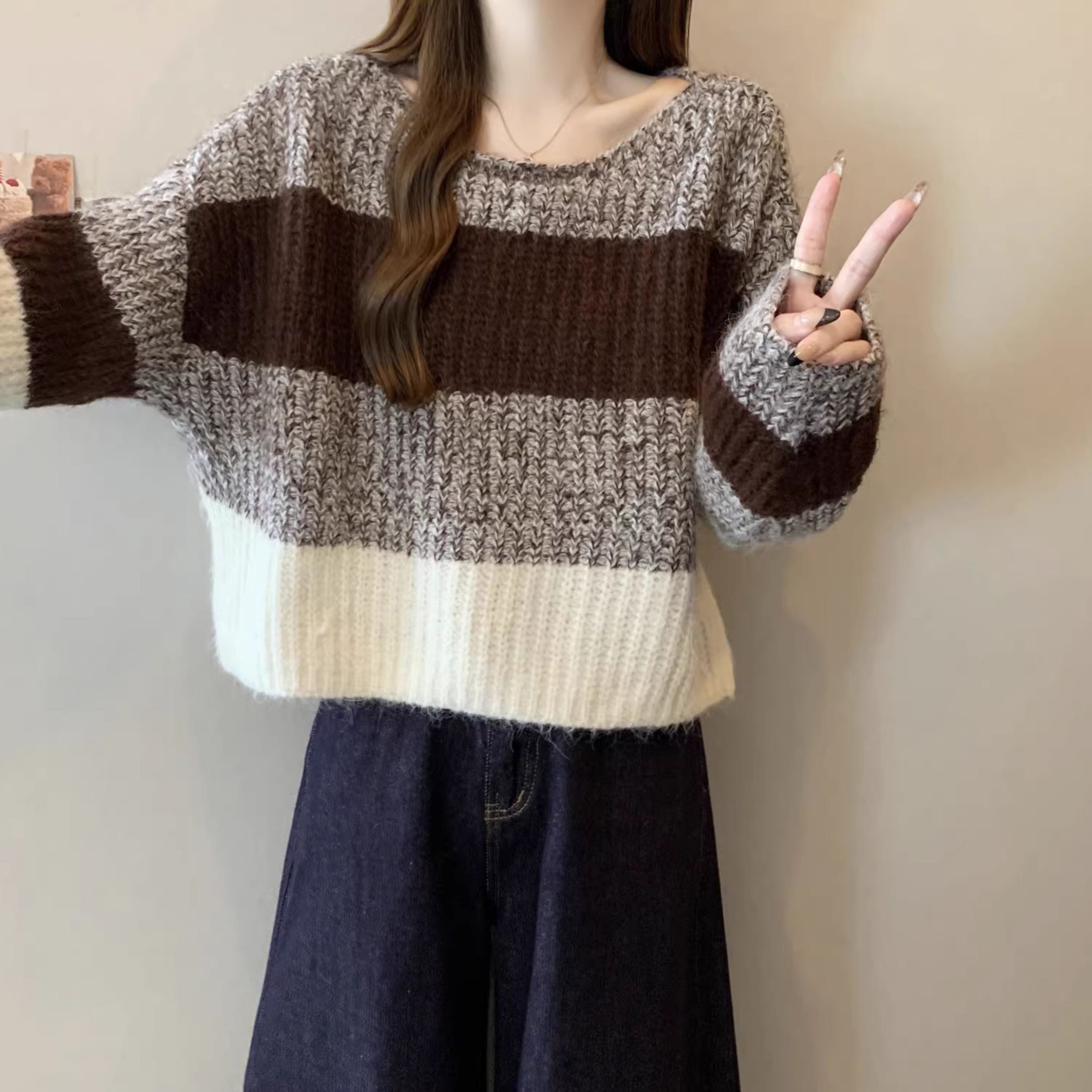 2025秋冬款高級感紅色條紋毛衣大碼女裝胖mm慵懶風套頭針織衫上衣