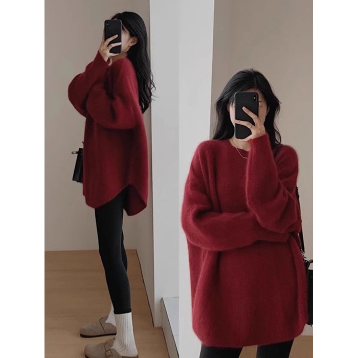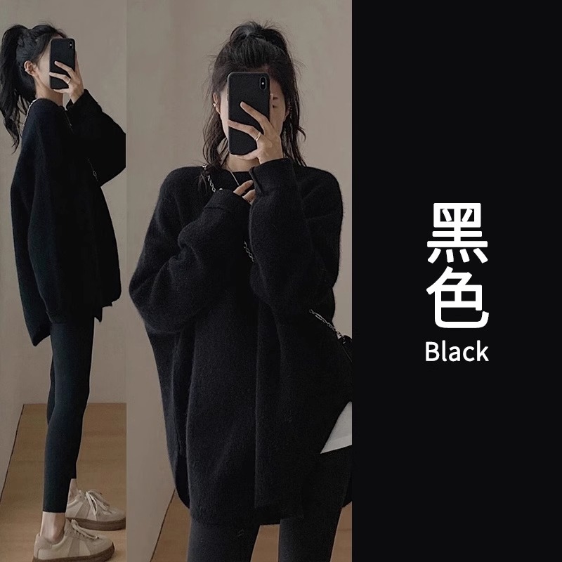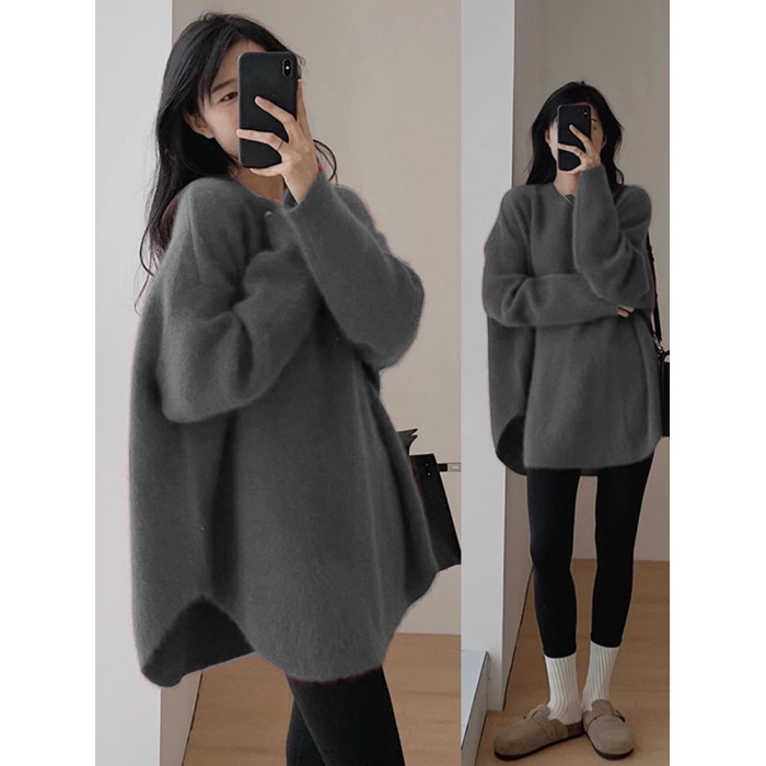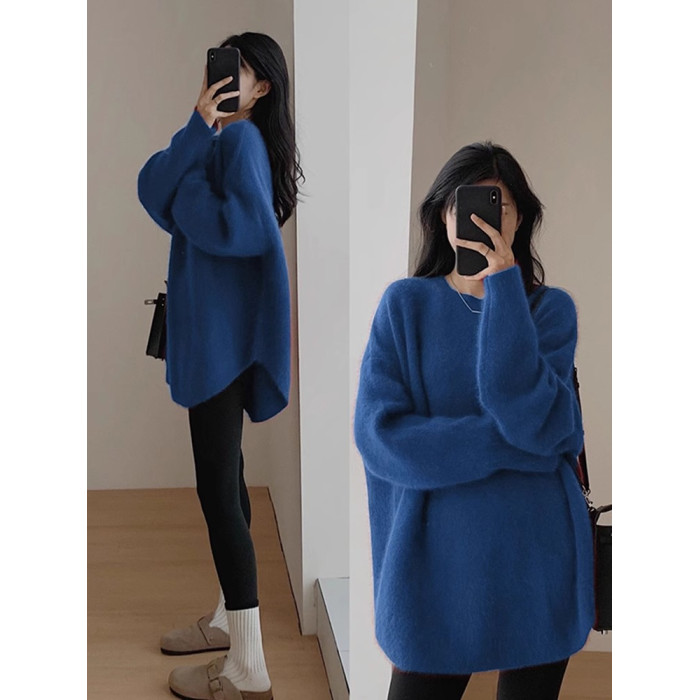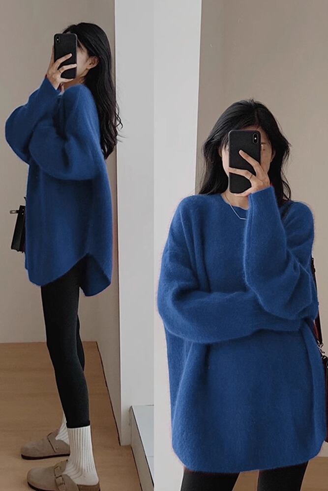 藍色中長款遮屁股針織衫毛衣慵懶風冬季穿搭鯊魚褲的搭配上衣女款