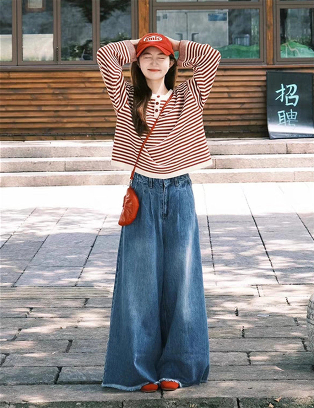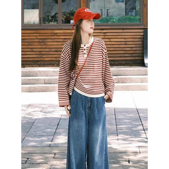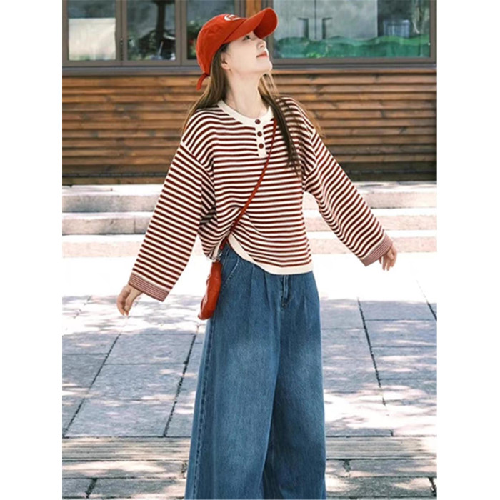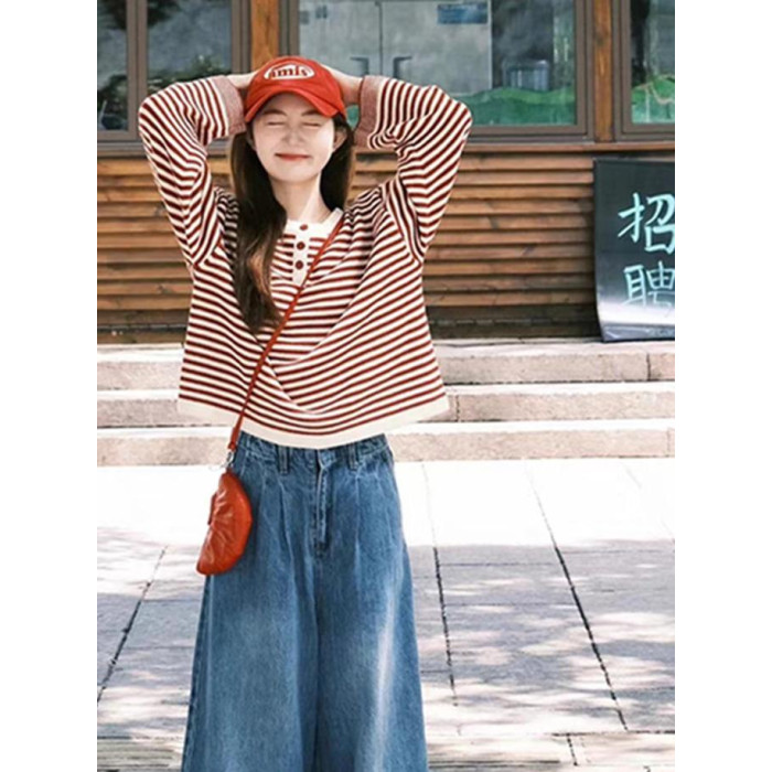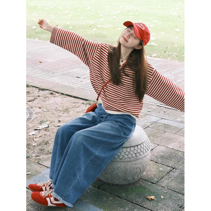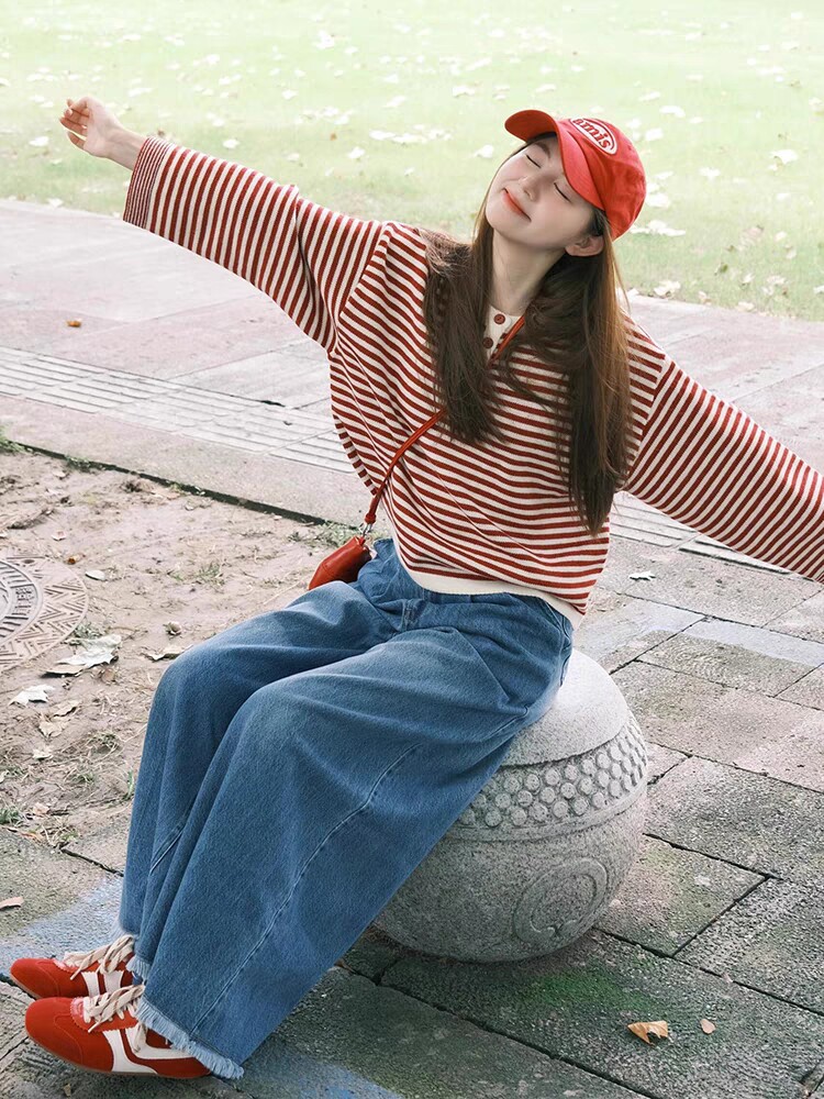 撞色條紋紅色毛衣女秋冬季寬松韓系慵懶風高級感針織圓領穿搭上衣