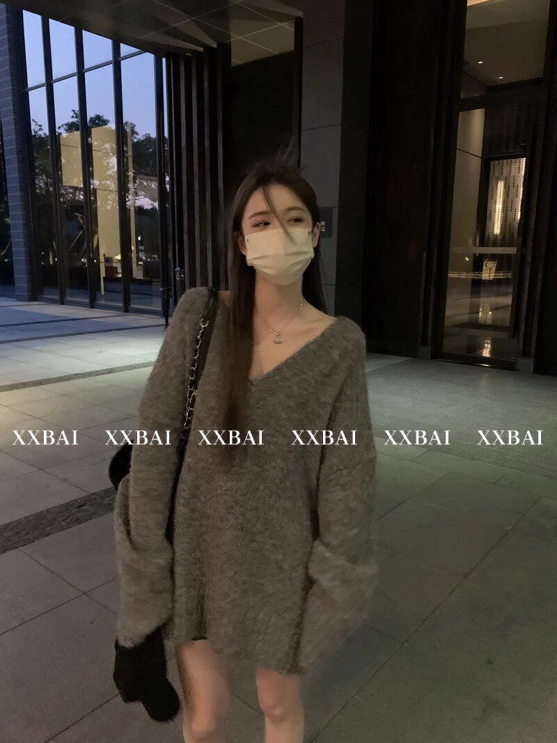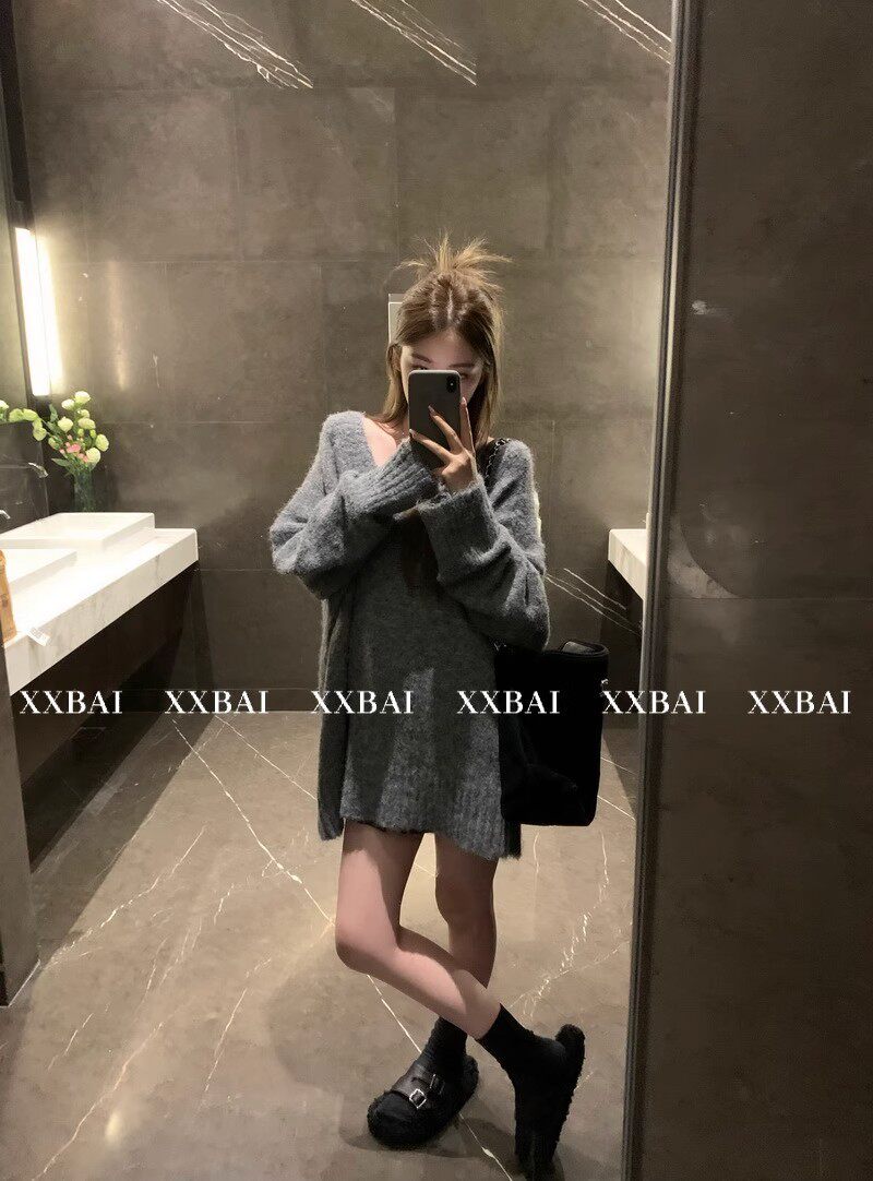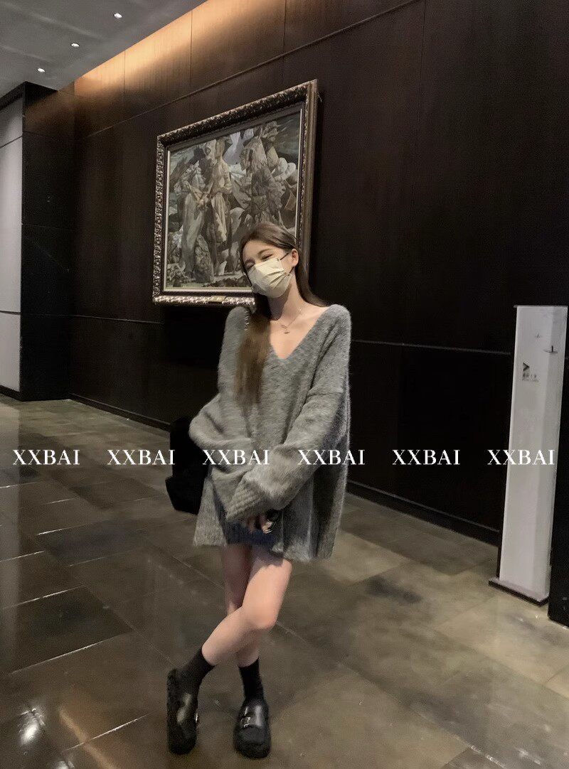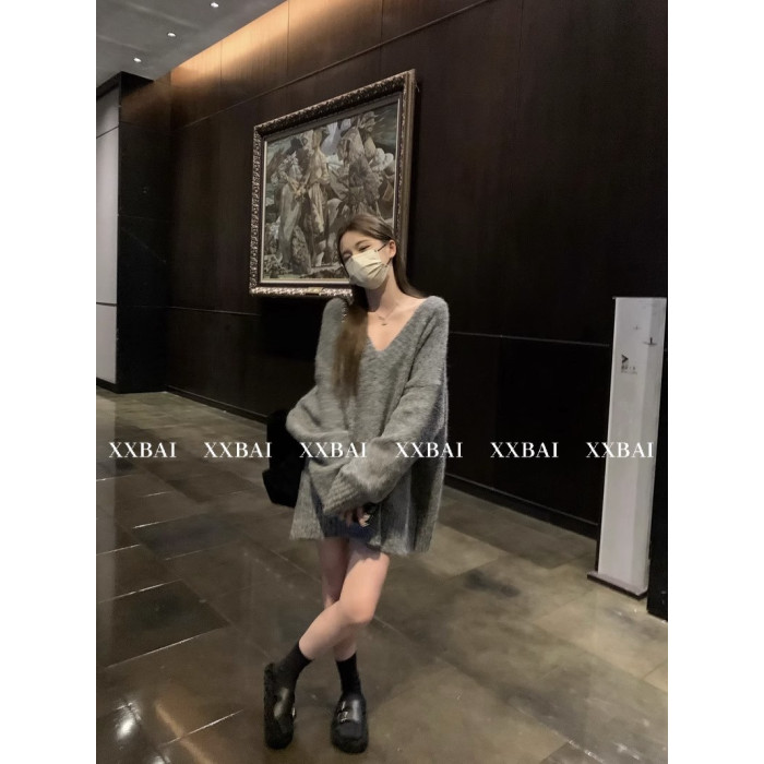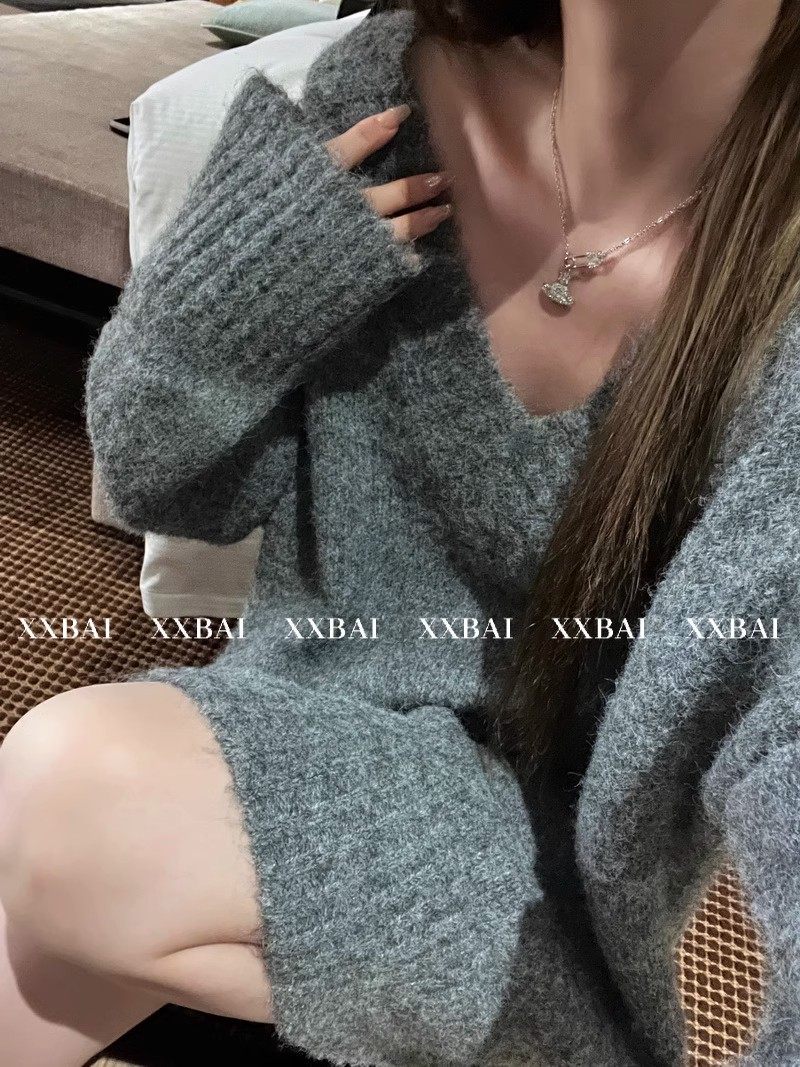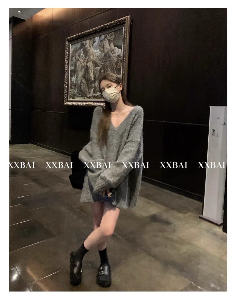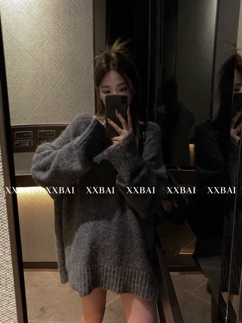 高級感慵懶風灰色v領毛衣女套頭秋冬新款寬松外穿中長款針織上衣