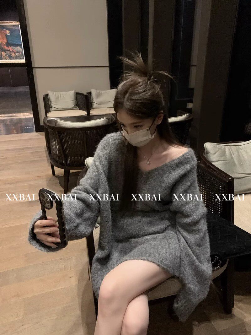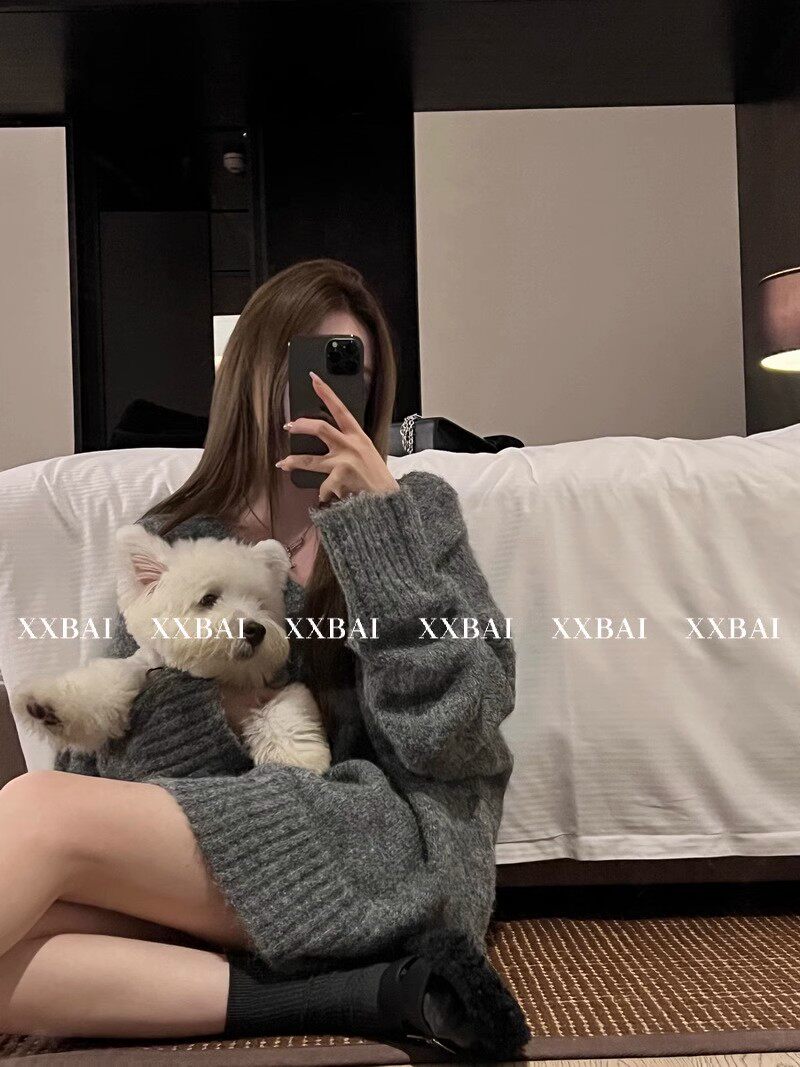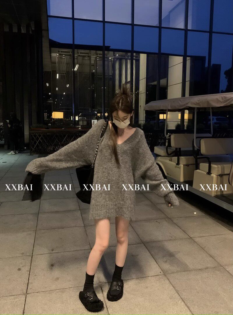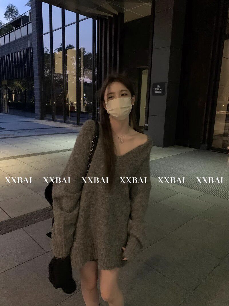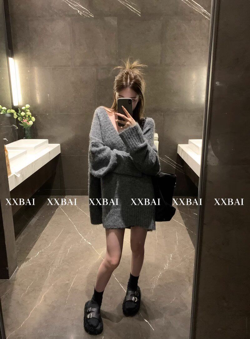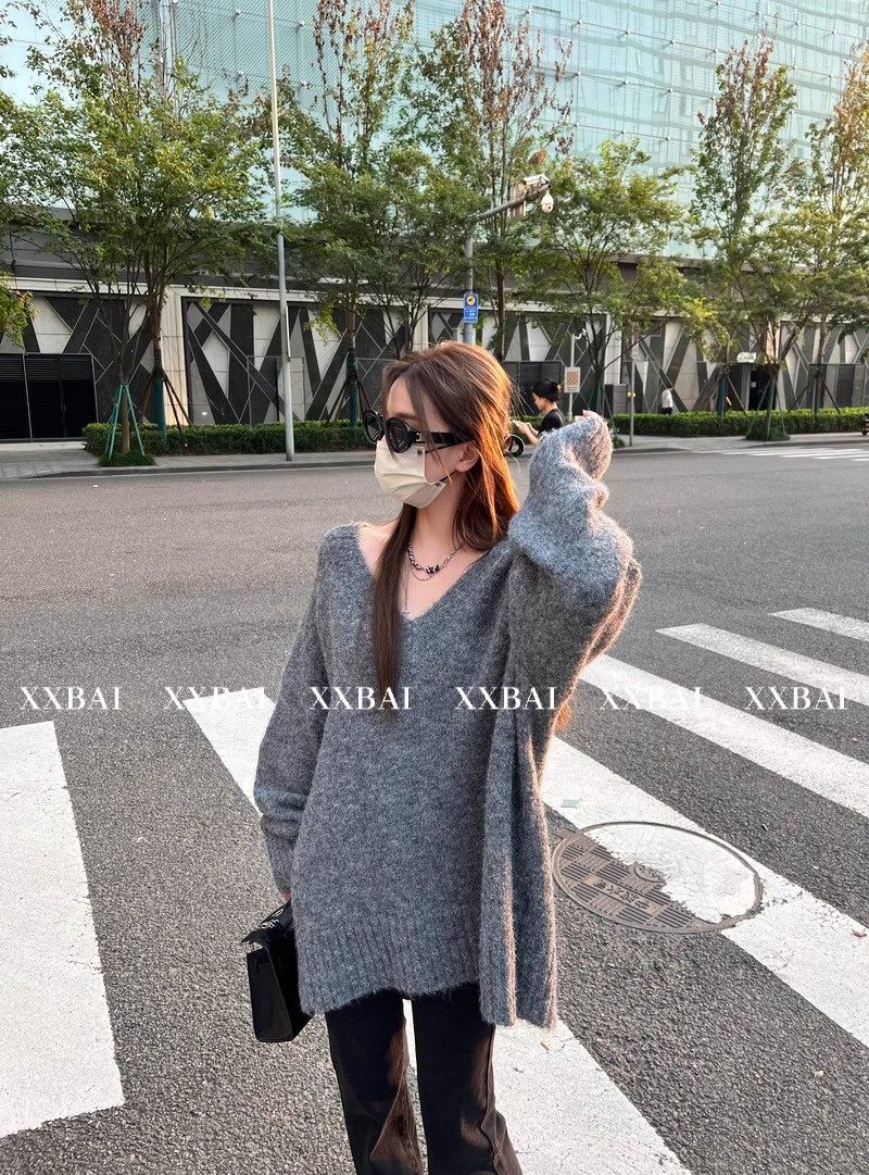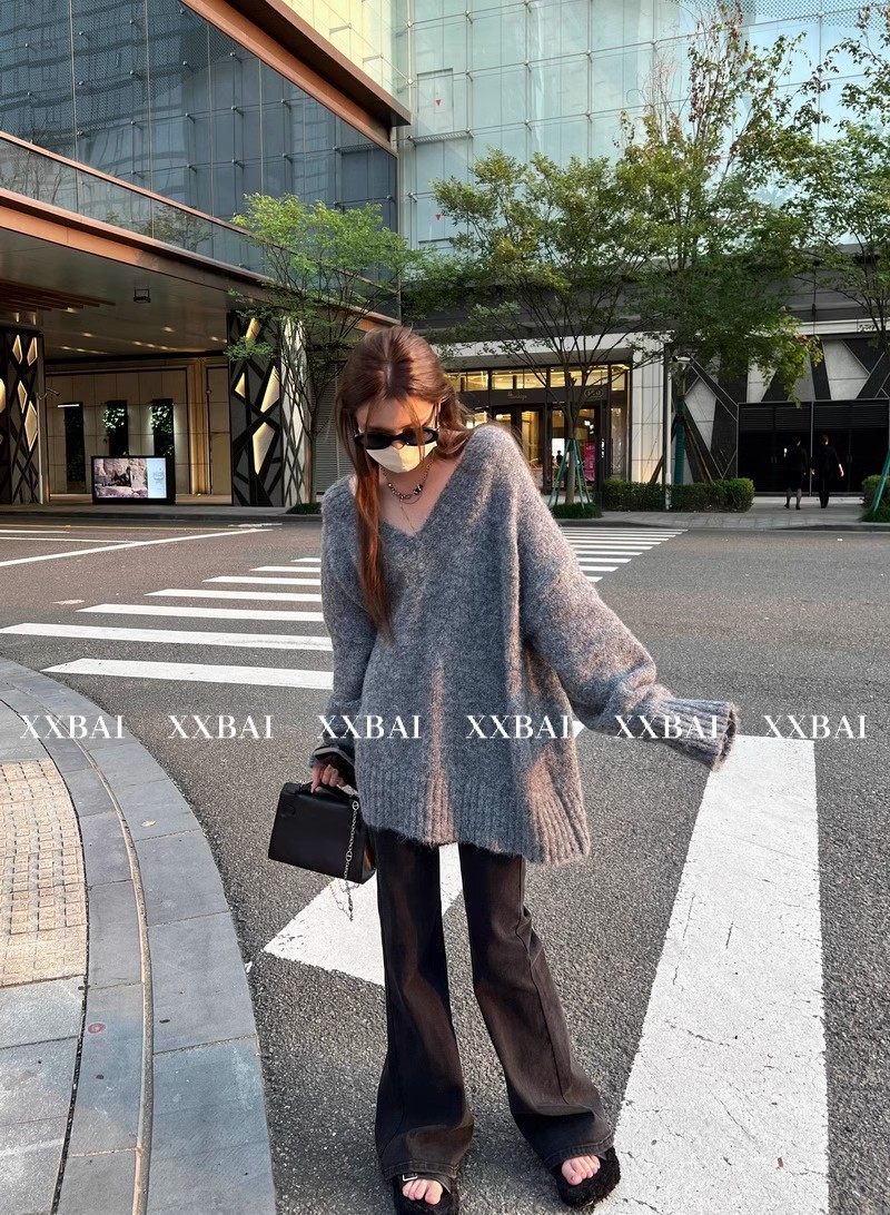 高級感慵懶風灰色v領毛衣女套頭秋冬新款寬松外穿中長款針織上衣