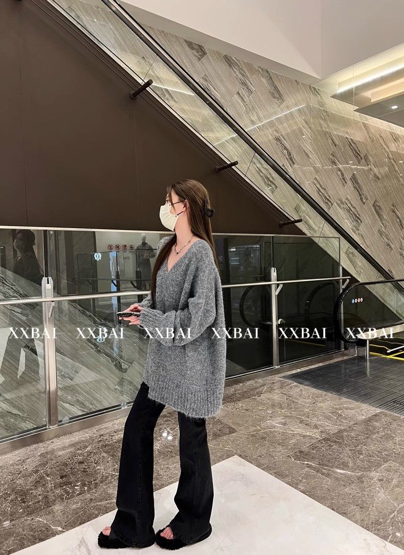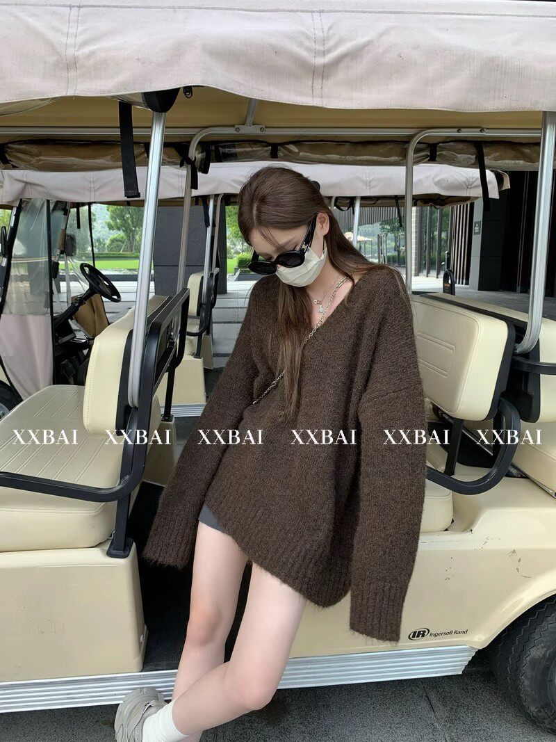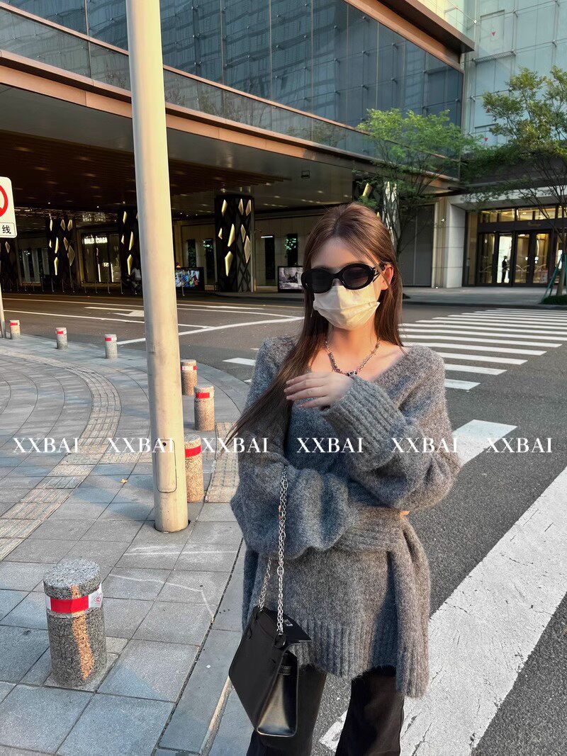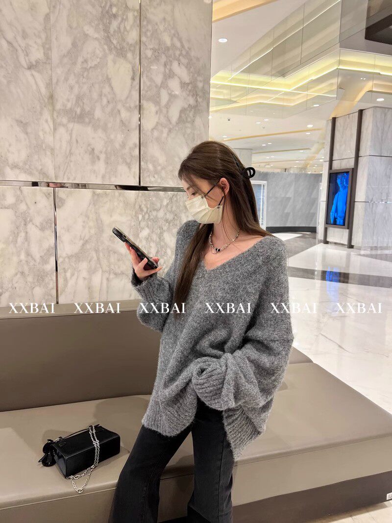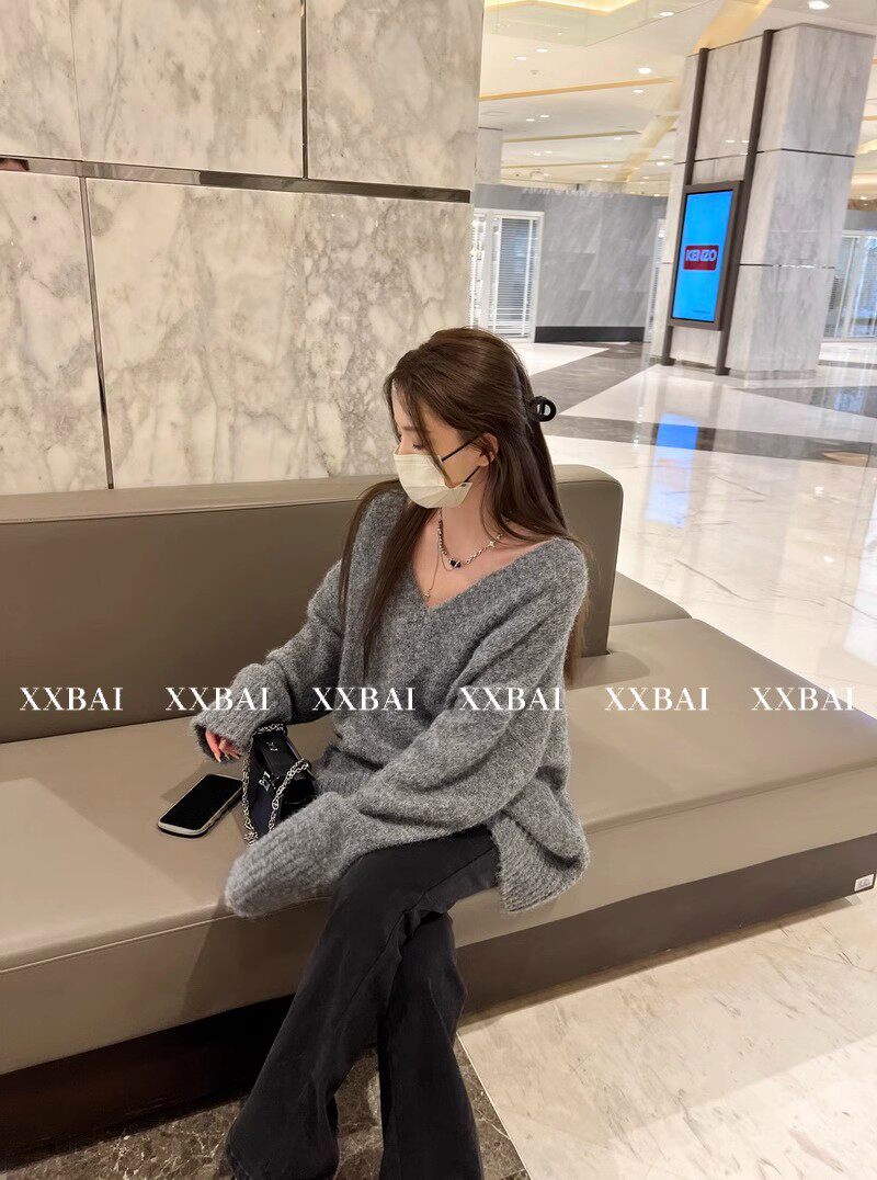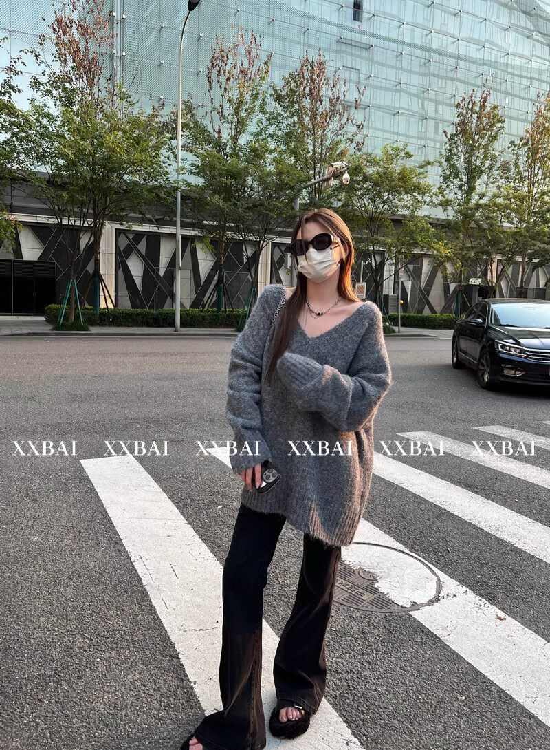 高級感慵懶風灰色v領毛衣女套頭秋冬新款寬松外穿中長款針織上衣
