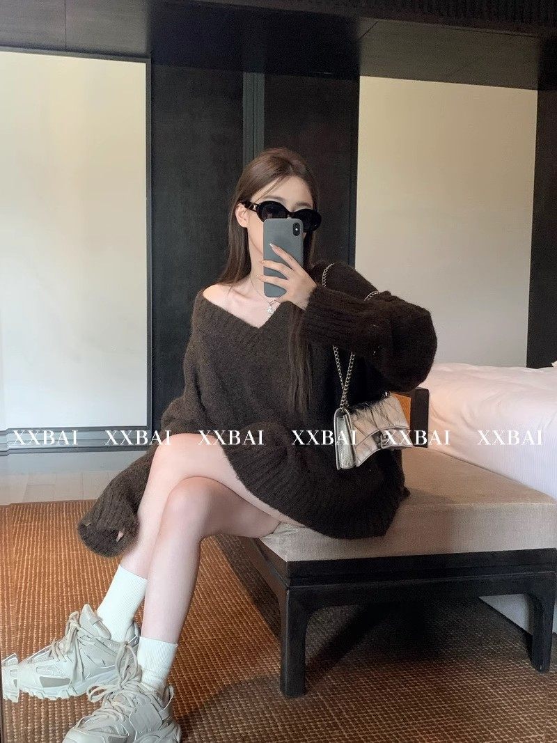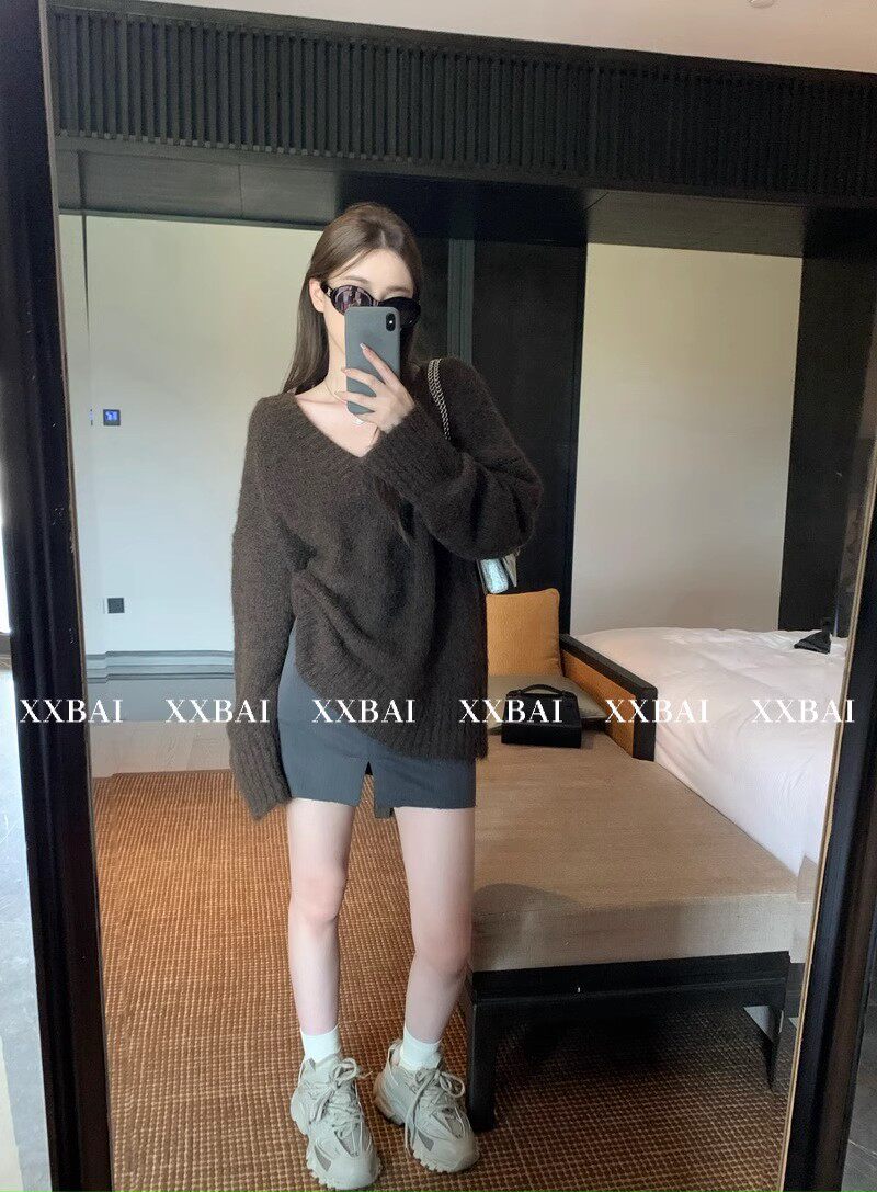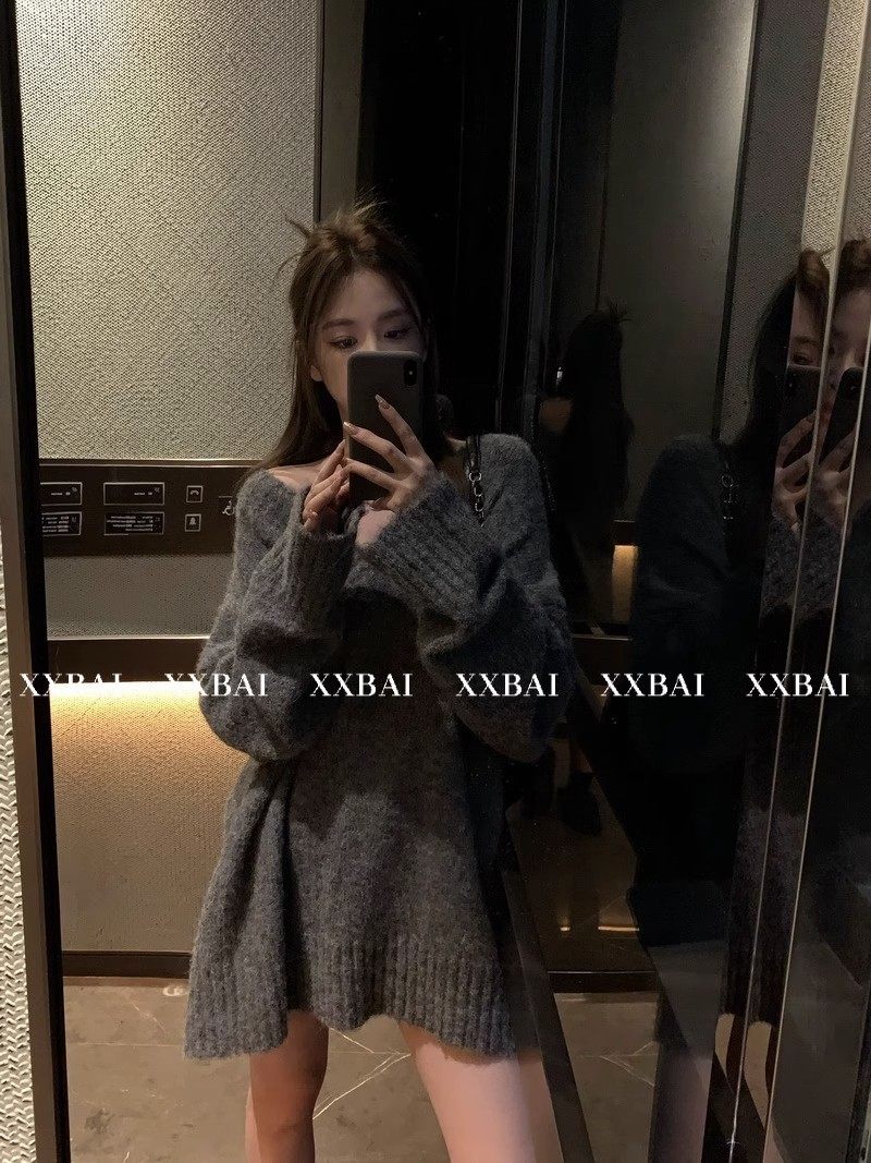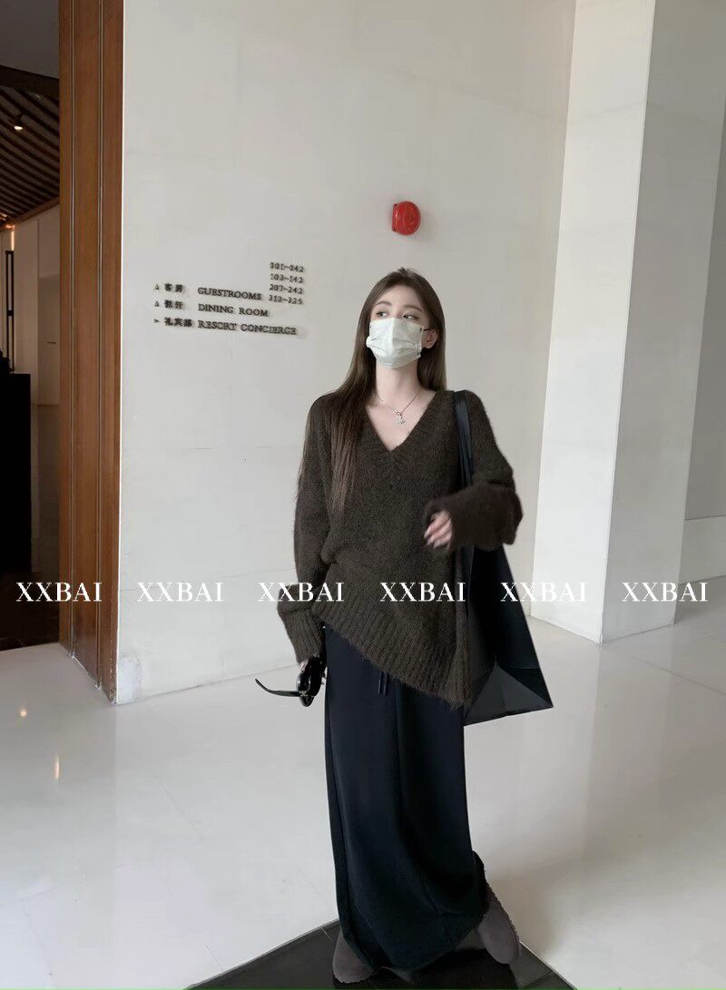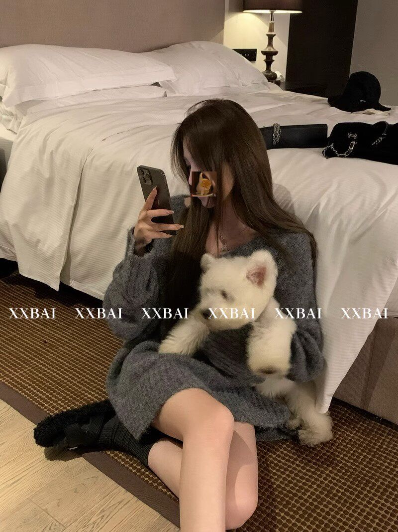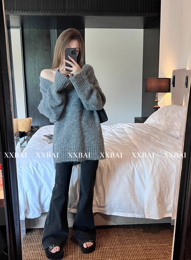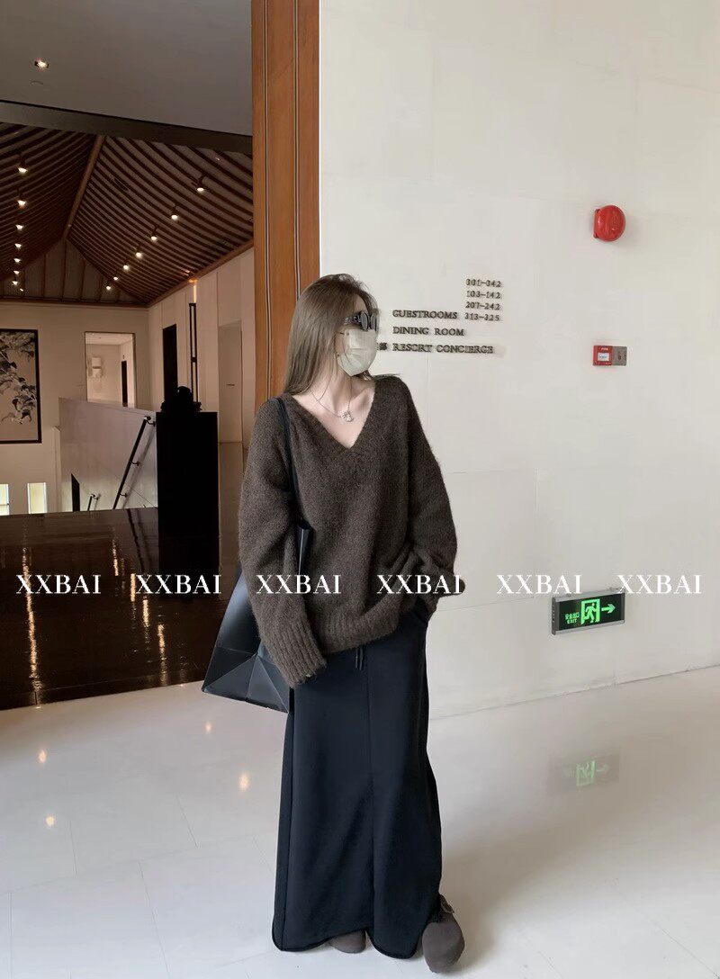 高級感慵懶風灰色v領毛衣女套頭秋冬新款寬松外穿中長款針織上衣