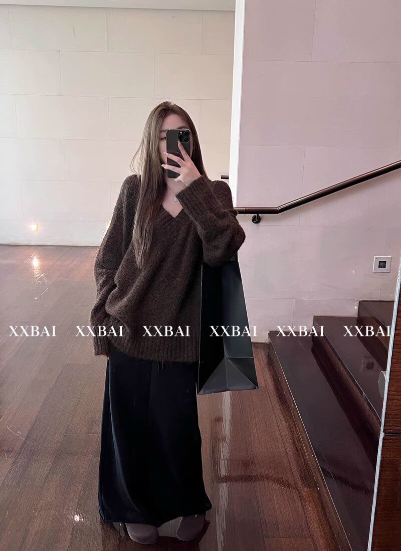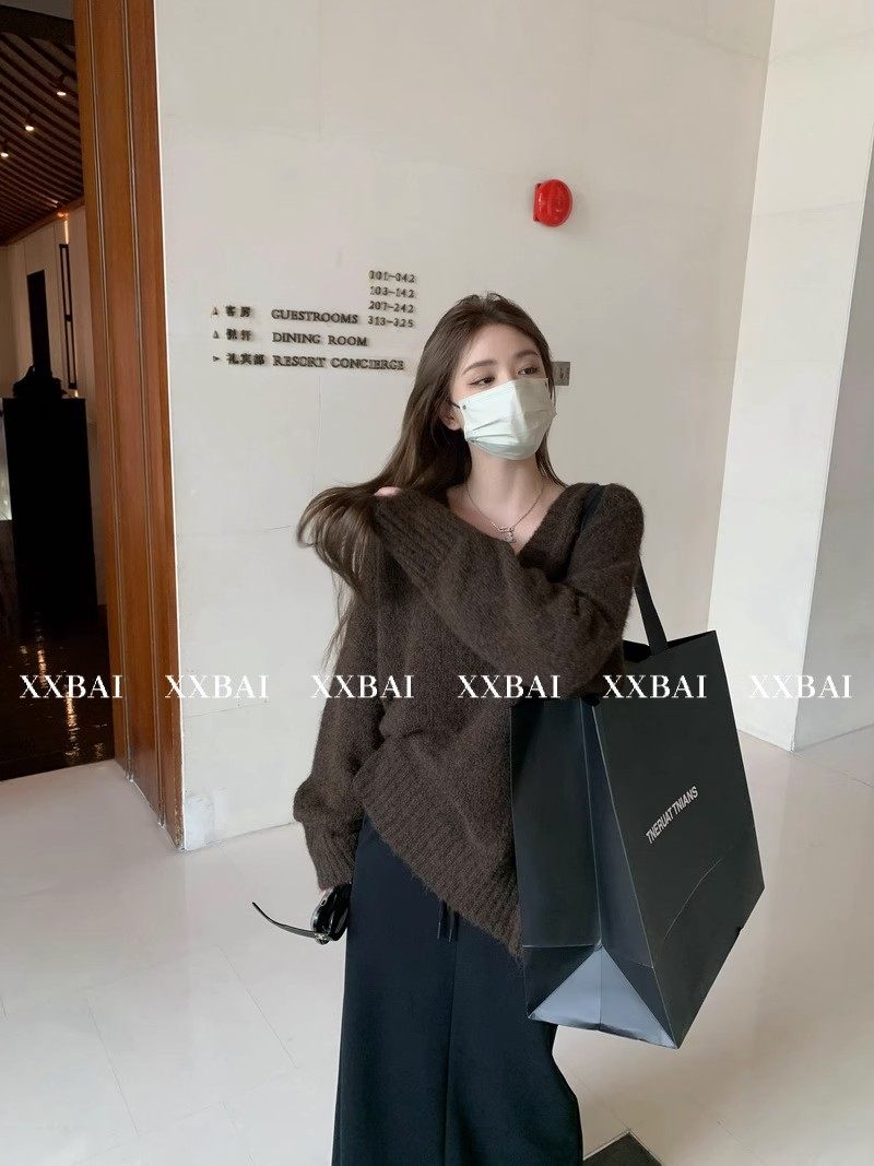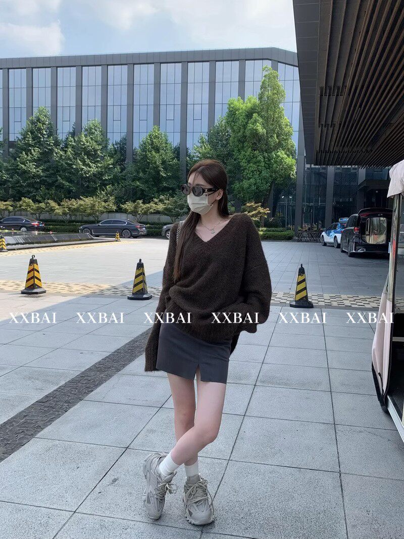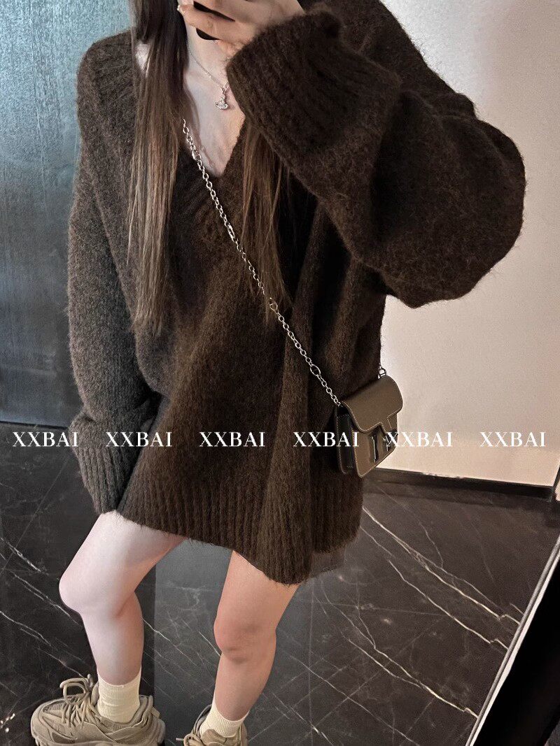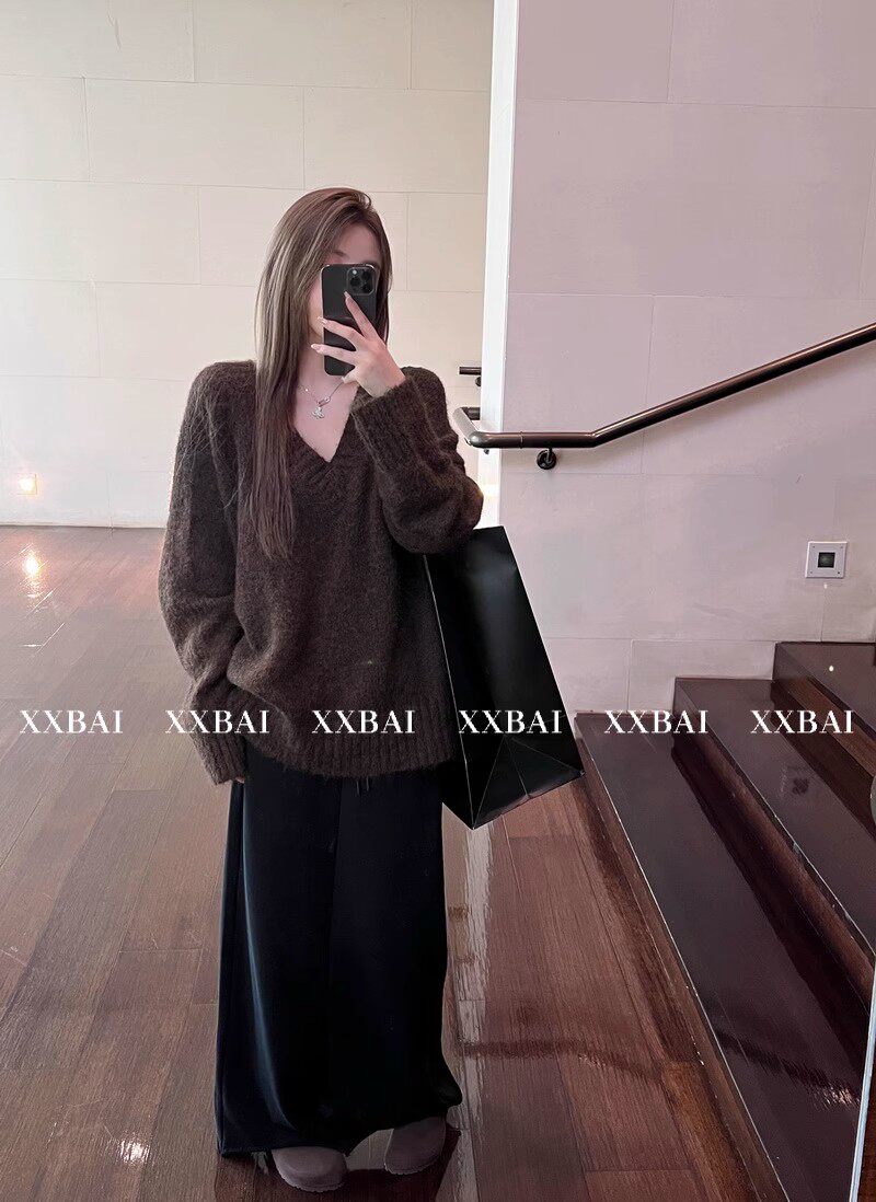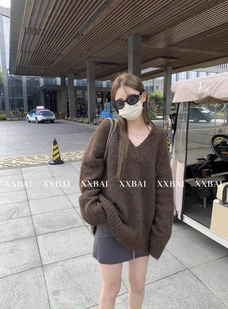 高級感慵懶風灰色v領毛衣女套頭秋冬新款寬松外穿中長款針織上衣