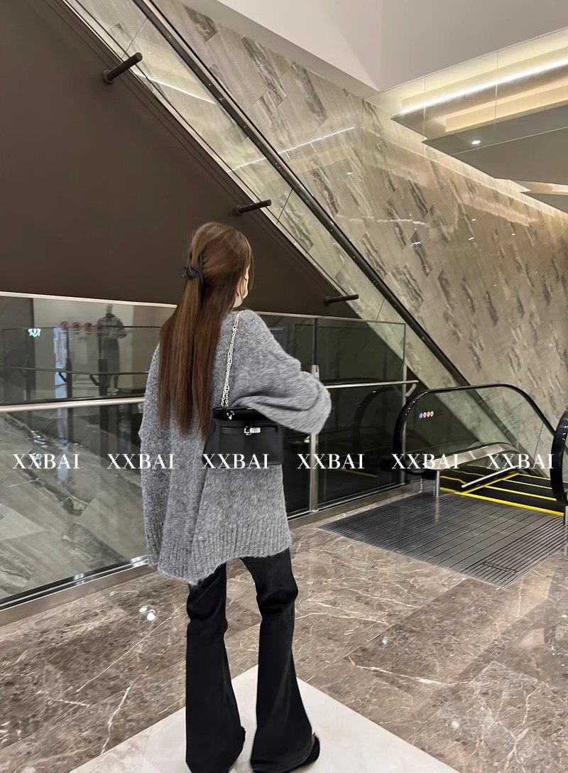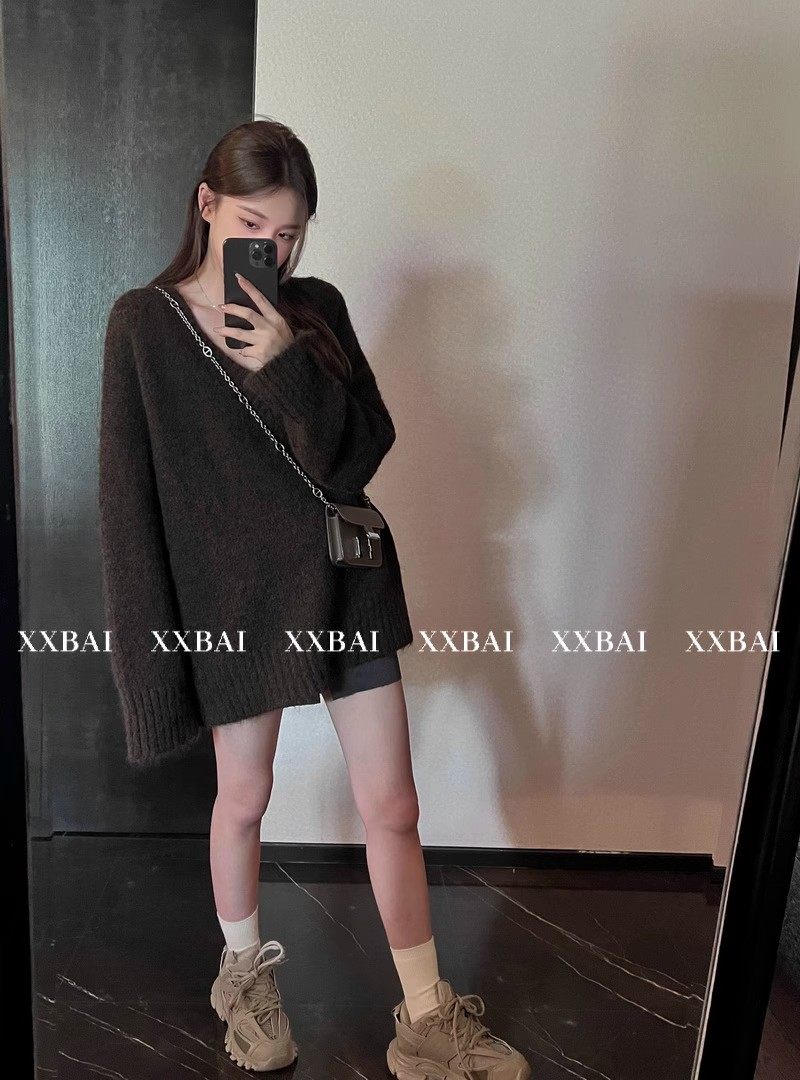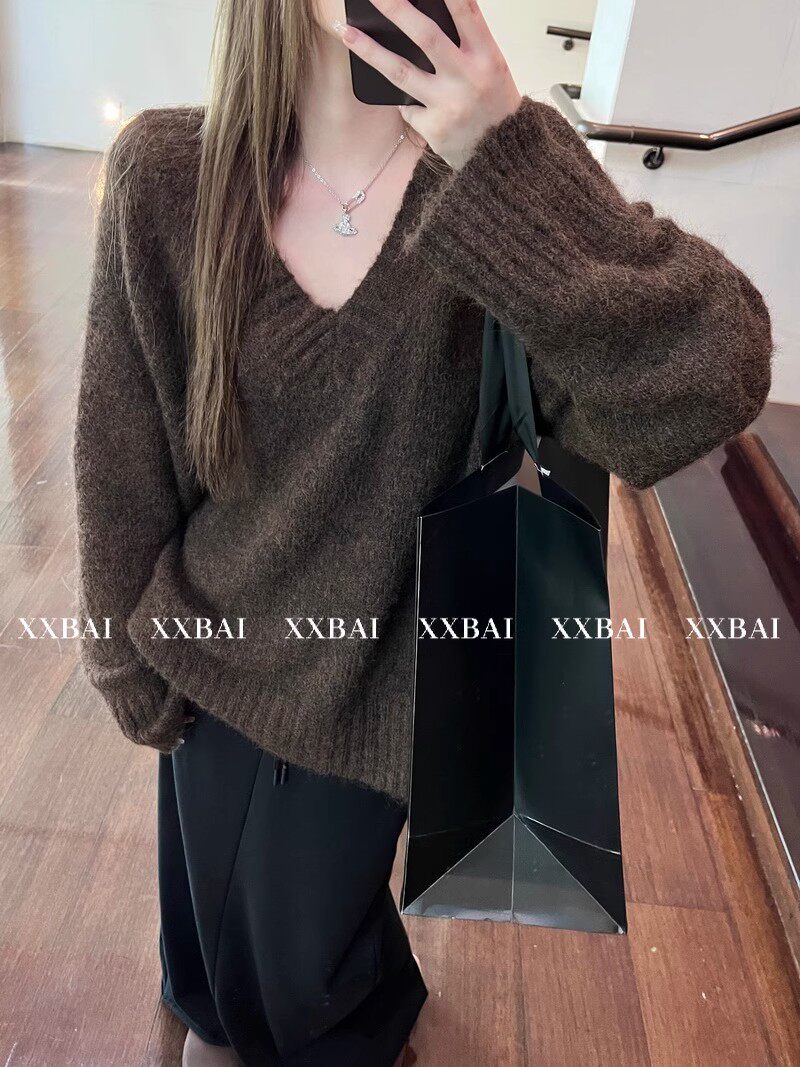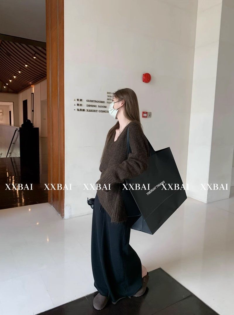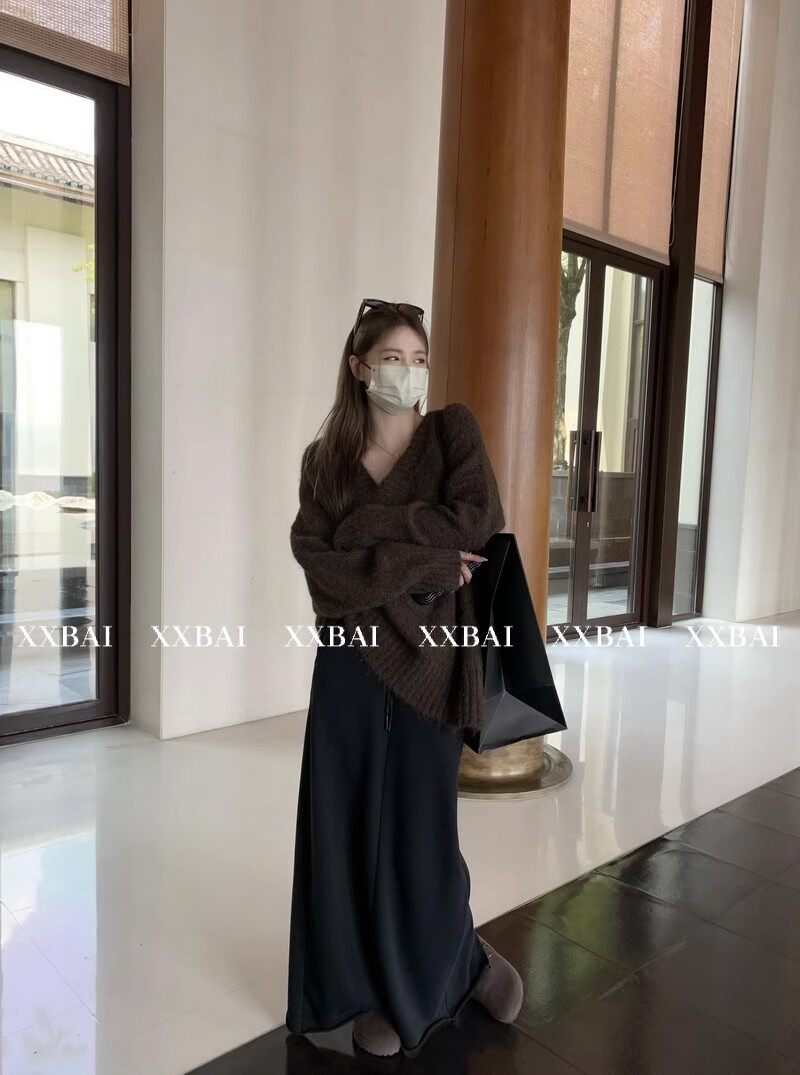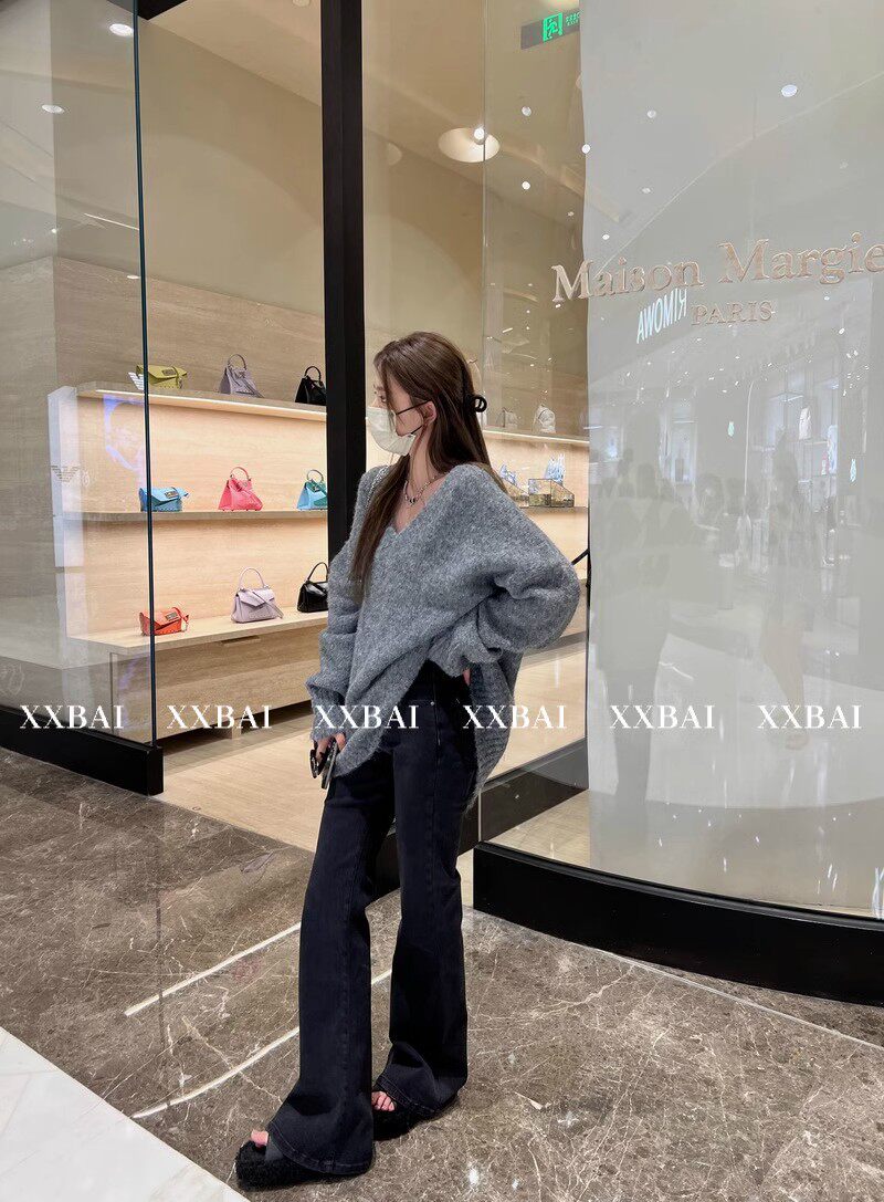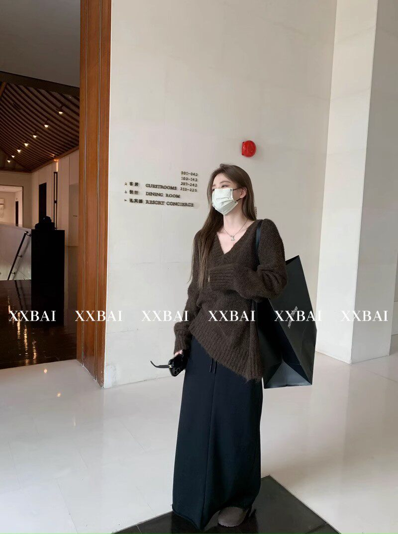 高級感慵懶風灰色v領毛衣女套頭秋冬新款寬松外穿中長款針織上衣