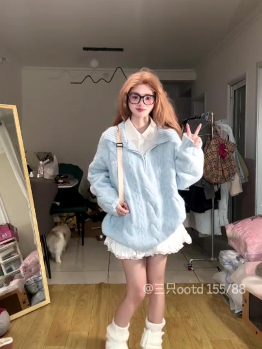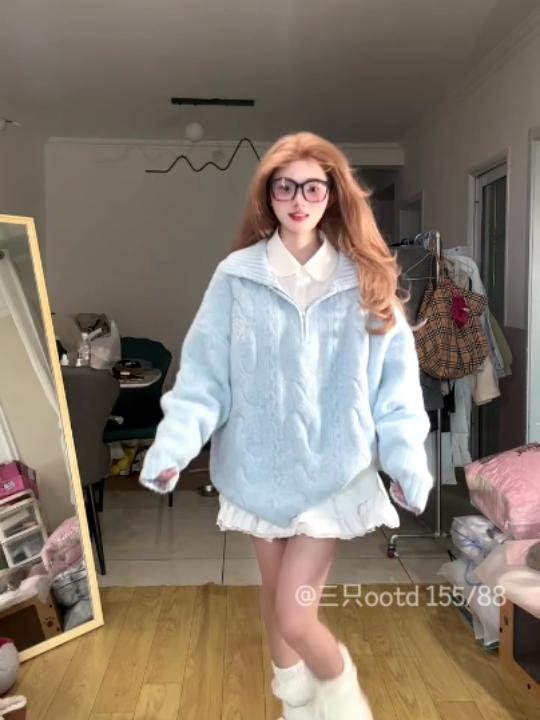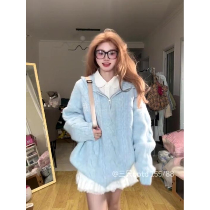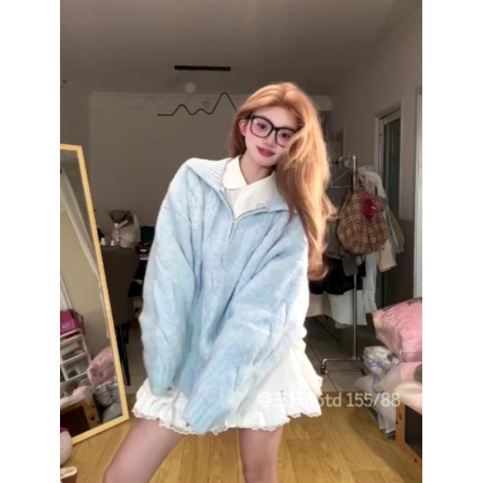 韓系慵懶風藍色奶fufu套頭毛衣女秋冬學院風穿搭寬松加厚針織上衣