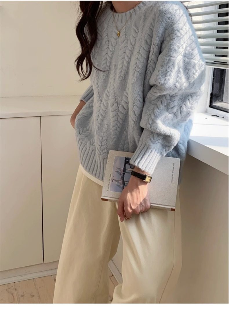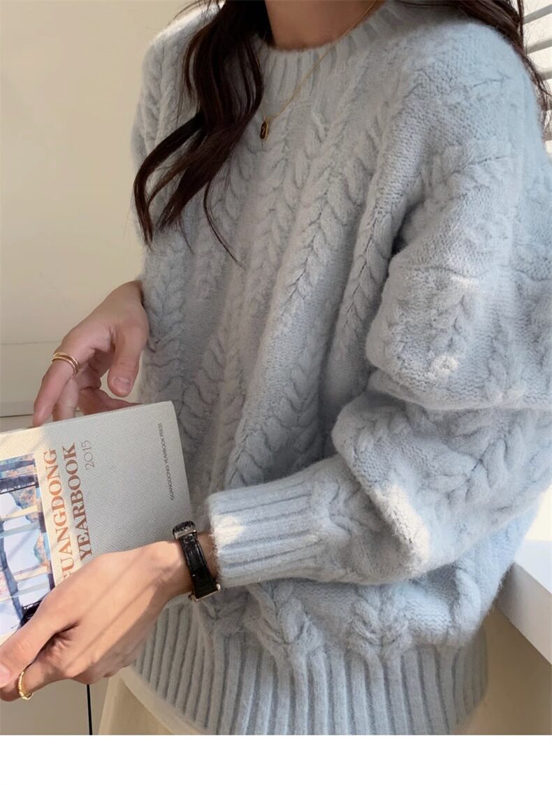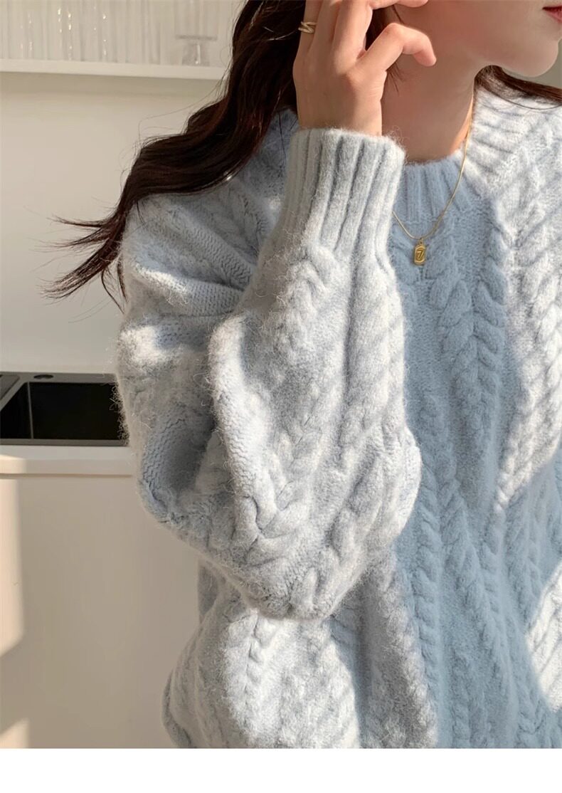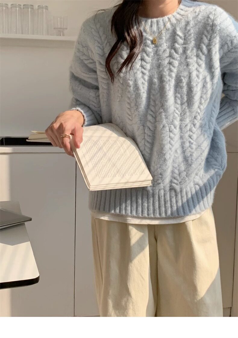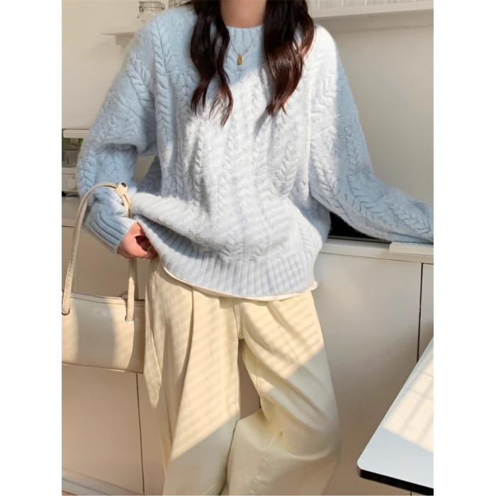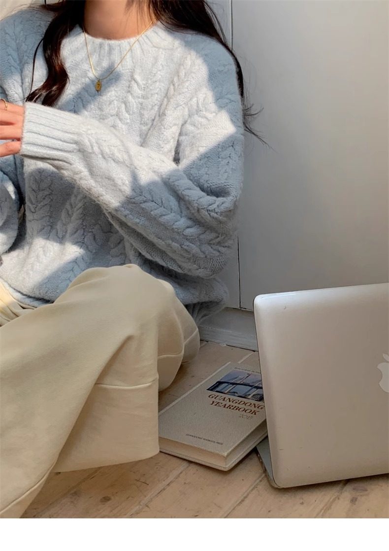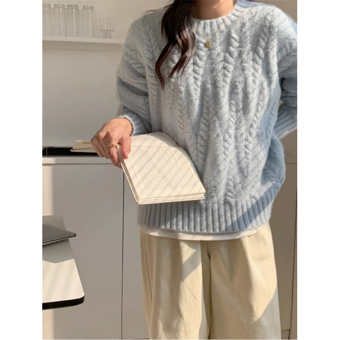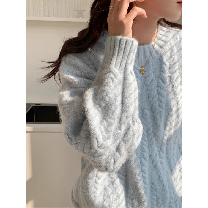 奶藍色慵懶風麻花毛衣女秋冬2025新款加厚高級感內搭套頭針織上衣