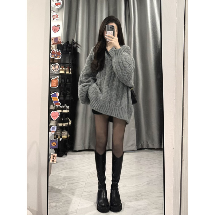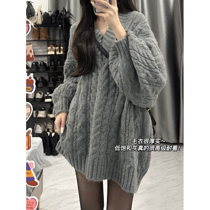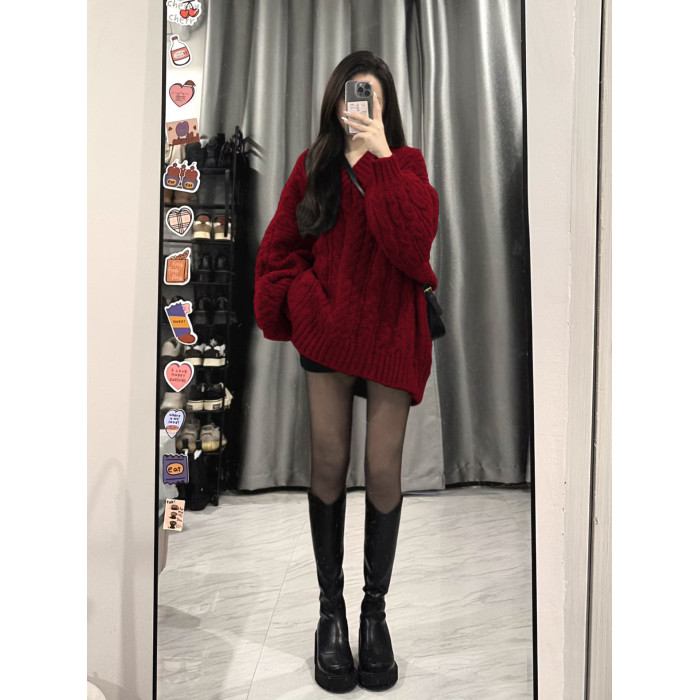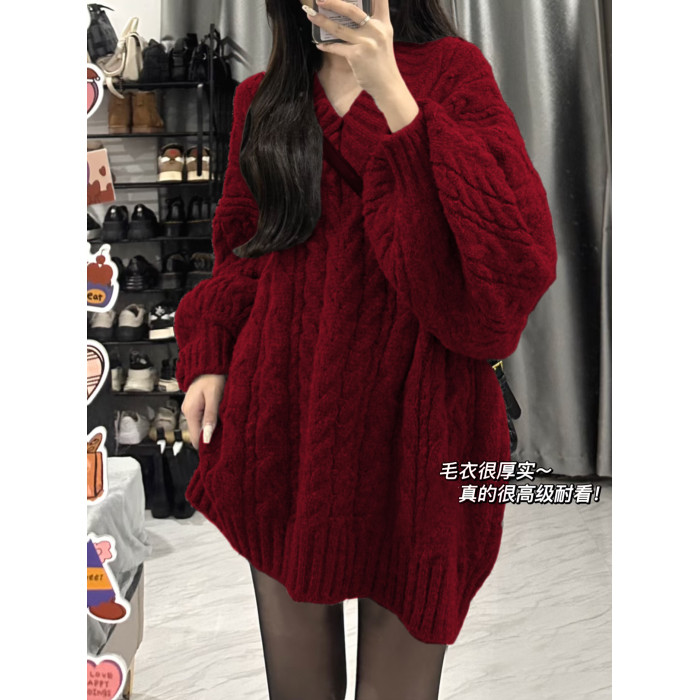 大碼胖MM復古V領酒紅色麻花毛衣女秋冬慵懶軟糯寬松百搭針織上衣