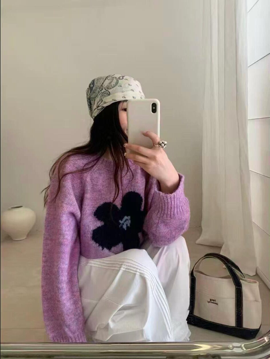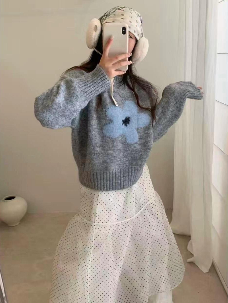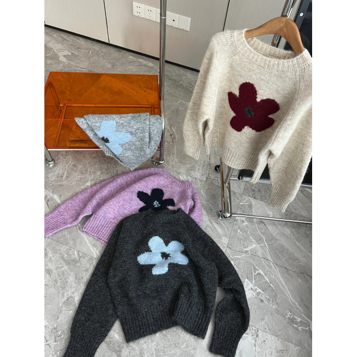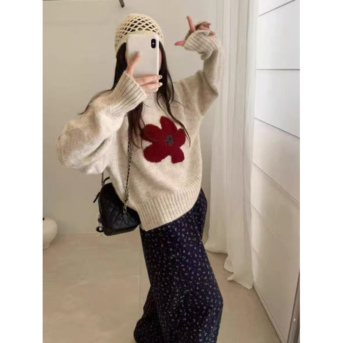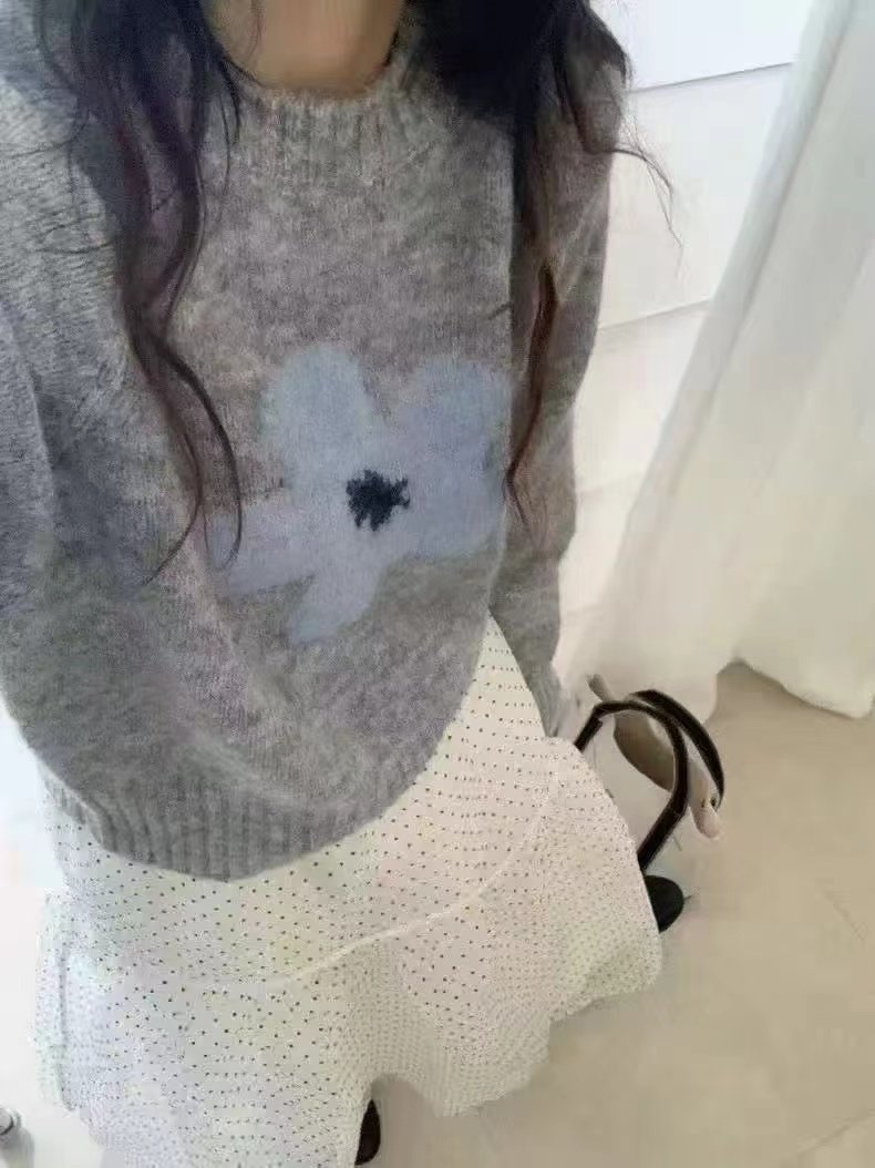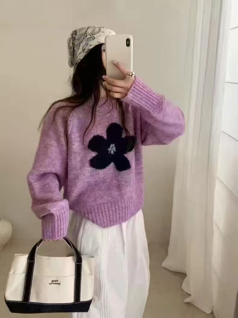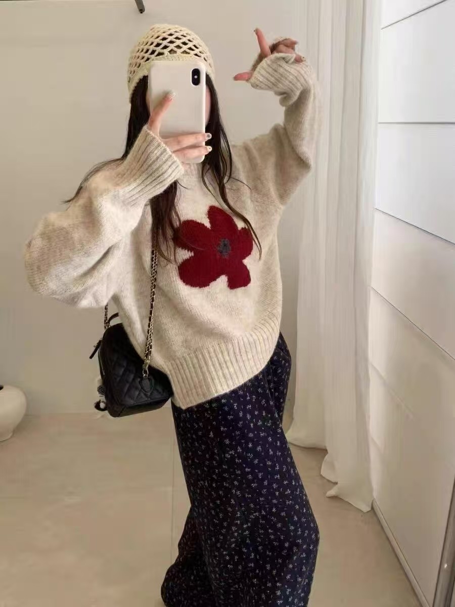 韓系花朵提花圓領毛衣女2025秋冬寬松洋氣短款套頭毛針織衫上衣潮